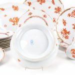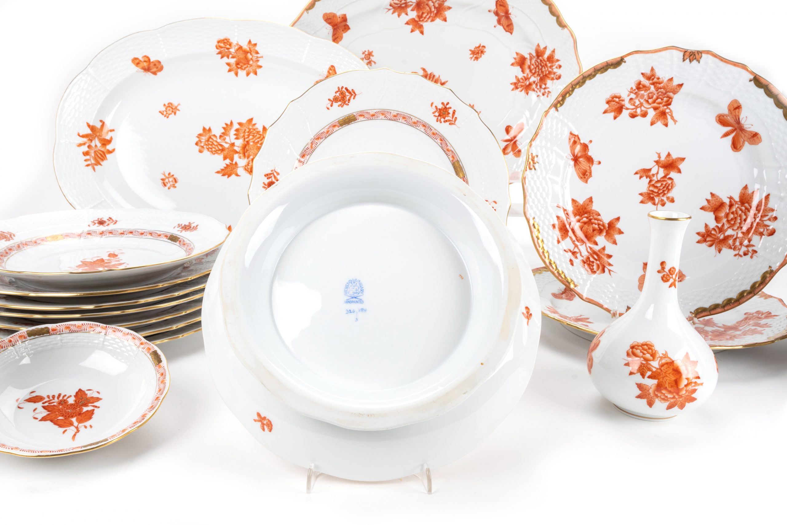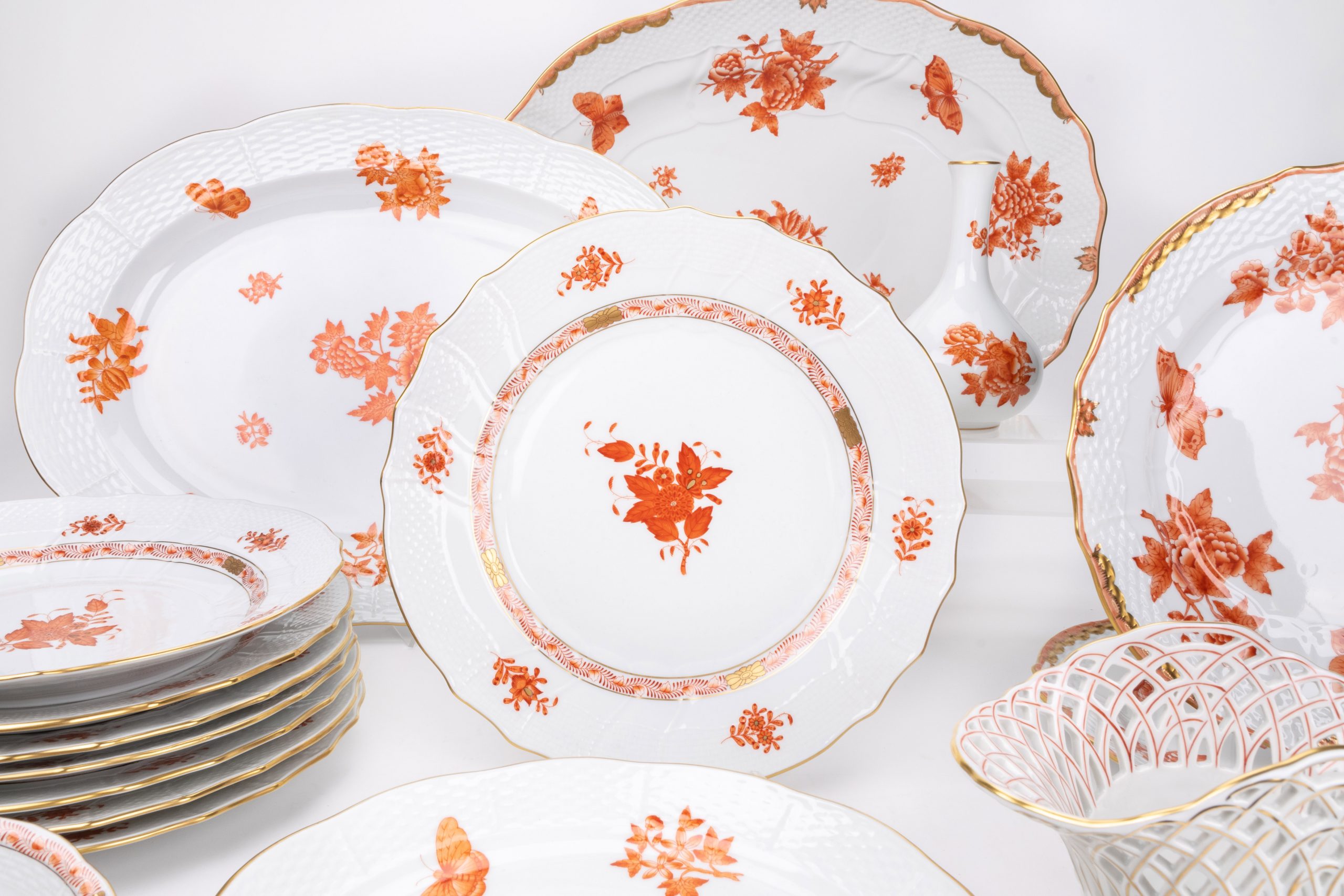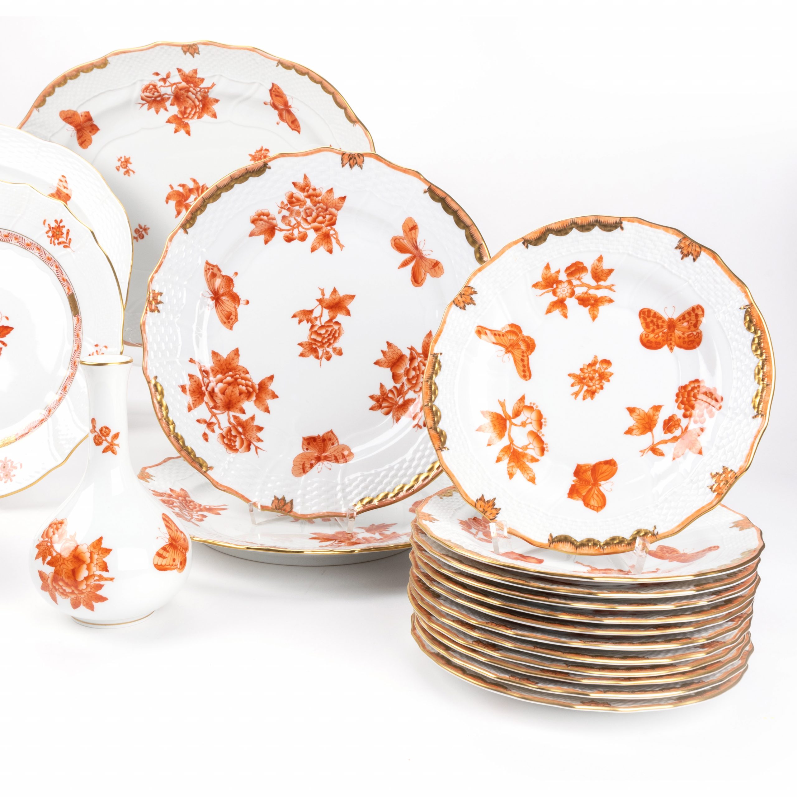 28-tlg., Herend, Ungarn, 20. Jh., Porzellan, weiß, orange bemalt, gold staffiert, darunter im Dekor 'Apponyi orange': 1 große ovale Platte, Länge 42,5 cm, 1 große ovale Platte, Länge 42 cm, 1 Teller, ø 26 cm, 1 Teller, ø 27,5 cm, 1 Fingerschale, Höhe 3 cm und 1 Teller ø 14 cm, 1 Konfektschale mit Durchbruchrand, Höhe 12 cm, 1 kleine Langhalsvase, Höhe 16 cm, 6 Speiseteller, ø 25,5, cm, 1 Gebäckteller, ø 25 cm, sowie im Dekor 'Königin Victoria orange': 12 Kuchenteller, ø 17,5 cm, 1 Gebäckteller auf Standfuß, ø 23,5 cm , weiterer 1 Gebäckteller unterseitig Manufakturmarke, Malernummer und Modellnummer, teilweise mit Schleifstrichen, partiell minimal berieben, die Malerei einer Platte berieben, Zustand A/B