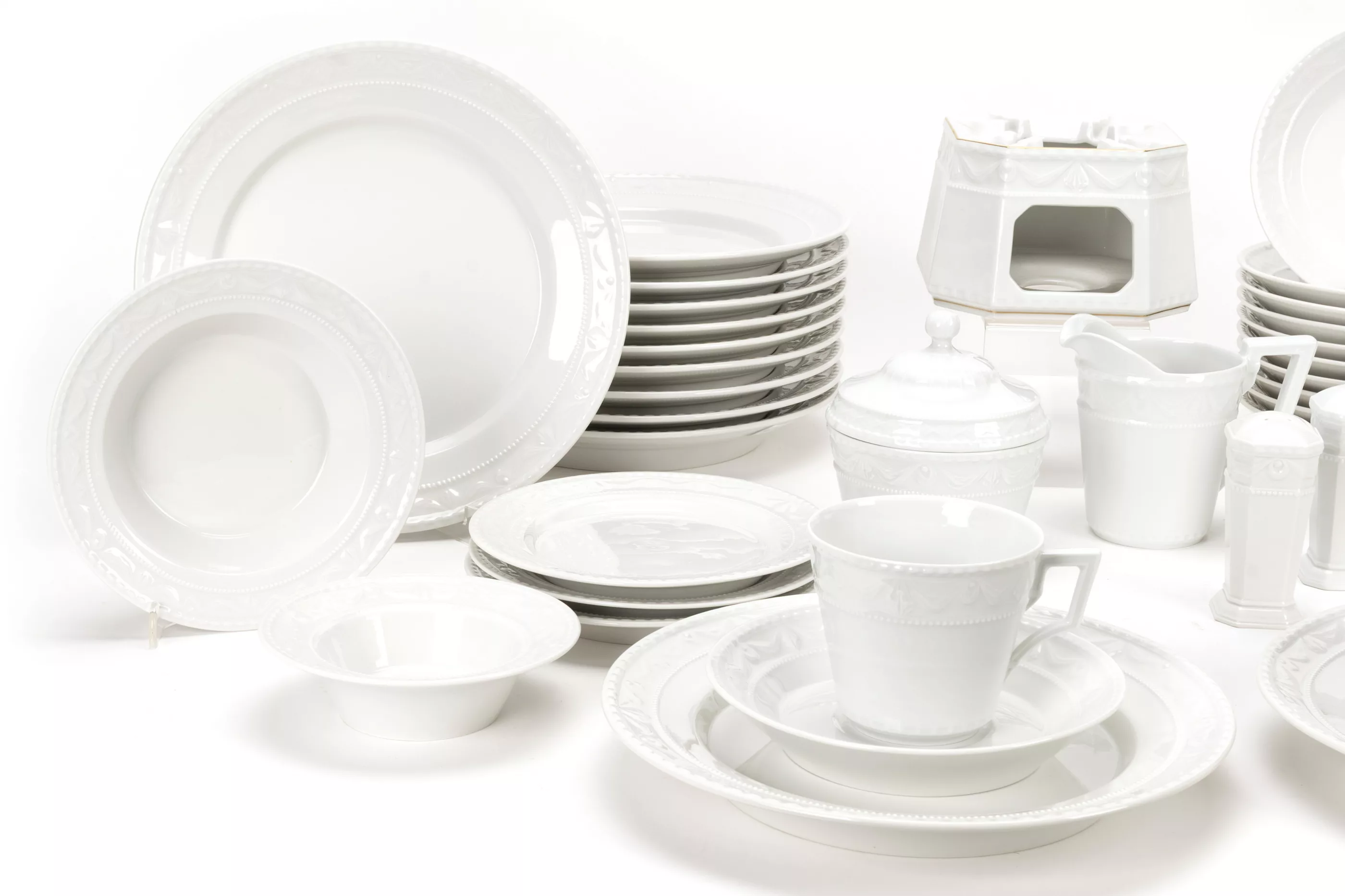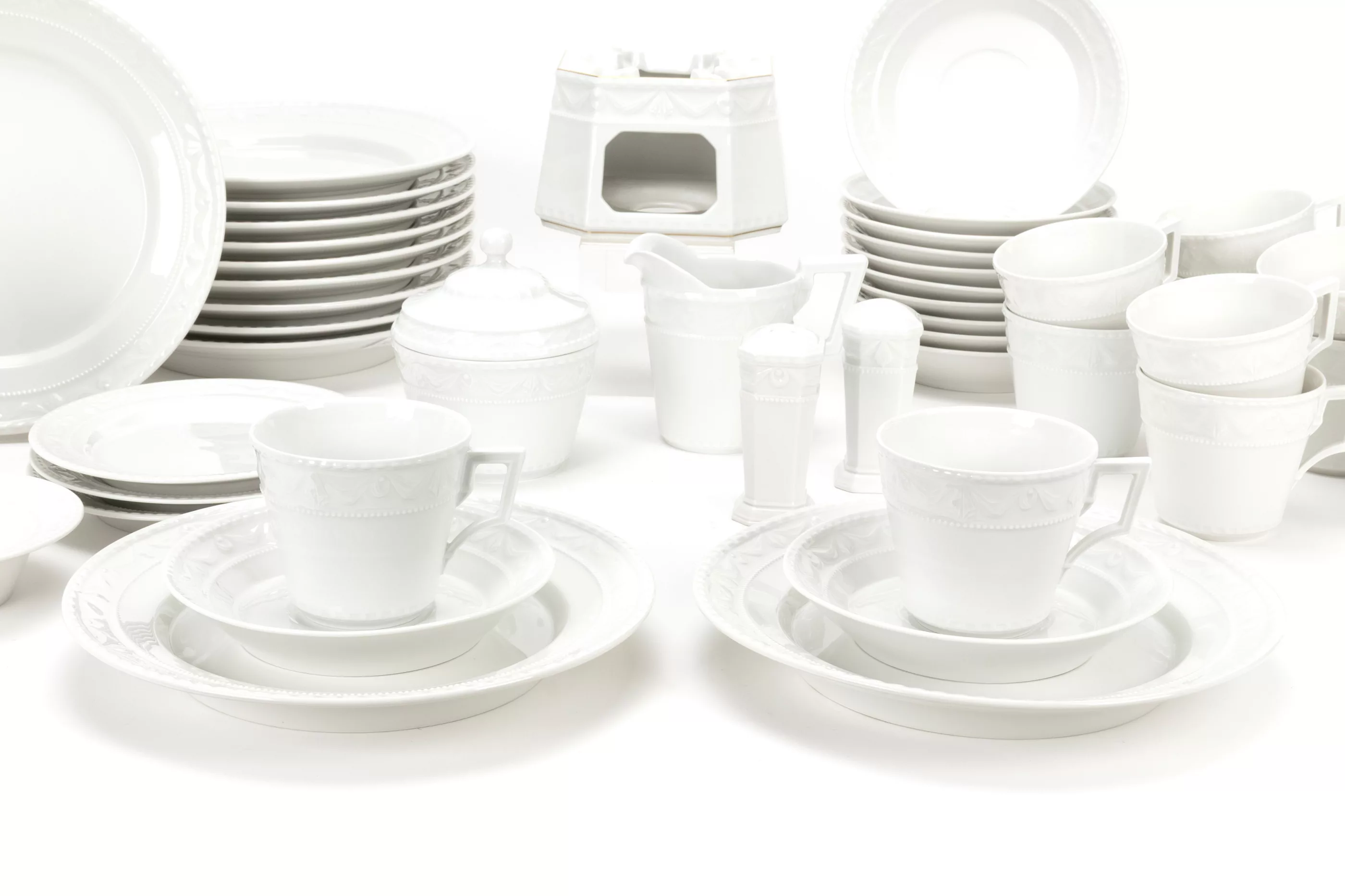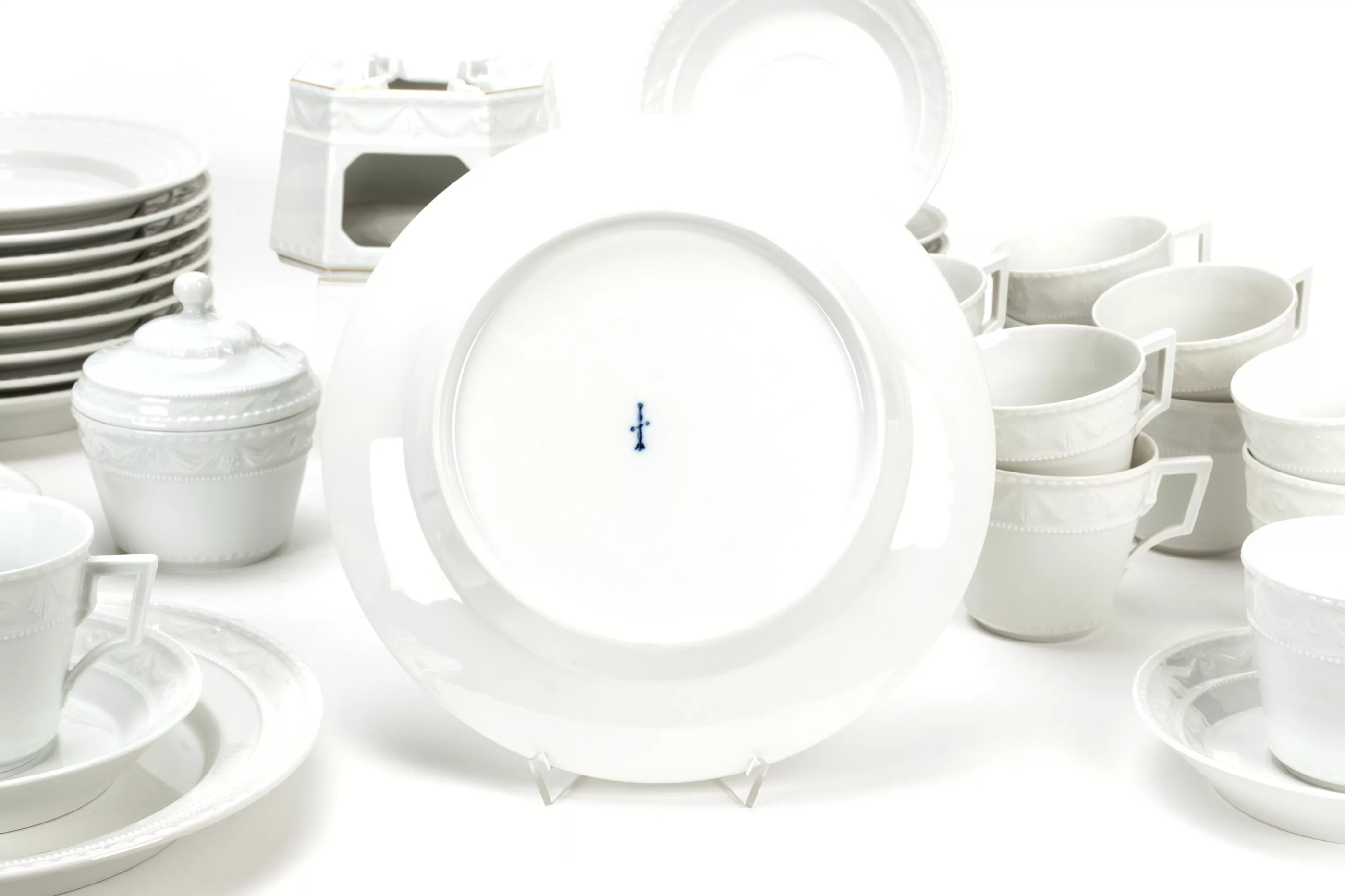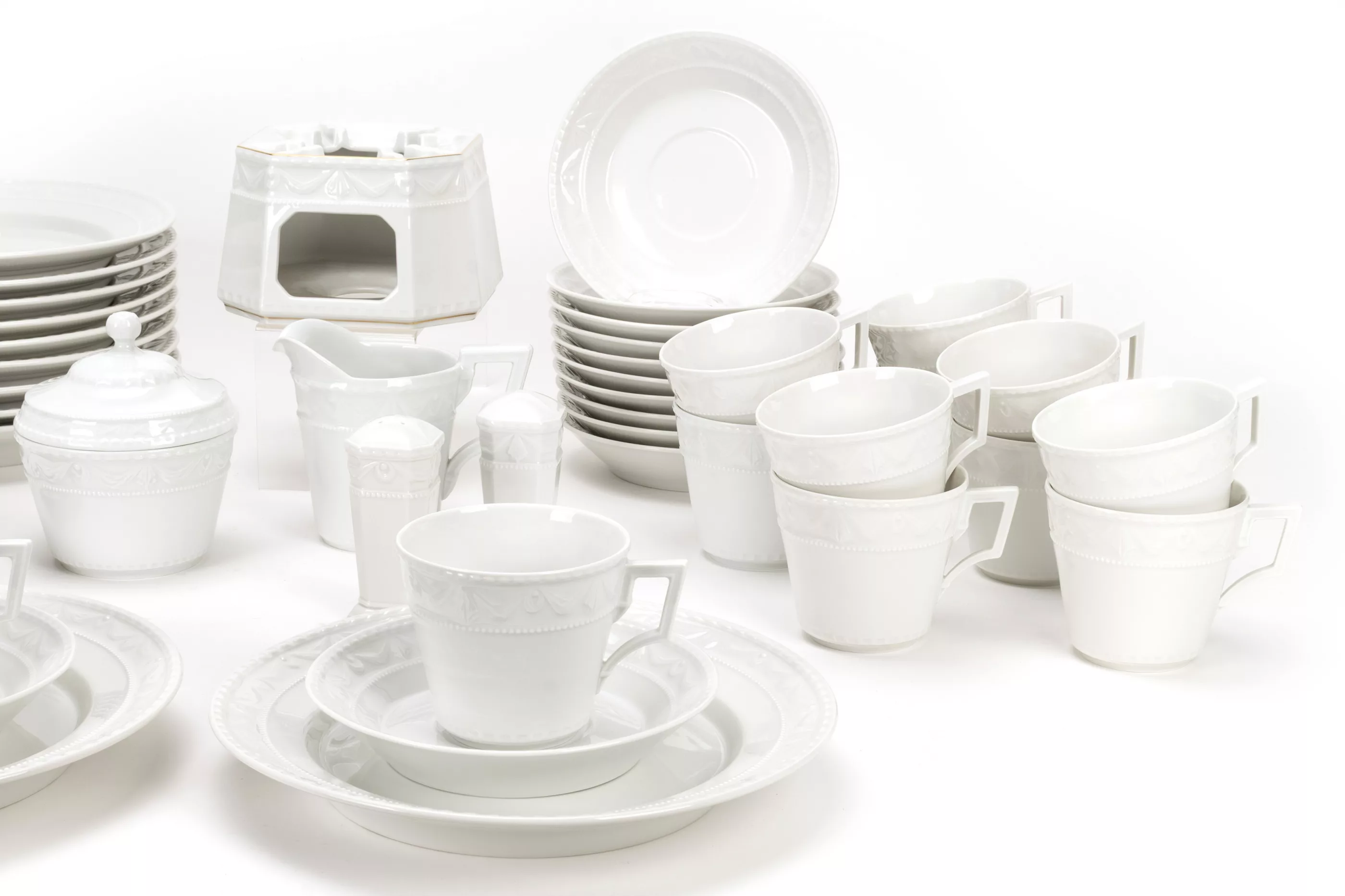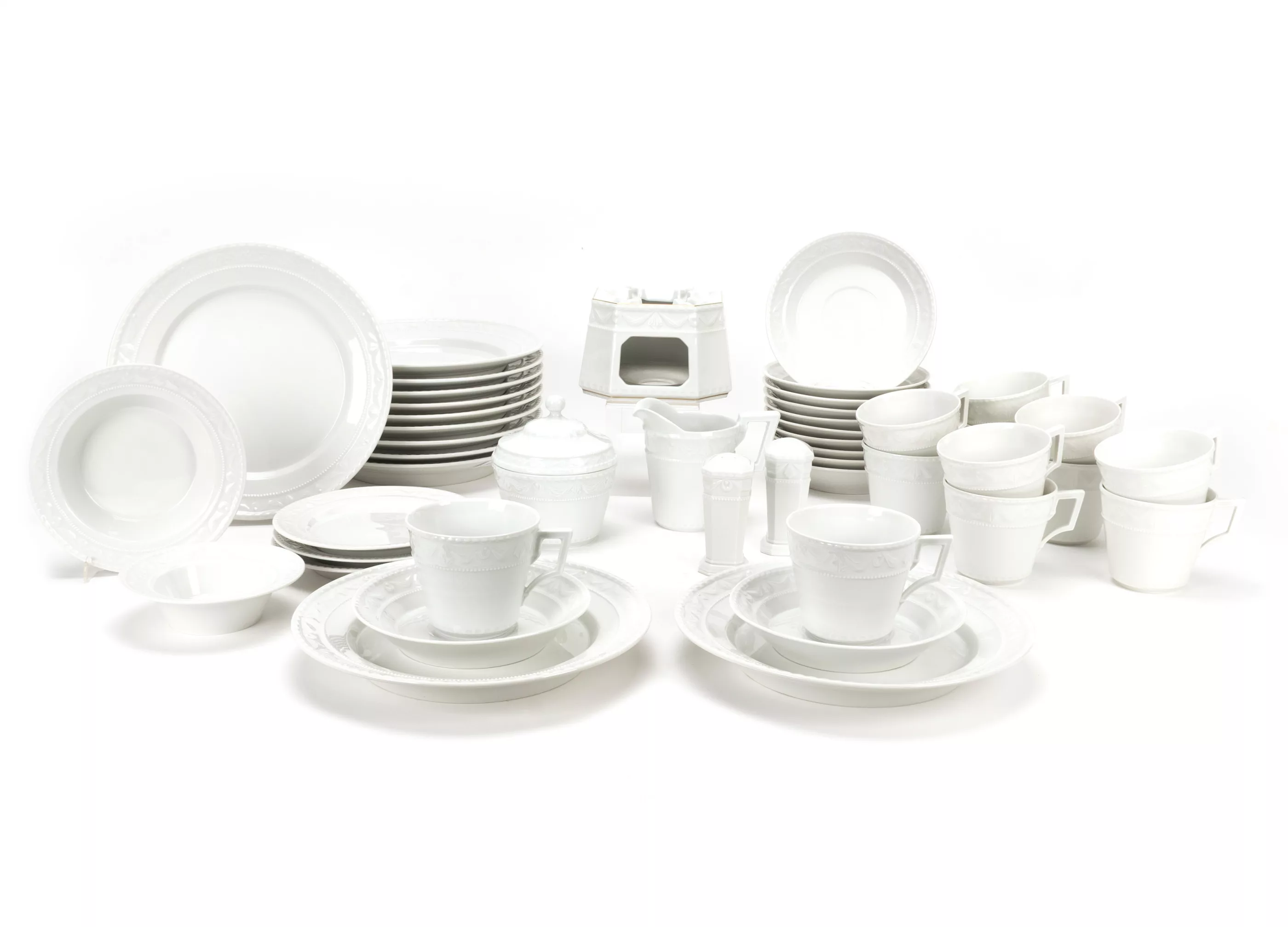 46-tlg., KPM Berlin, Entwurf von Johann Karl Friedrich Riese (1759 Tempelhof - 1834 Berlin) aus dem Jahr 1790 im Auftrag von Peter Biron, Herzog von Kurland (1724 Mitau - 1800 Gellenau), Mitte/Ende 20. Jh., Porzellan, weiß, Stövchen mit Goldrandbemalung, 12 Teller, Ø 22,5 cm, 12 Kaffeetassen, Ø 8 cm, 12 UT Ø 15 cm, 1 Milchkännchen, Höhe 10 cm, 3 Dessertteller, Ø 15,5 cm, 1 Gebäckdöschen, Höhe 12 cm, 2 Vorlegeschalen, Ø 15,5 und Ø 12 cm, 1 Stövchen, Höhe 9 cm, 1 Paar Salz- und Pfefferstreuer, Höhe jeweils 8,5 cm, alle Teile unterseitig mit Manufakturmarke, Stövchen mit Manufakturmarke, blauem Reichsapfel und Malermarke, 11 Teller mit Schleifstrich, Zustand A
