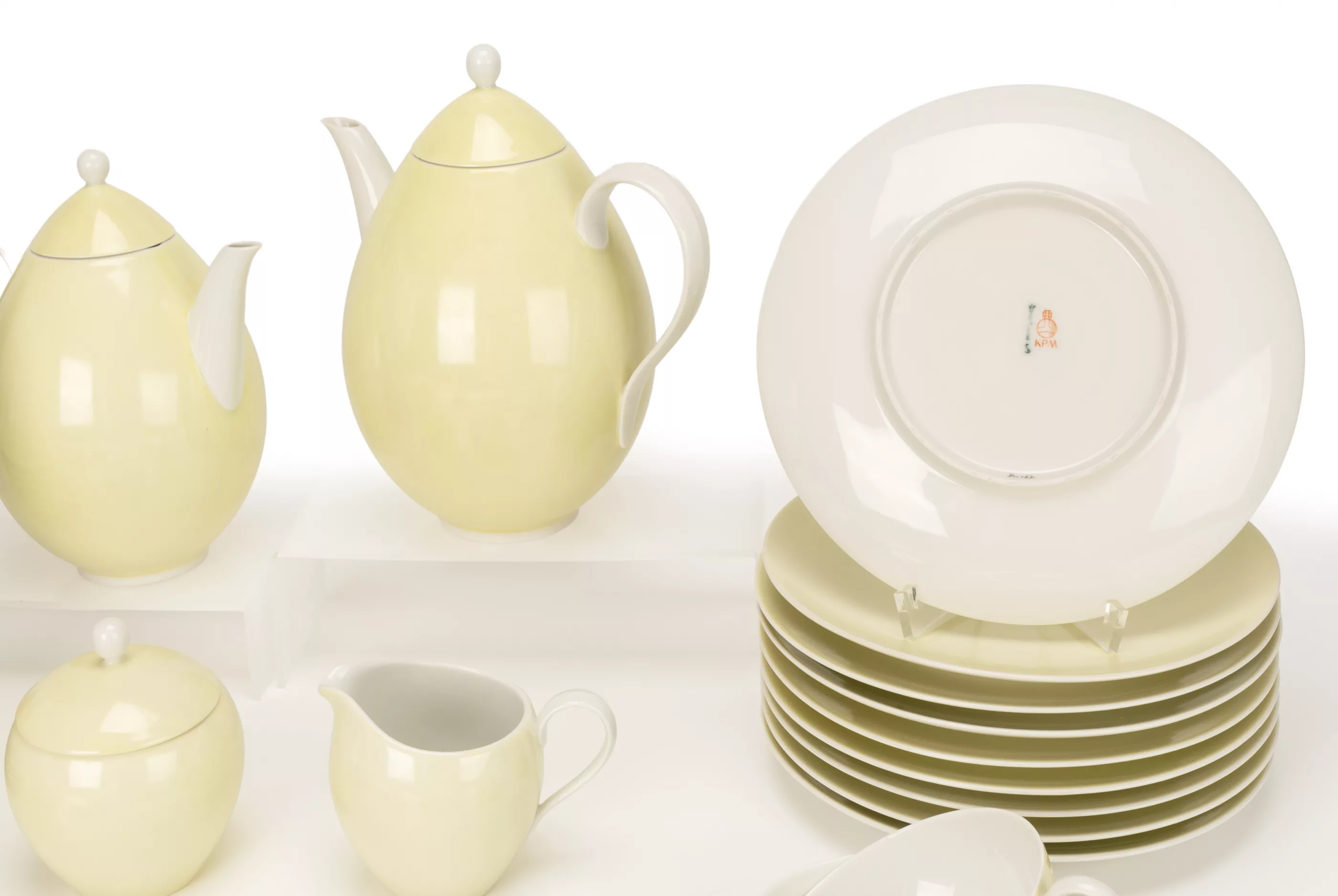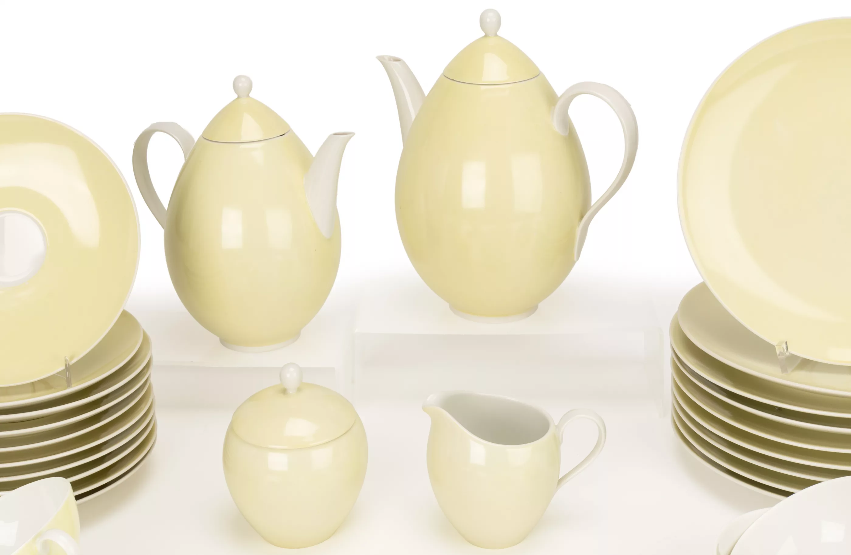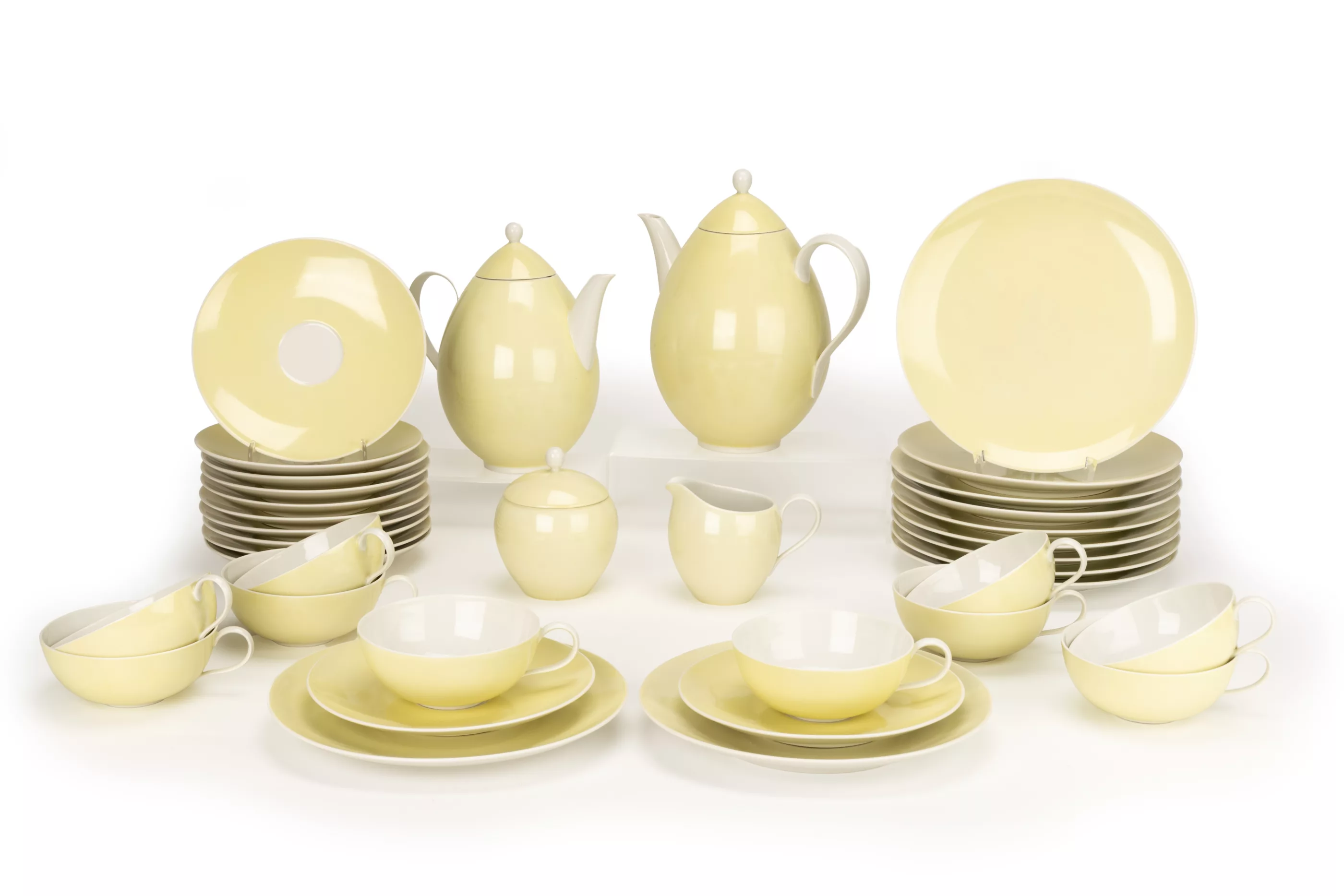 37-tlg., KPM Berlin, 2. Hälfte 20. Jh., Entwurf von Trude Petri (1906 - 1998) aus dem Jahr 1931, Porzellan, weiß, zitronengelber Fond, 1 Kaffeekanne, H 20 cm, 1 Teekanne, H 18,5 cm, 1 Milchkännchen, 1 Zuckerdose mit Deckel, 10 Kaffeetassen und 12 Untertassen, 11 Kuchenteller, Ø 19 cm, Manufakturmarke, roter Reichsapfel und Malermarken, Zustand B