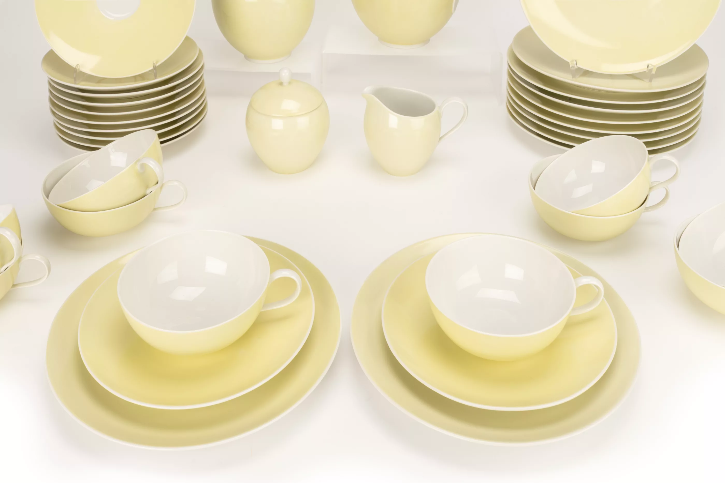 37-tlg., KPM Berlin, 2. Hälfte 20. Jh., Entwurf von Trude Petri (1906 - 1998) aus dem Jahr 1931, Porzellan, weiß, zitronengelber Fond, 1...