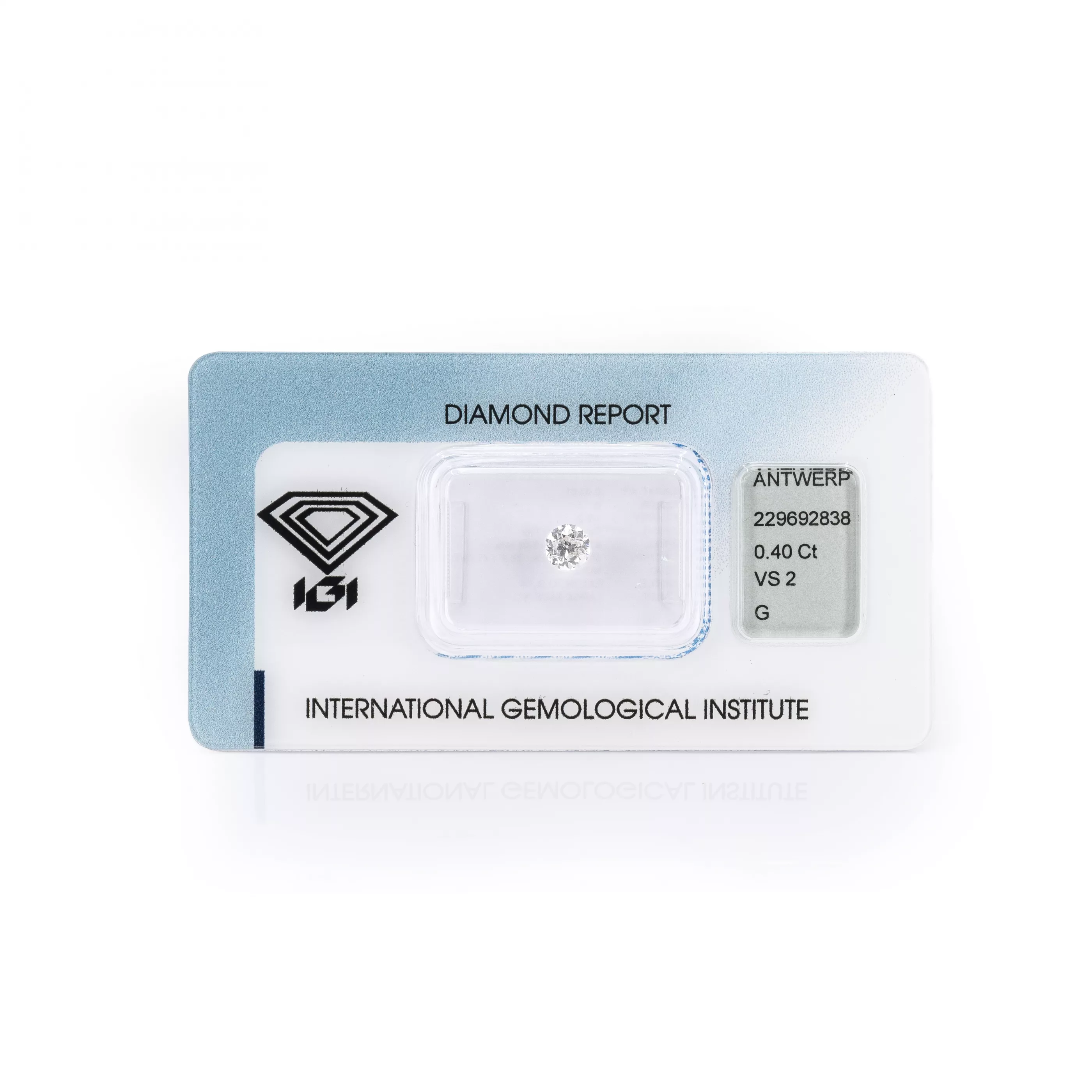 Diamant im Brillantschliff, 0,40 ct, G, vs 2, Fluoreszenz keine, Proportionen mittel, Politur gut, IGI Zertifikat von 2016 a
