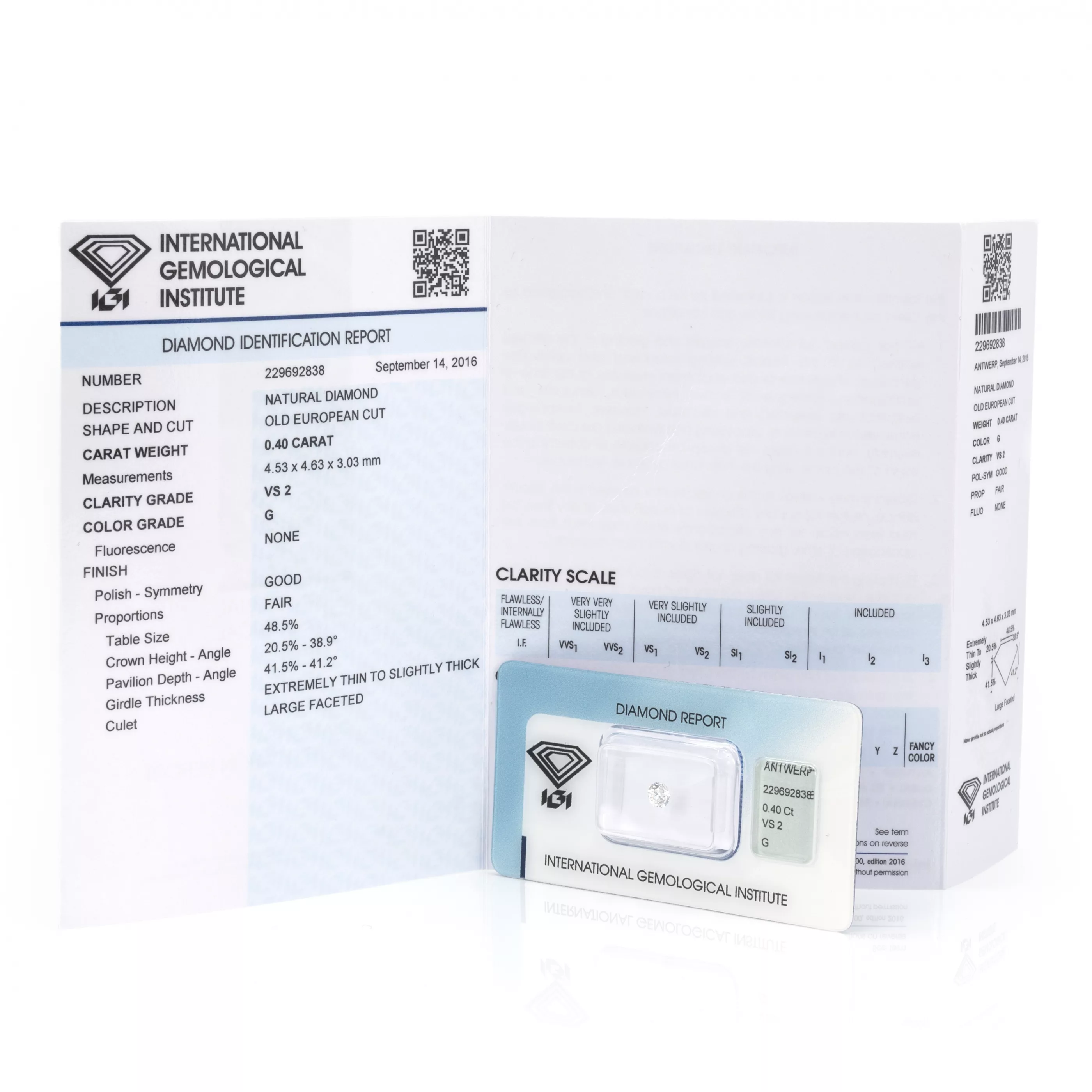 0.40 ct, G, VS 2, fluorescence no, proportion fair, polish good, IGI certificate from 2016 enclosed
