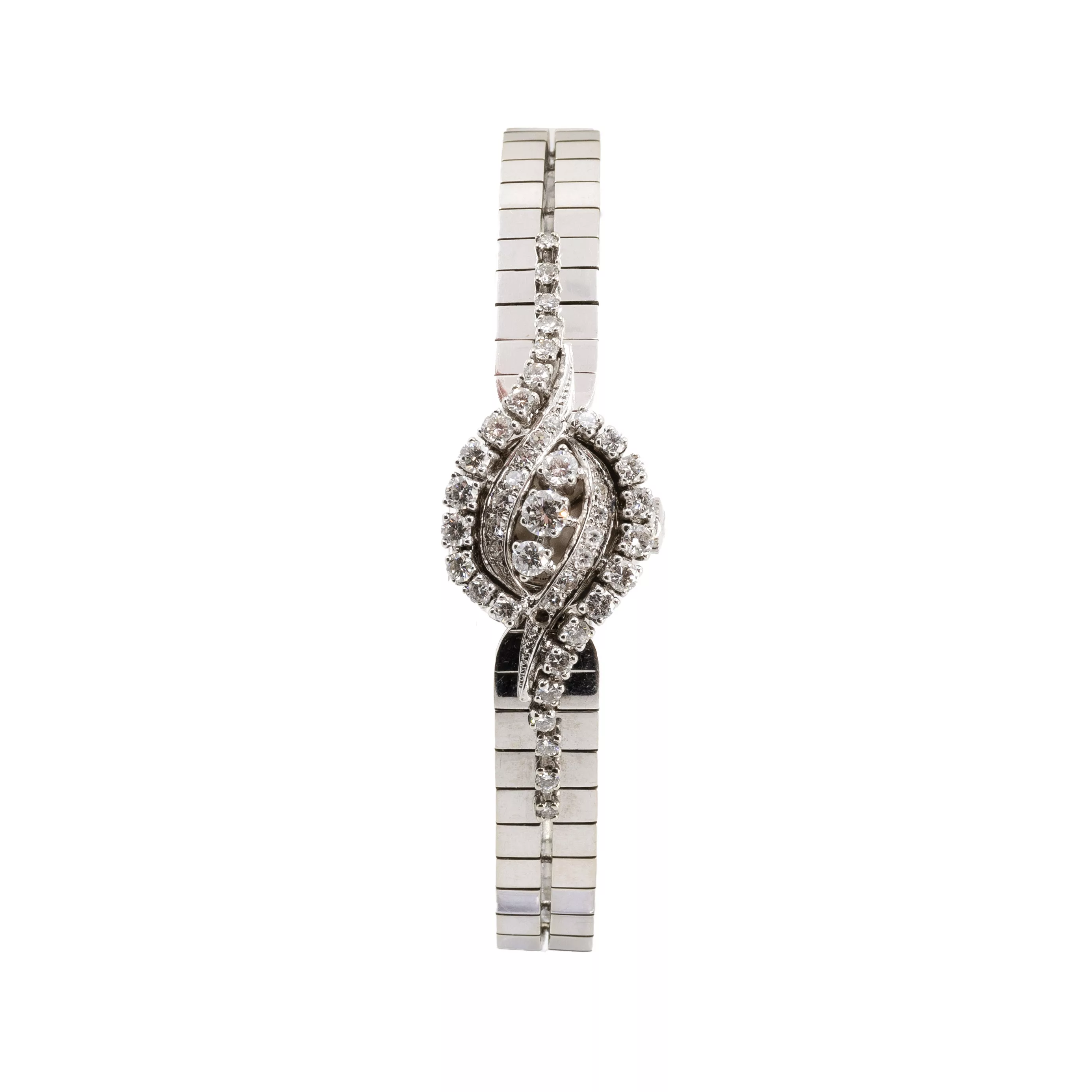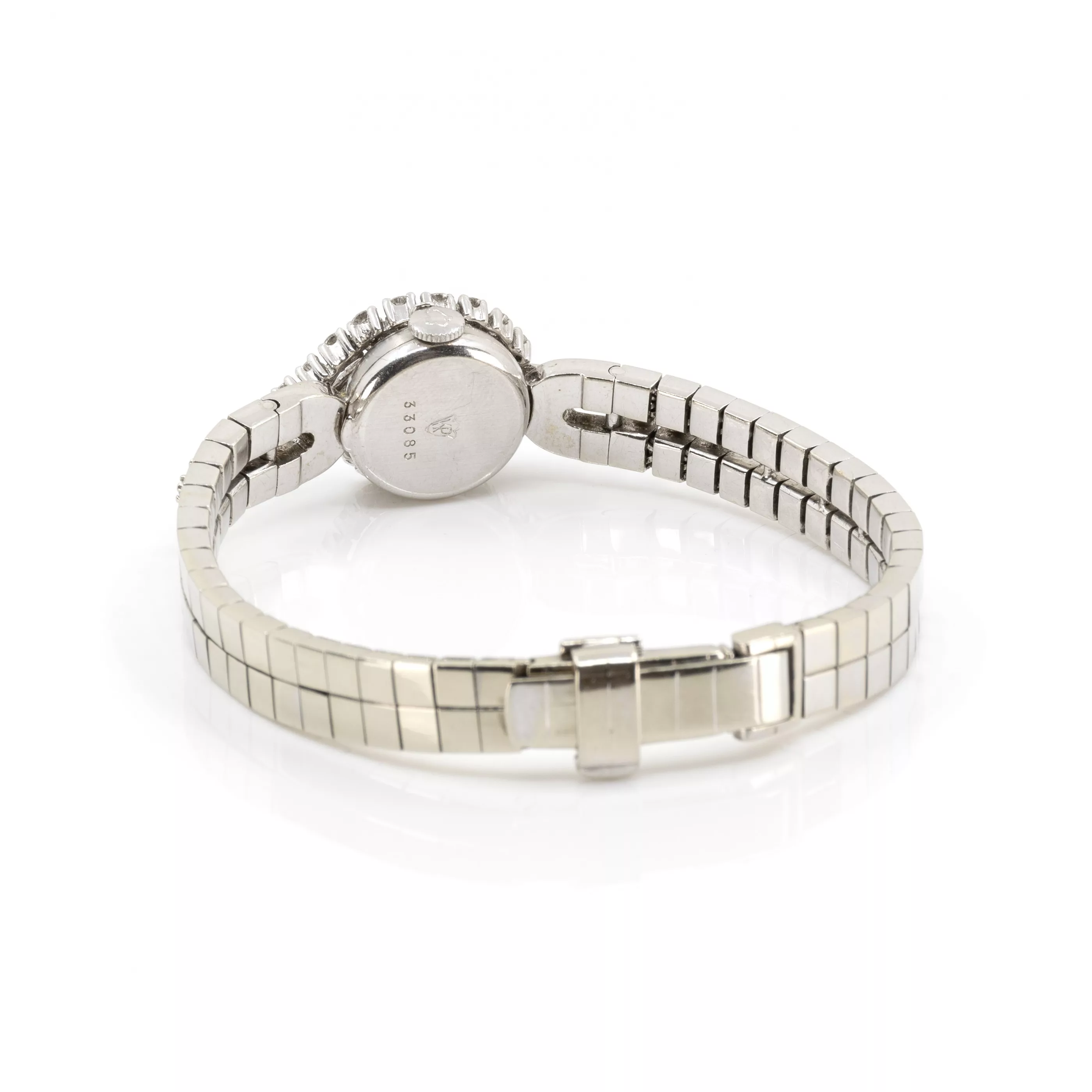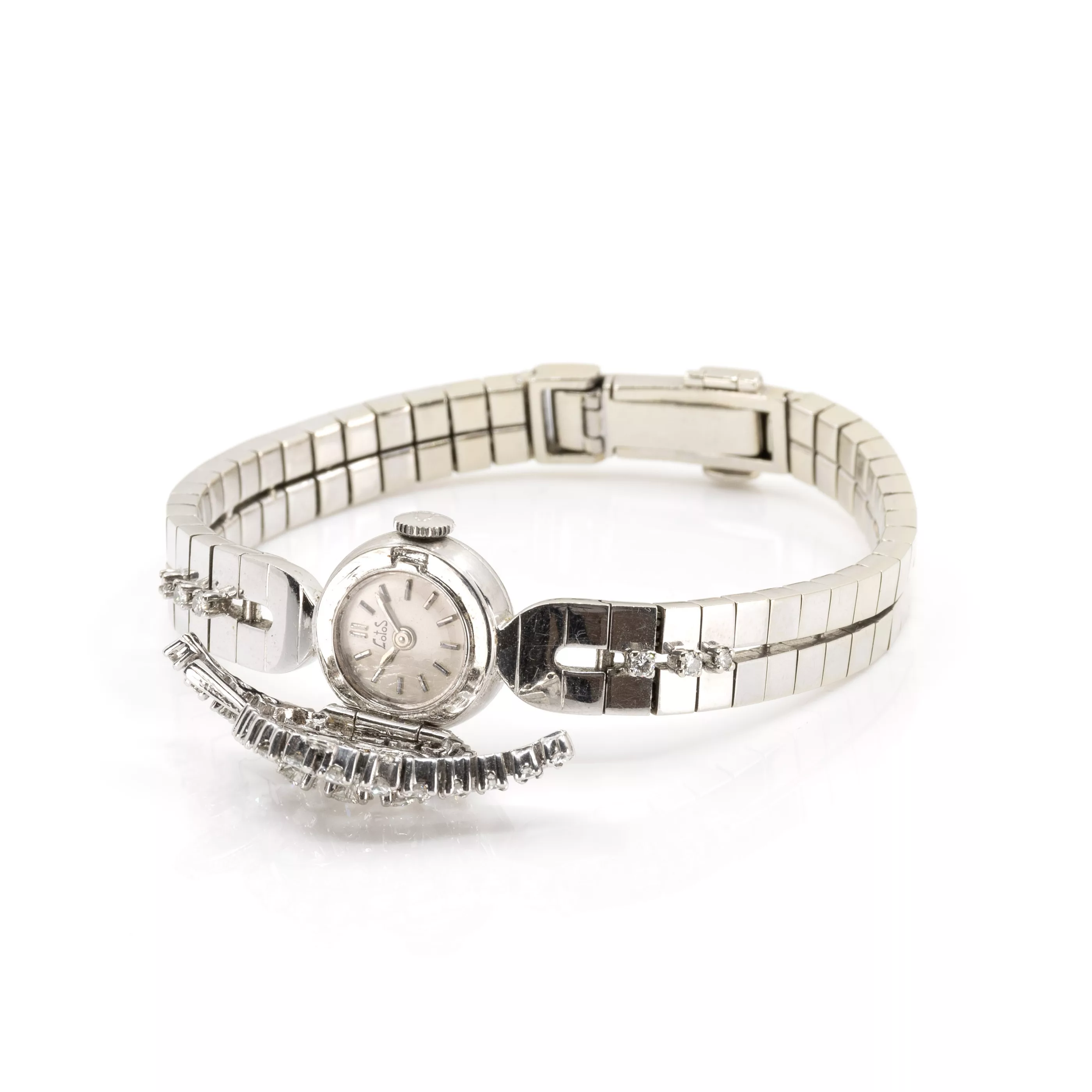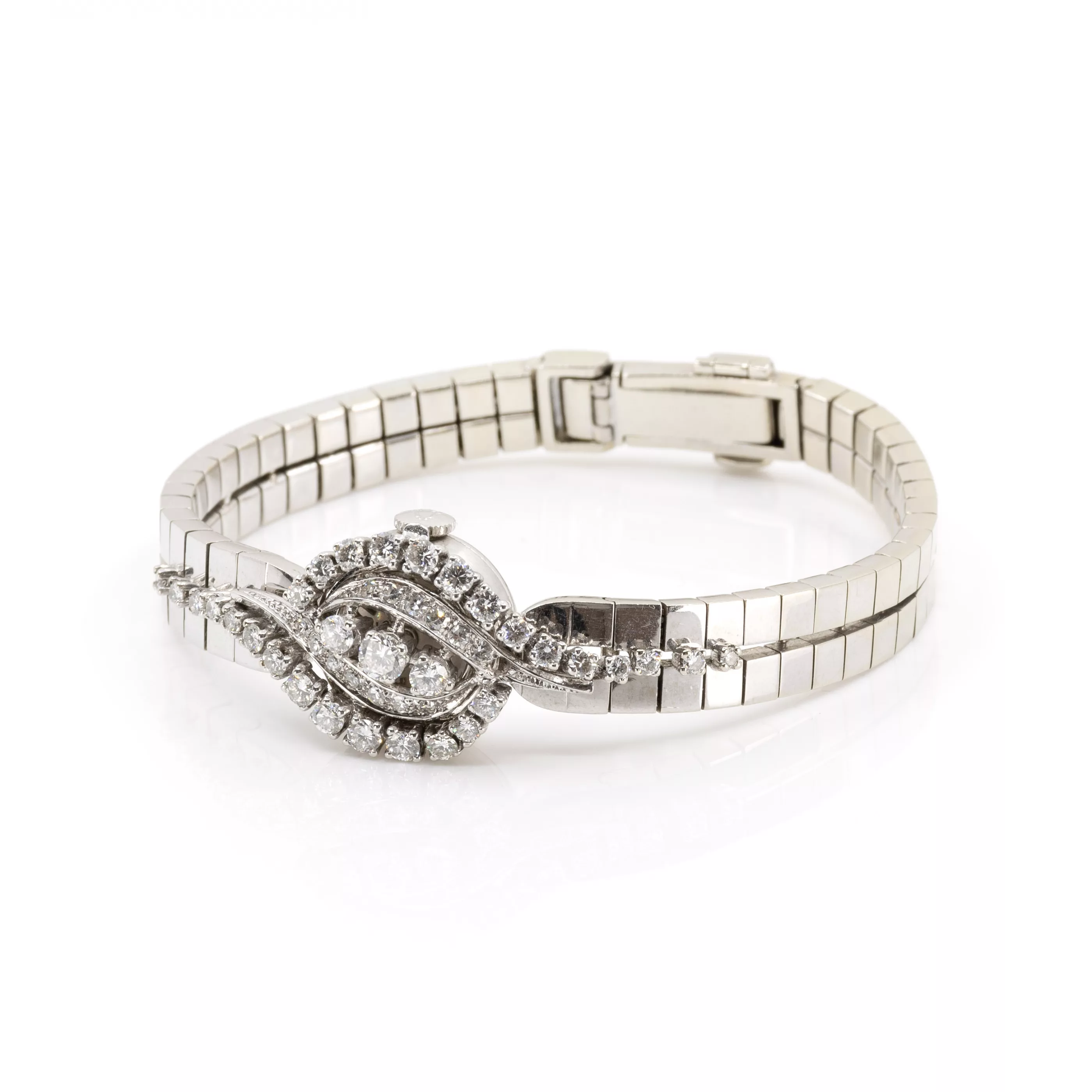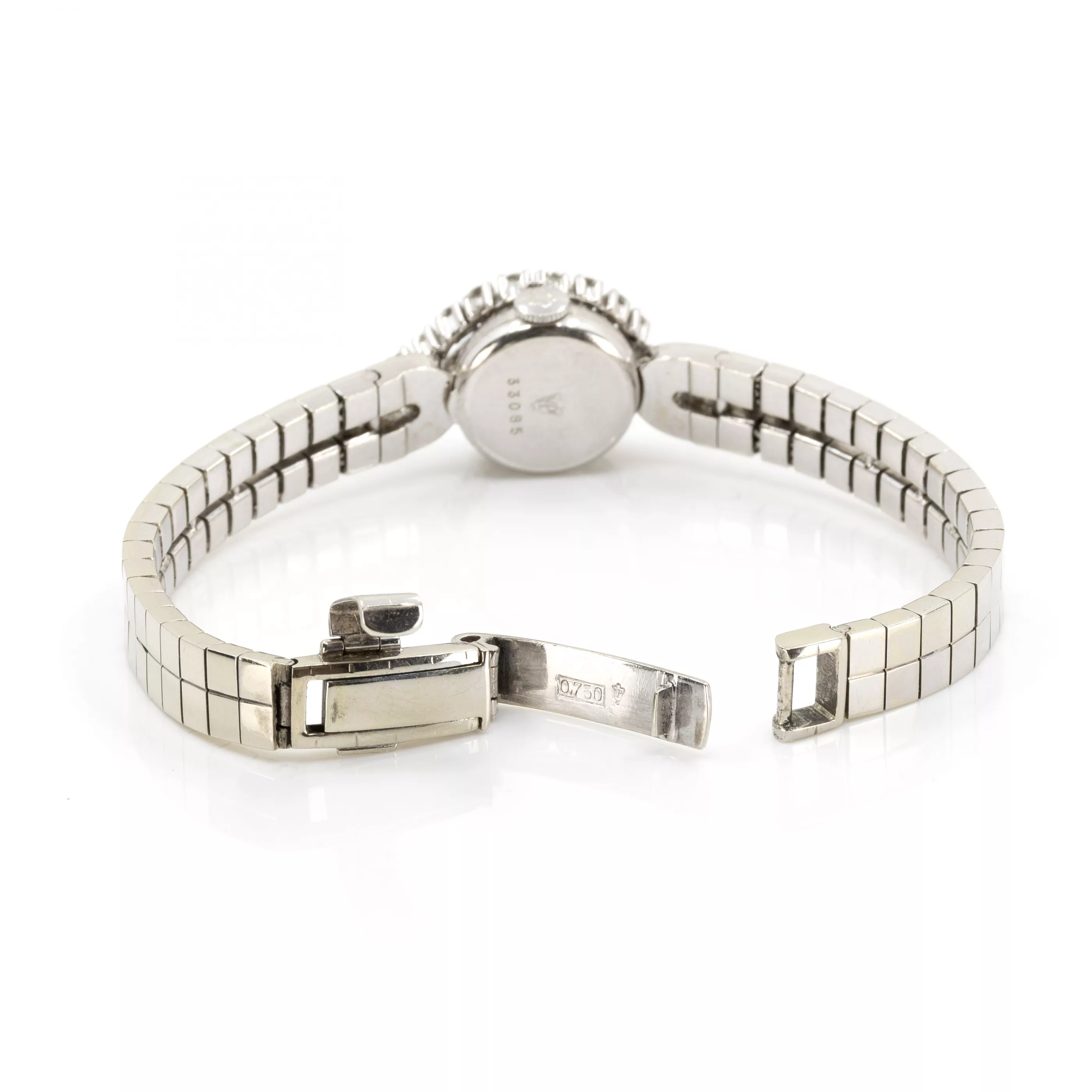 1970s, manual winding, case no. 33085, case 750 white gold, cover and bracelet with 44 brilliant-cut diamonds, total approx. 1.75 ct, diameter 16 mm, original bracelet, 750 white gold, original clasp, 750 white gold, hallmarked, length 17 cm, extendable by mainspring, total weight approx. 45.4 g, function tested, not working, in need of repair, condition satisfactory, white gold alloy partially worn, without original box or papers
