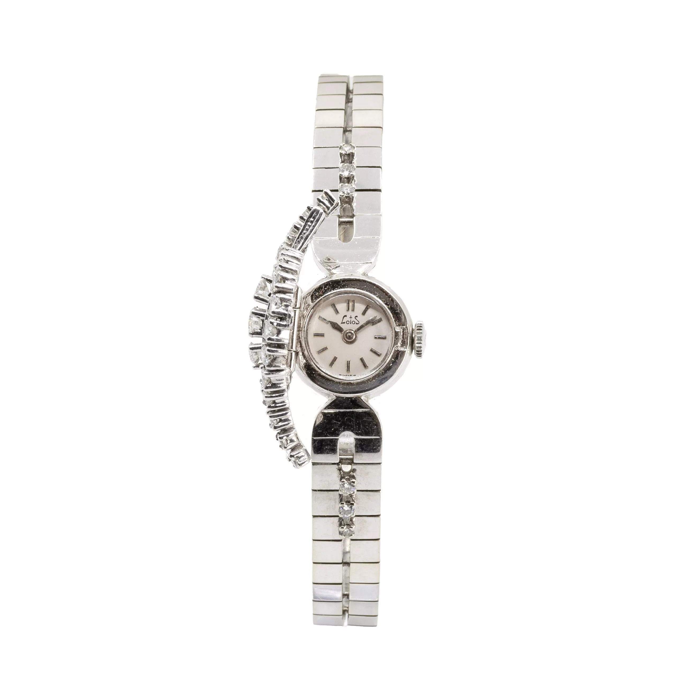 1970er Jahre, Handaufzug, Gehäuse-Nr. 33085, Gehäuse 750 Weißgold, Deckel und Armband mit 44 Diamanten im Brillantschliff, gesamt ca. 1,75 ct, Durchmesser 16 mm, Original-Armband, 750 Weißgold, Original-Schließe, 750 Weißgold, punziert, Länge 17 cm, durch Zugfeder verlängerbar, Gesamtgewicht ca. 45,4 g, Funktion geprüft, nicht gangbar, reparaturbedürftig, Zustand befriedigend, Weißgoldlegierung partiell abgetragen, ohne Original-Box oder -Papiere