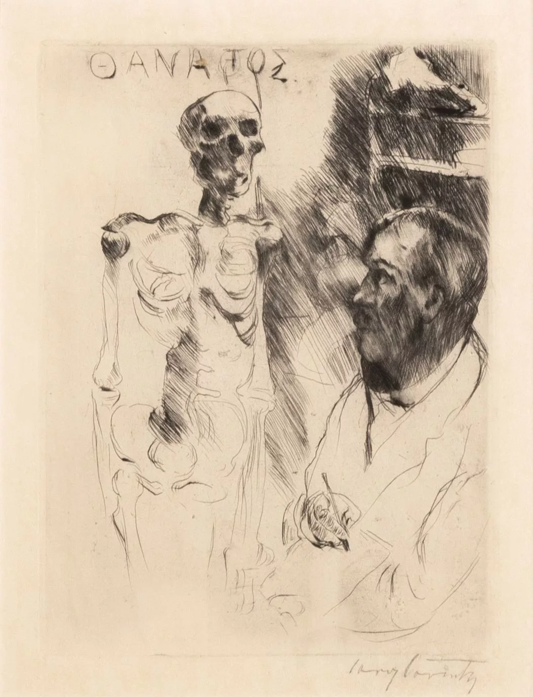The artist and death, drypoint on Japan paper, plate size 26,5 cm x 19,5 cm, signed, darkened, mounted, slightly creased and wavy, one of 40 copies of the second state with the corrected writing in the plate on Japan paper, literature: Schwarz 238 II of II