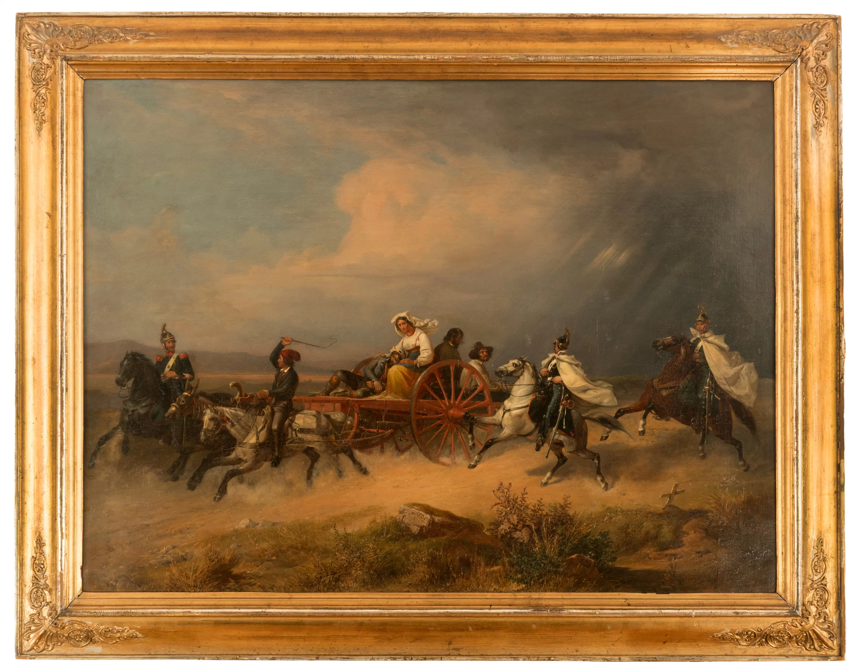 Die Flucht vor den Eidgenossen. Horse-drawn carriage with wounded fleeing in the company of three cavalrymen', oil on canvas, 74 cm x 100 cm canvas dimensions, signed, craquelure, fine cracks in places, minimally retouched, relined, Literature: Thieme, Becker, vol. 34, pp. 485/86, Boetticher Malerwerke, vol. II, pp. 936/37