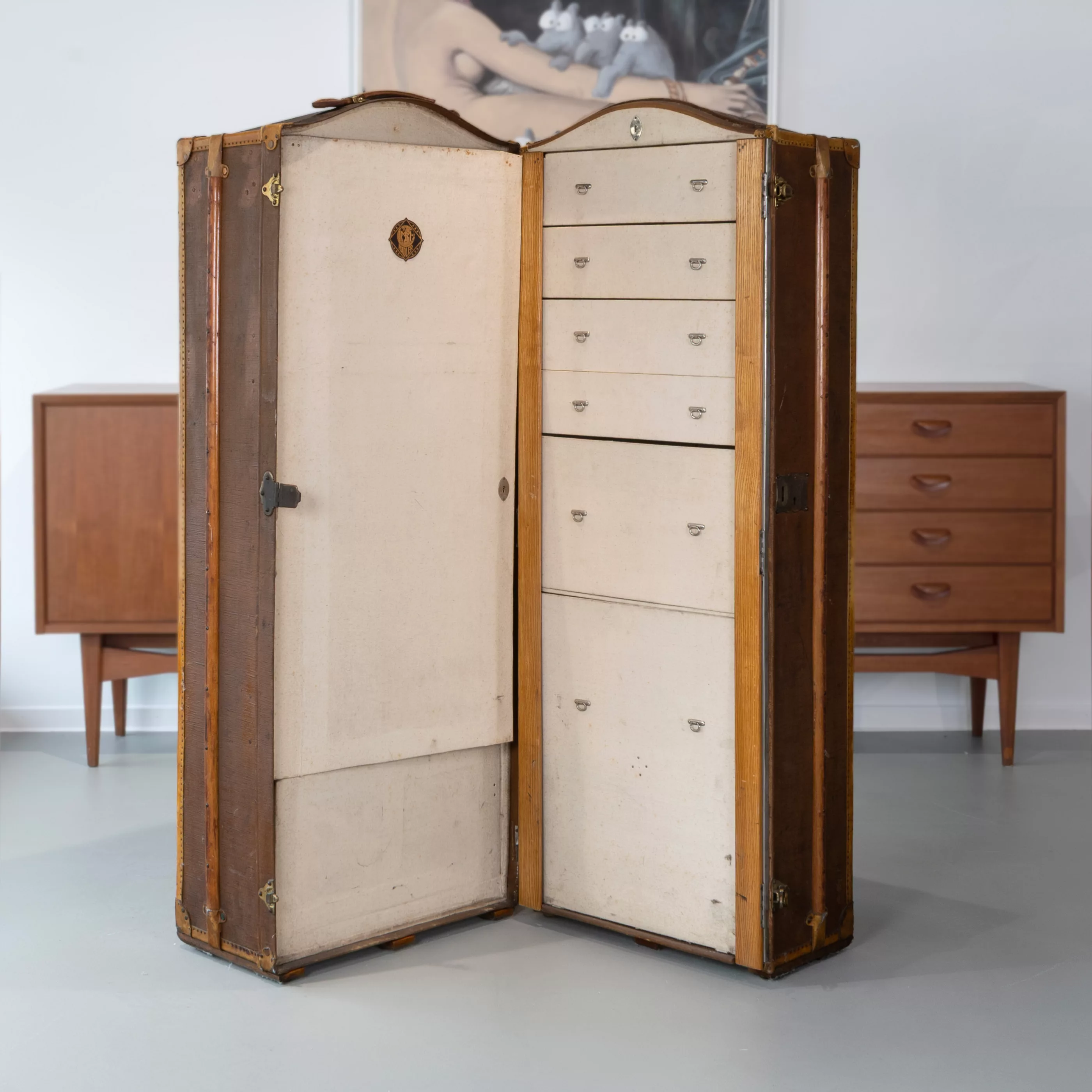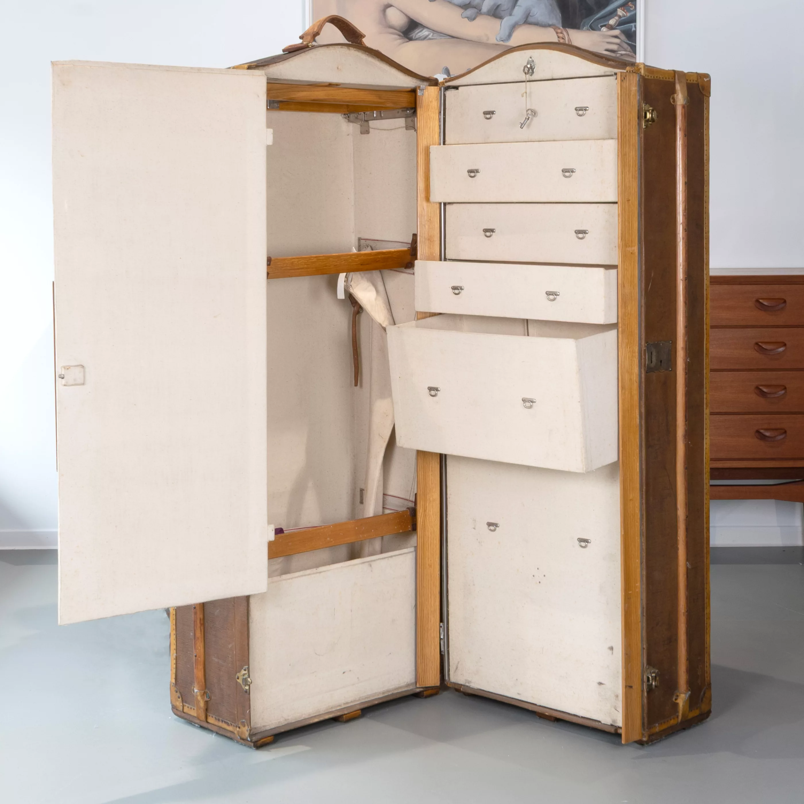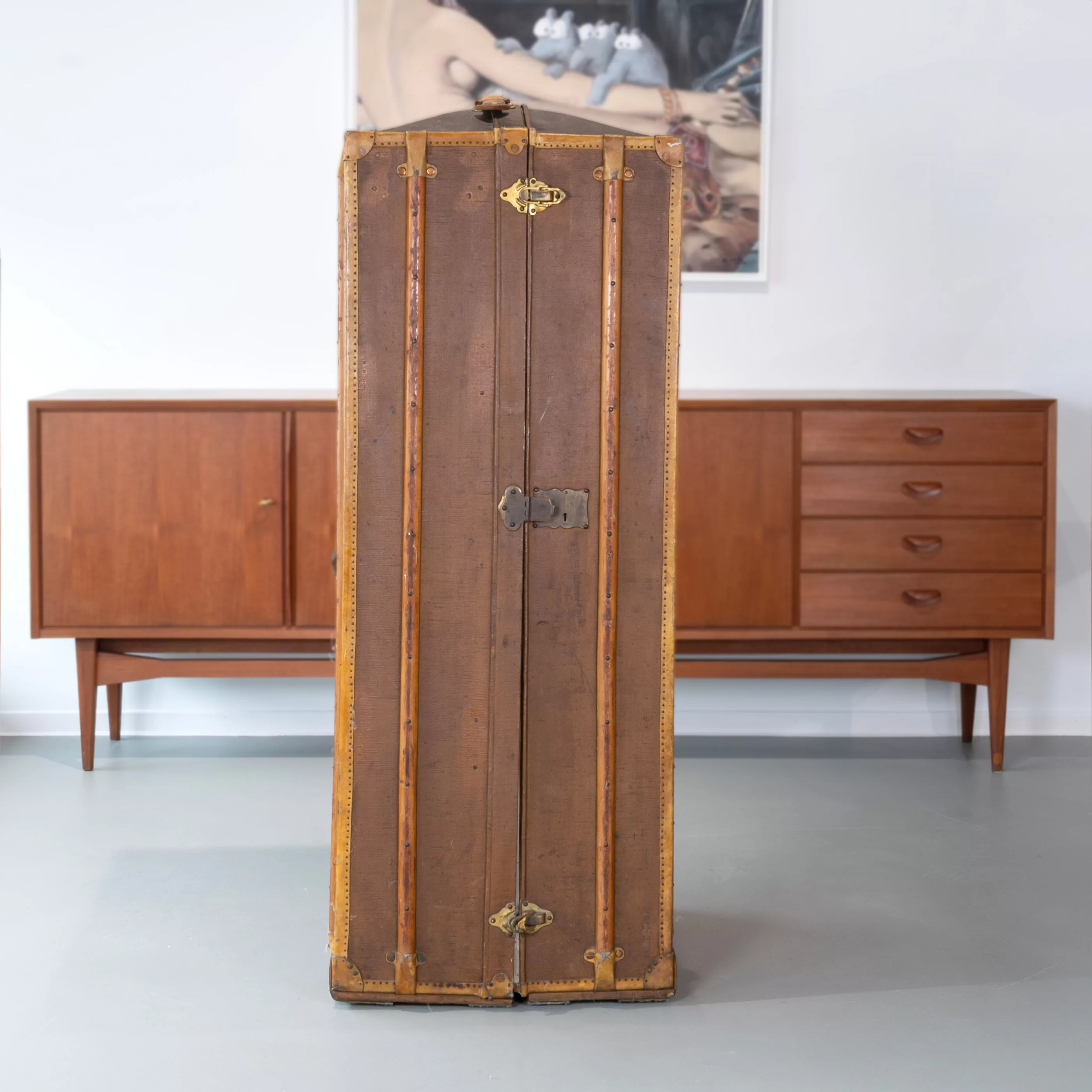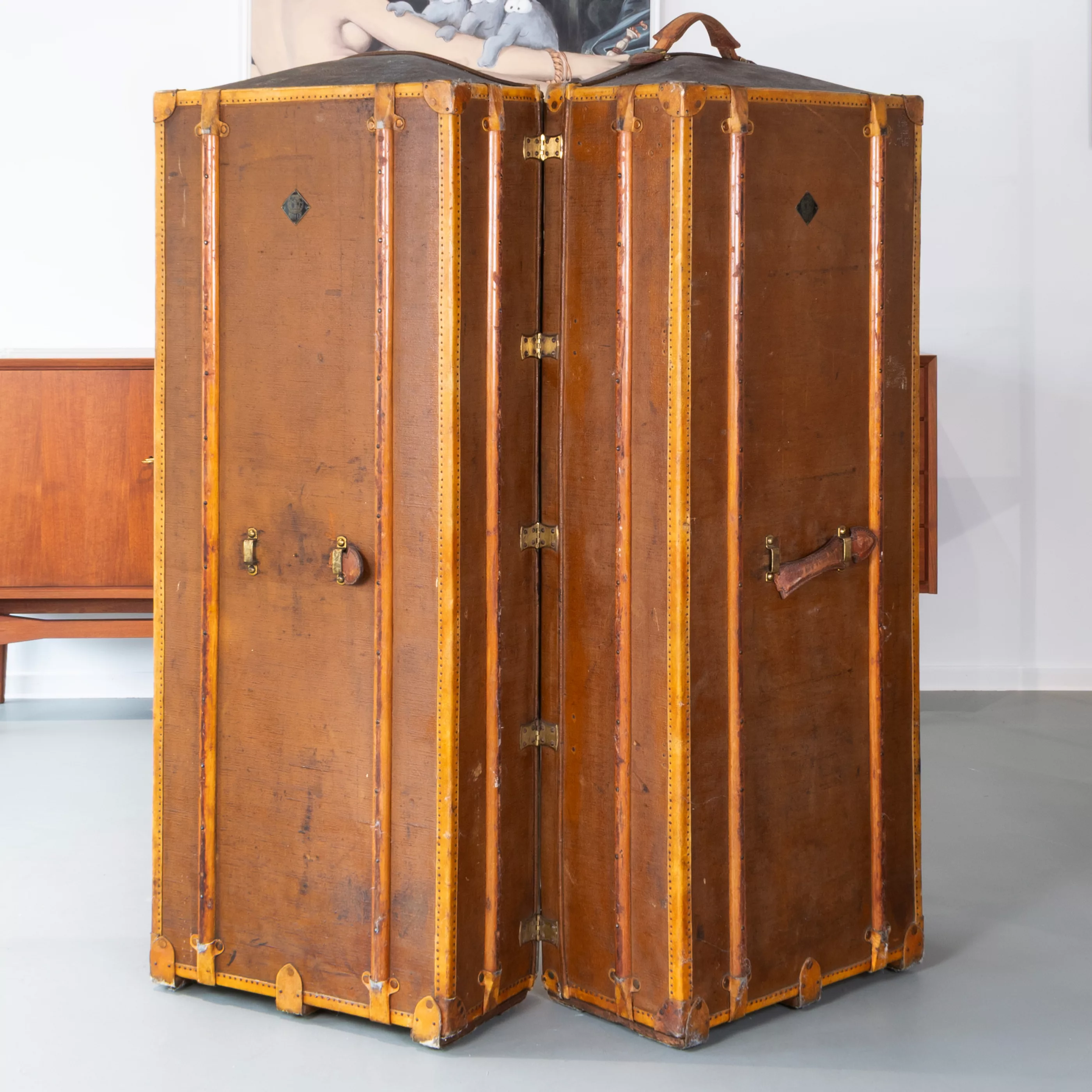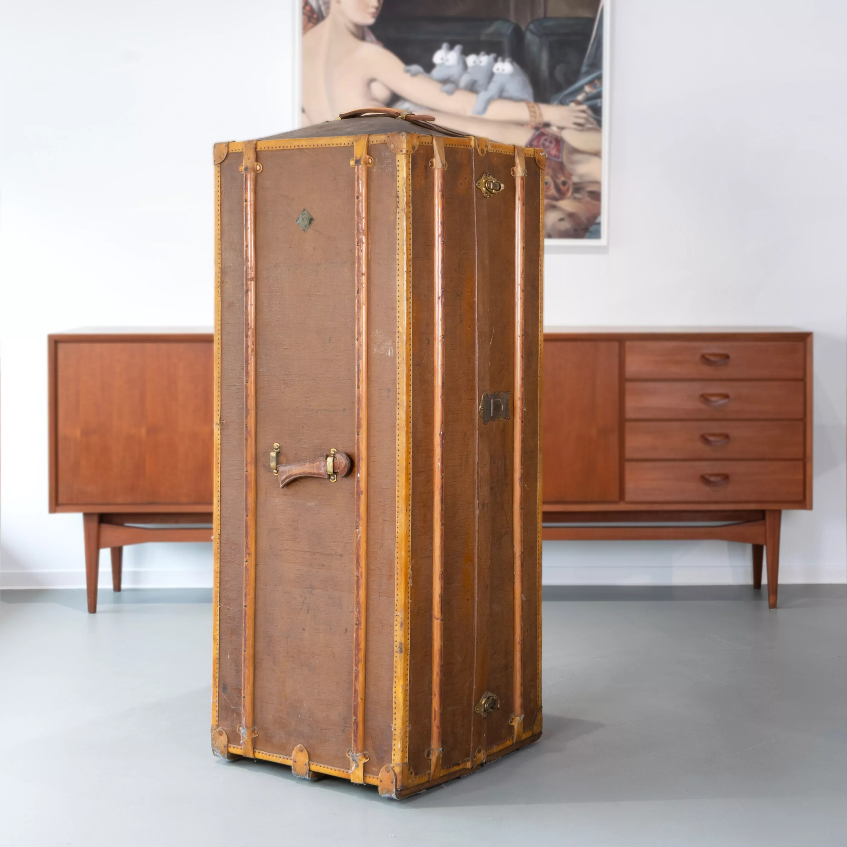 Moritz Mädler, Germany, c. 1900, rectangular wooden body lined with brown oilcloth, wooden, metal and leather fittings, inside 6 drawers and 1 hanging compartment, lockable, completely lined with fabric, 145 x 54 x 56 cm, strong signs of age and wear, warped, lock of the hanging compartment does not close, outer locks do not close in part, foxing inside, outer carrying handles partly fallen off