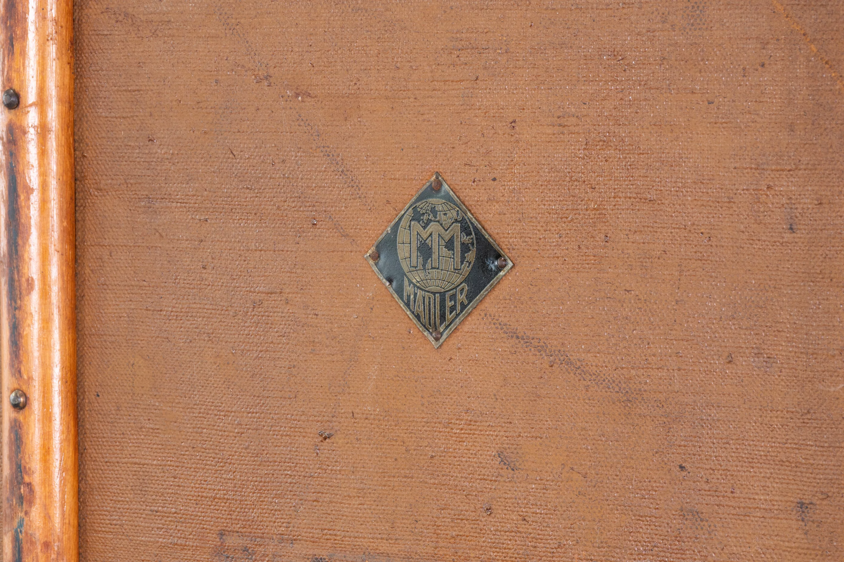 Moritz Mädler, Deutschland, um 1900, rechteckiger Holzkorpus mit braunem Wachstuch kaschiert, Holz-, Metall- und Lederbeschläge, innen 6 Schubladen und 1 Hängefach, abschließbar, vollständig mit Stoff ausgekleidet, 145 x 54 x 56 cm, starke Alters- und Gebrauchsspuren, verzogen, Schloss des Hängefachs schließt nicht, äußere Schlösser schließen zum Teil nicht, innen stockfleckig, äußere Tragegriffe teils abgefallen