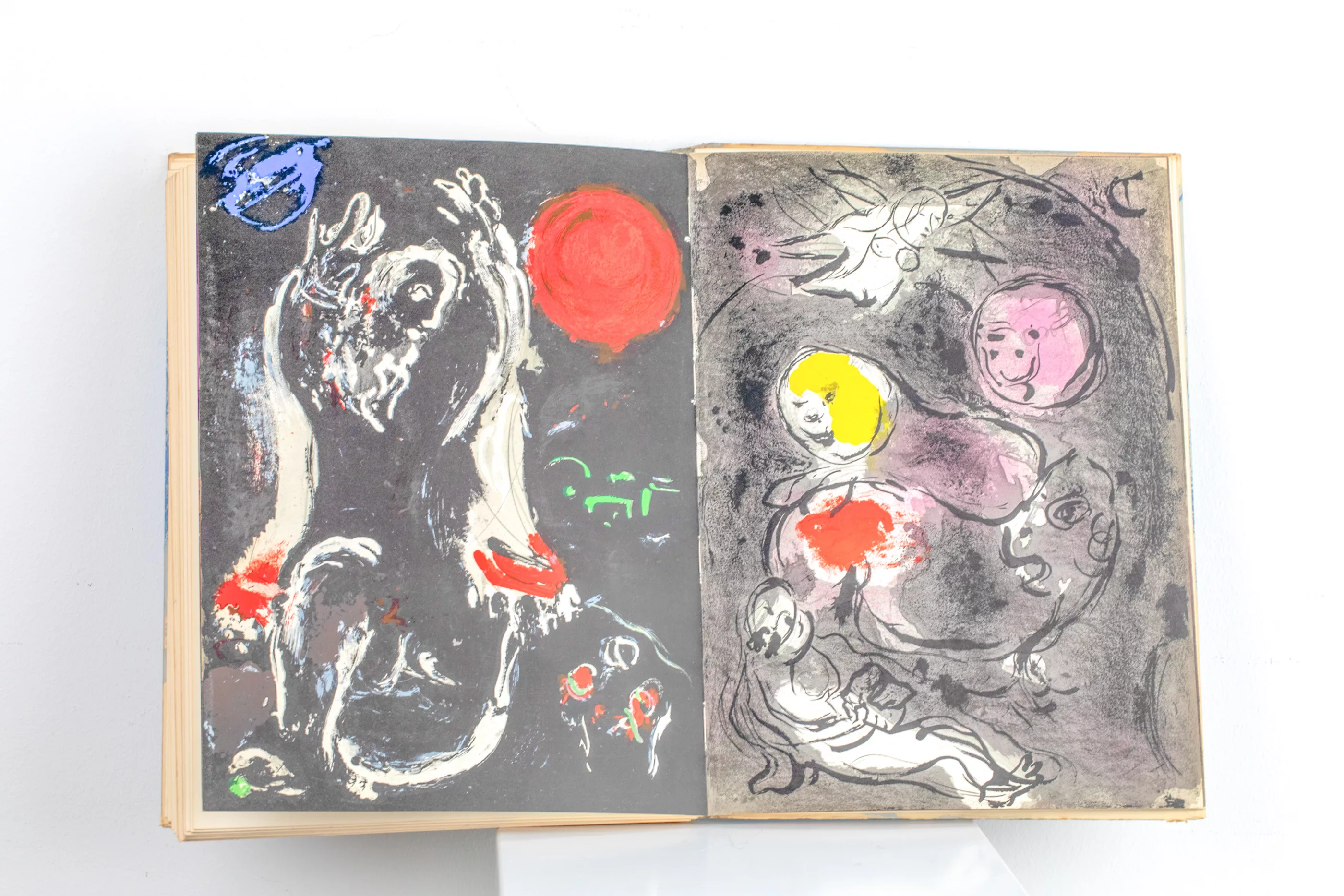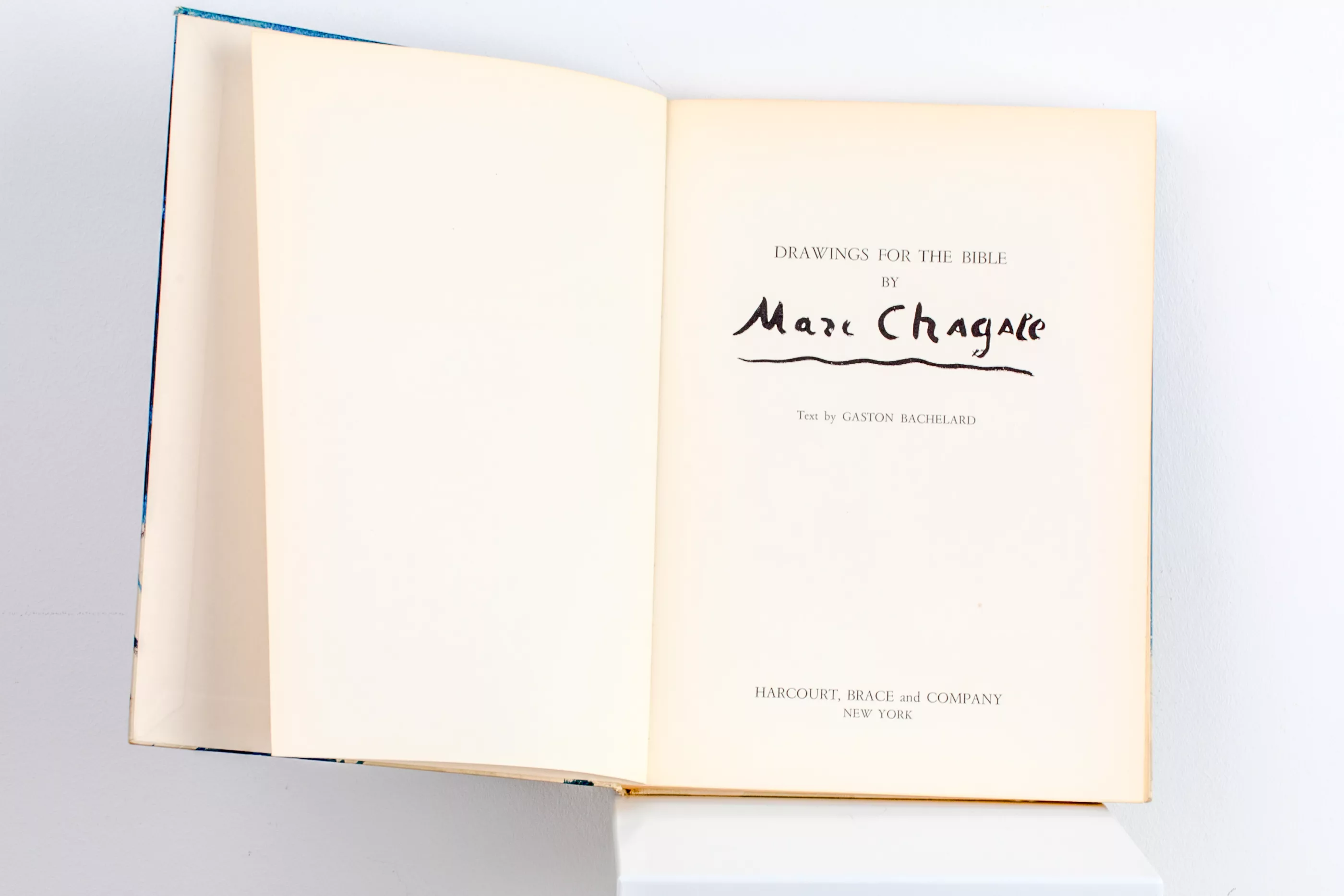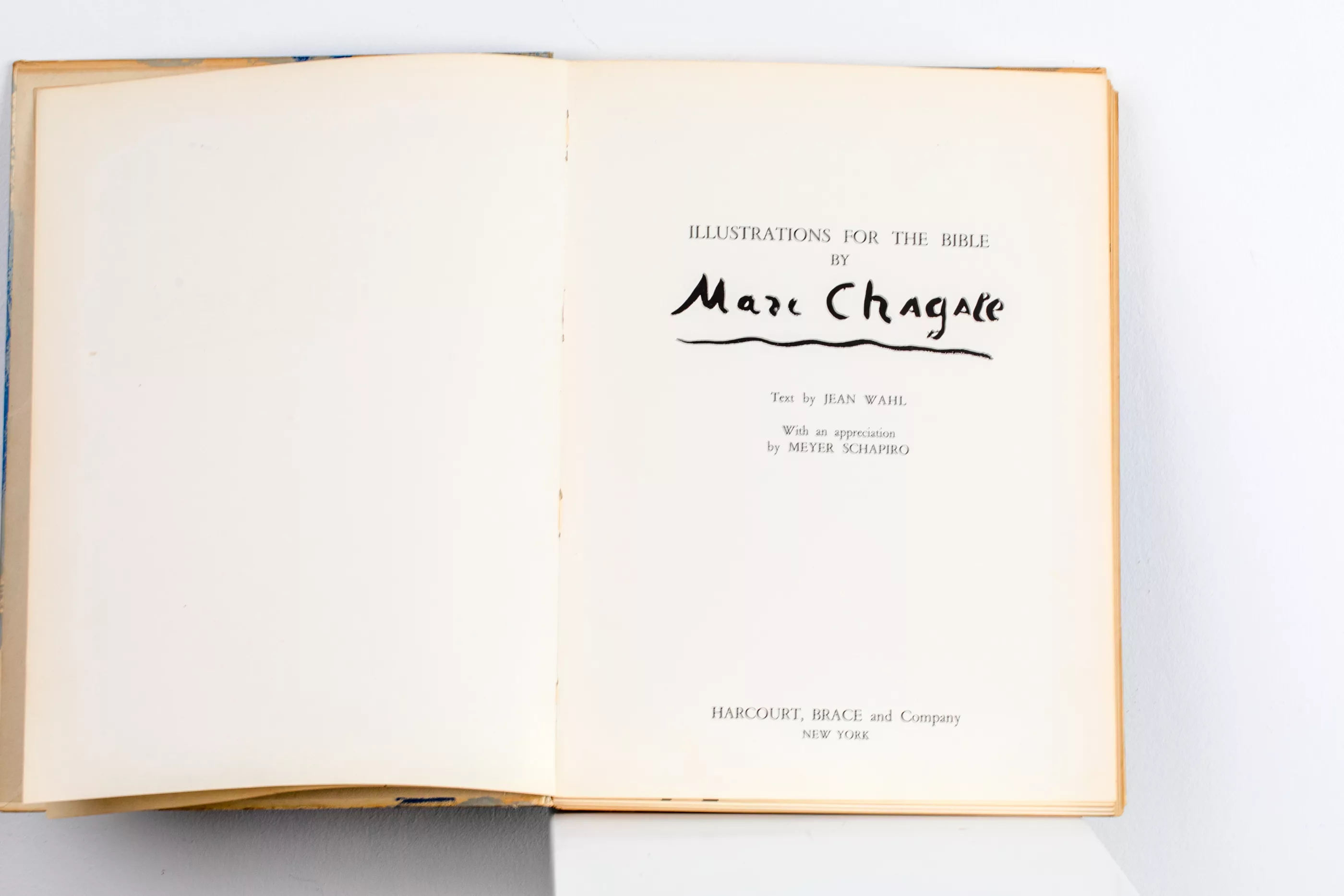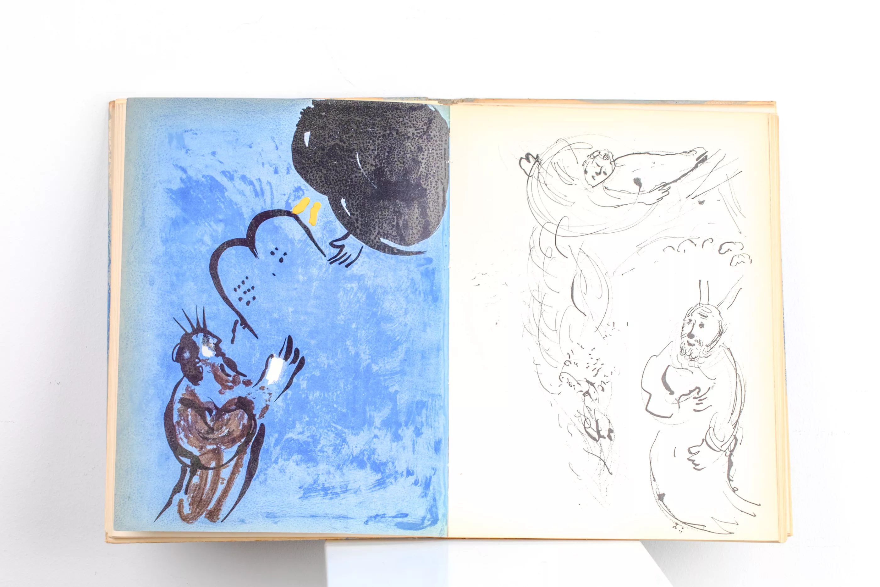and Company 1956, with 105 heliogravures after the complete etching cycle ''Illustrations for the Bible'' together with 16 colour and 12 black-and-white lithographs, printed at Mourlot, 36.5 × 27 cm (2) Drawings for the Bible by Marc Chagall, New York: Harcourt, Brace and Company 1960, with 96 heliogravures after drawings for the Bible and 24 colour lithographs, printed at Mourlot, each 36.5 × 27 cm, binding of the first volume loose, covers with edge wear, yellowed, partially soiled