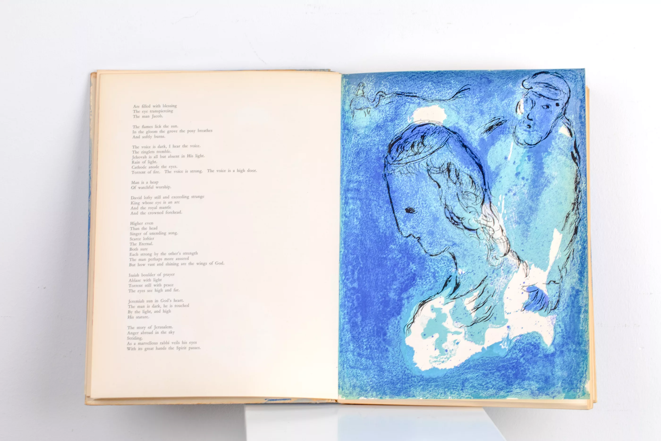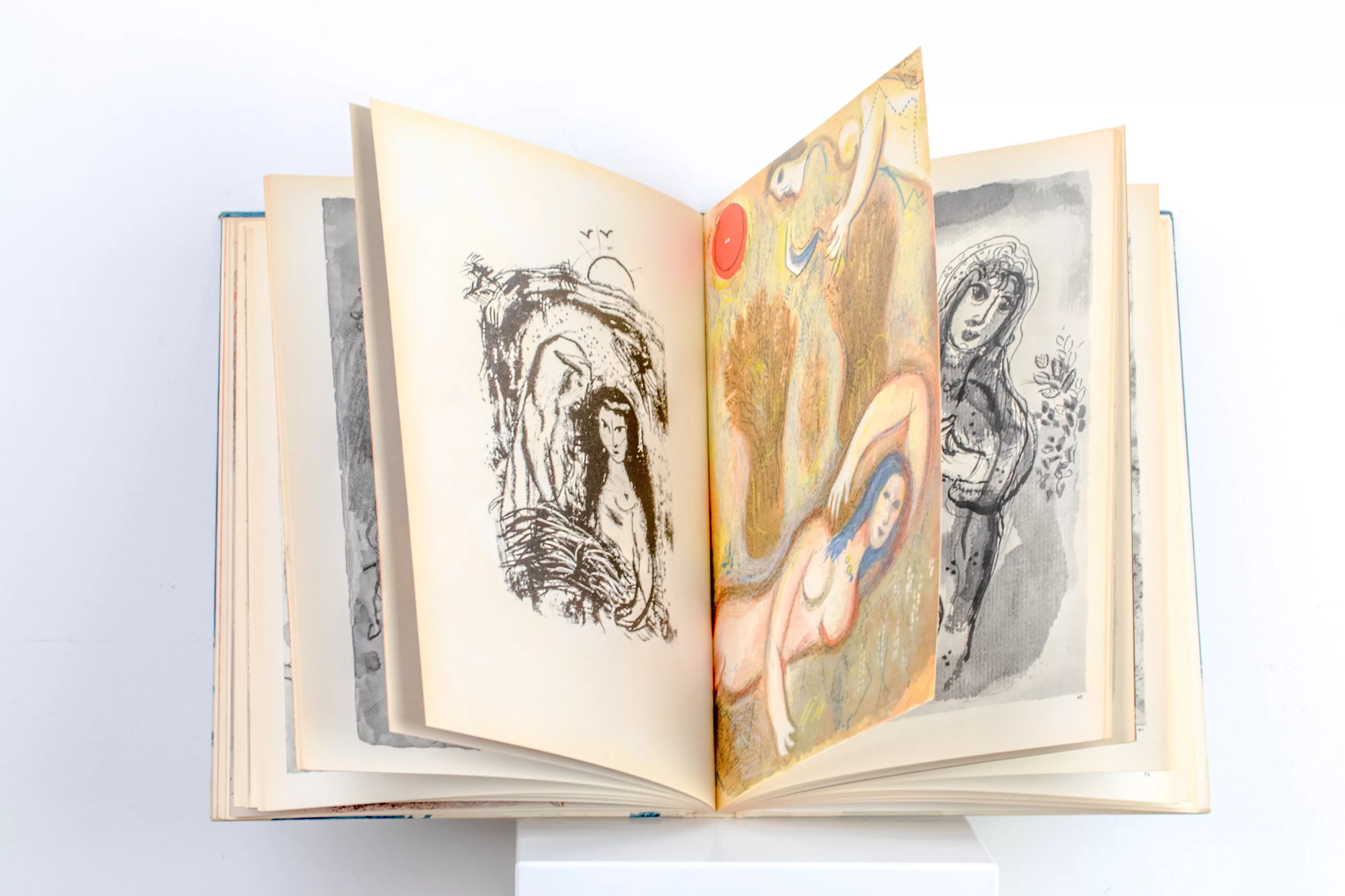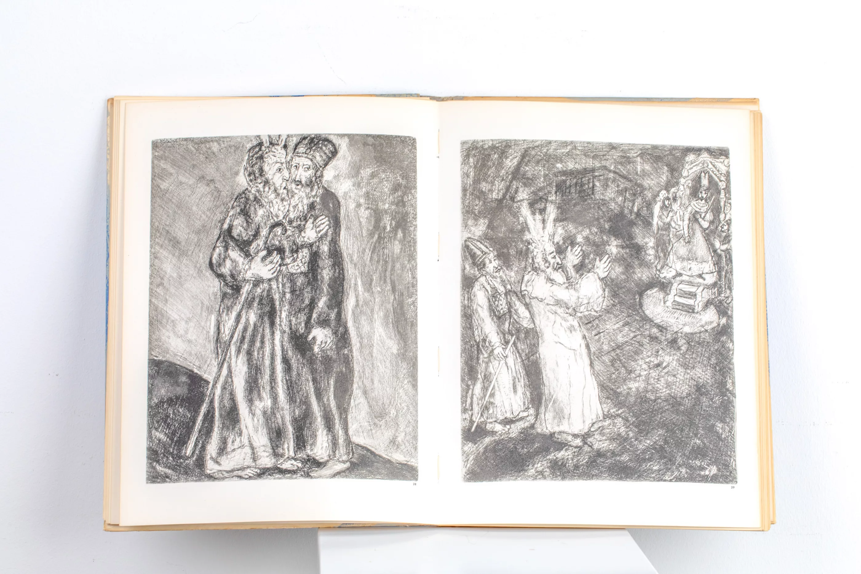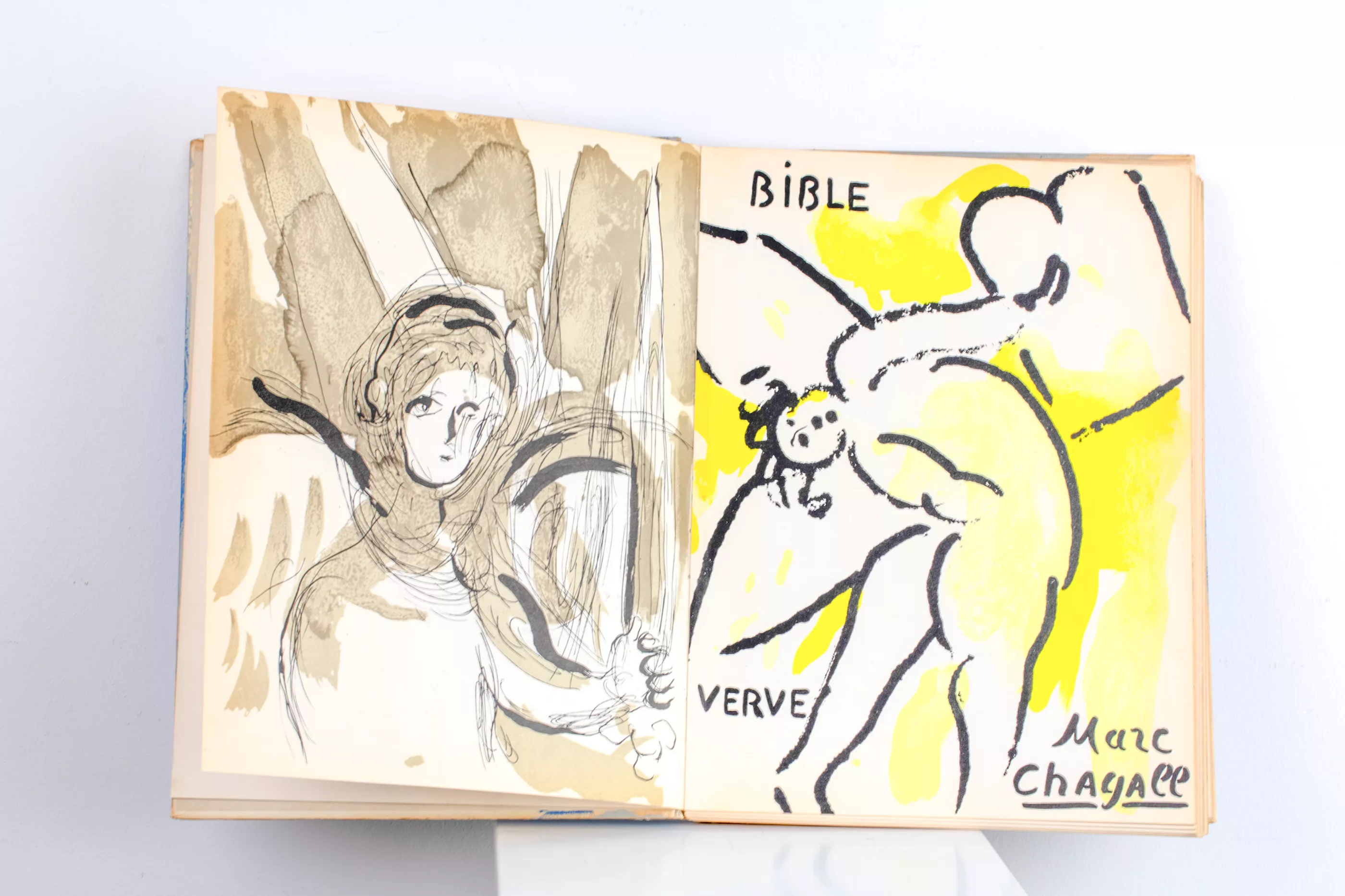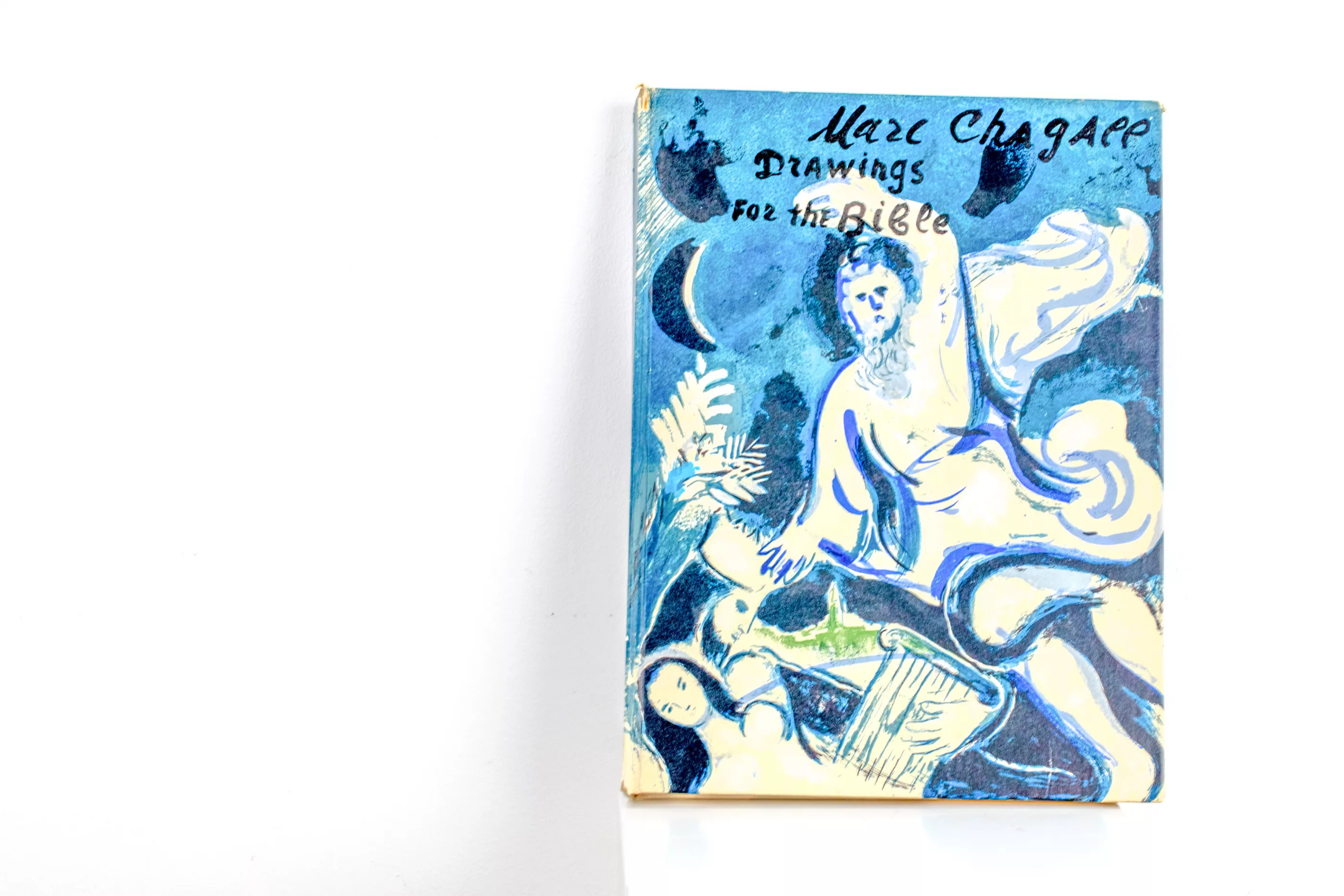and Company 1956, with 105 heliogravures after the complete etching cycle ''Illustrations for the Bible'' together with 16 colour and 12 black-and-white lithographs, printed at Mourlot, 36.5 × 27 cm (2) Drawings for the Bible by Marc Chagall, New York: Harcourt, Brace and Company 1960, with 96 heliogravures after drawings for the Bible and 24 colour lithographs, printed at Mourlot, each 36.5 × 27 cm, binding of the first volume loose, covers with edge wear, yellowed, partially soiled