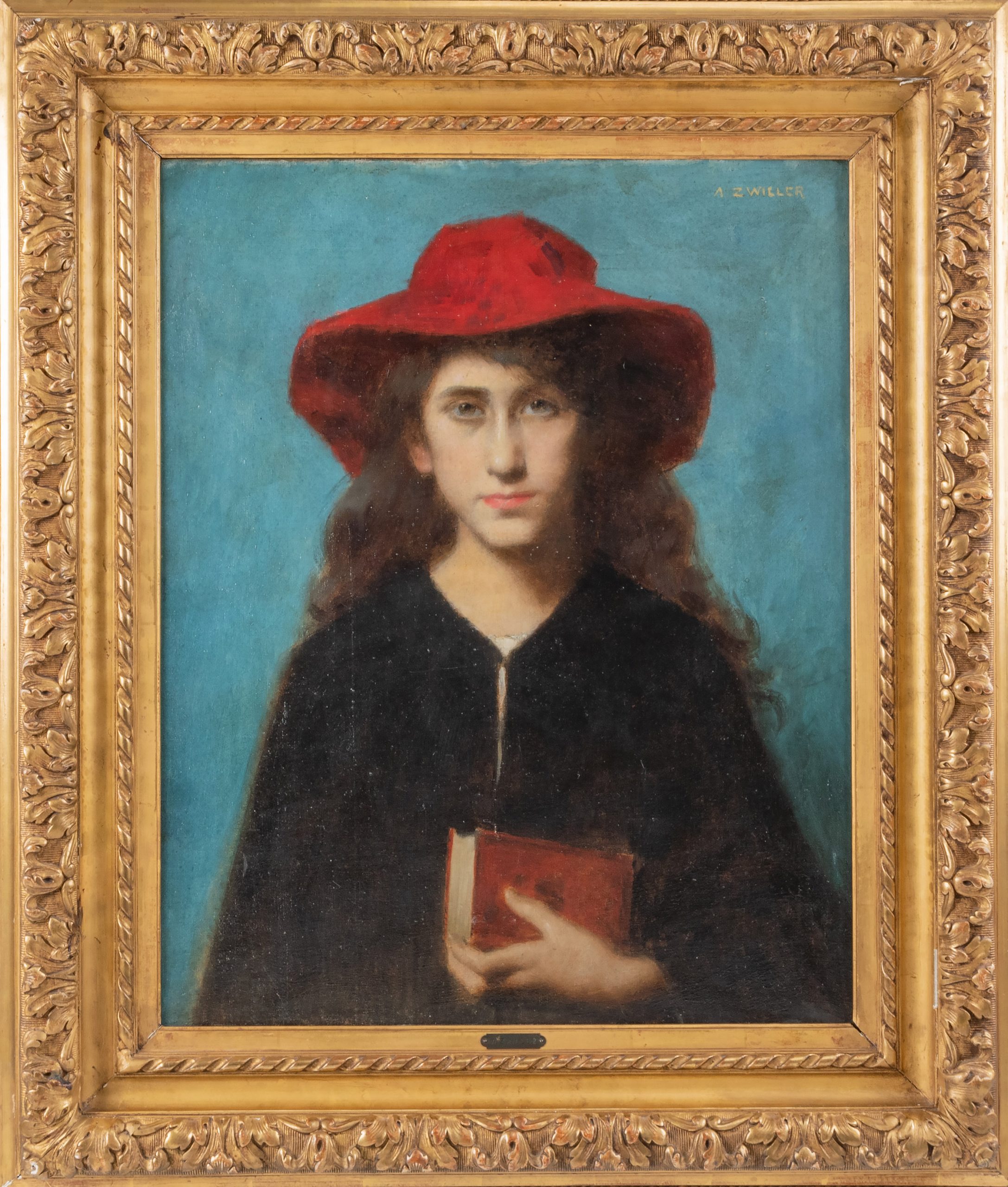 Jeune femme au chapeau rouge, Öl auf Leinwand, 61 cm x 50 cm, signiert, partiell retuschiert, leicht reinigungsbedürftig