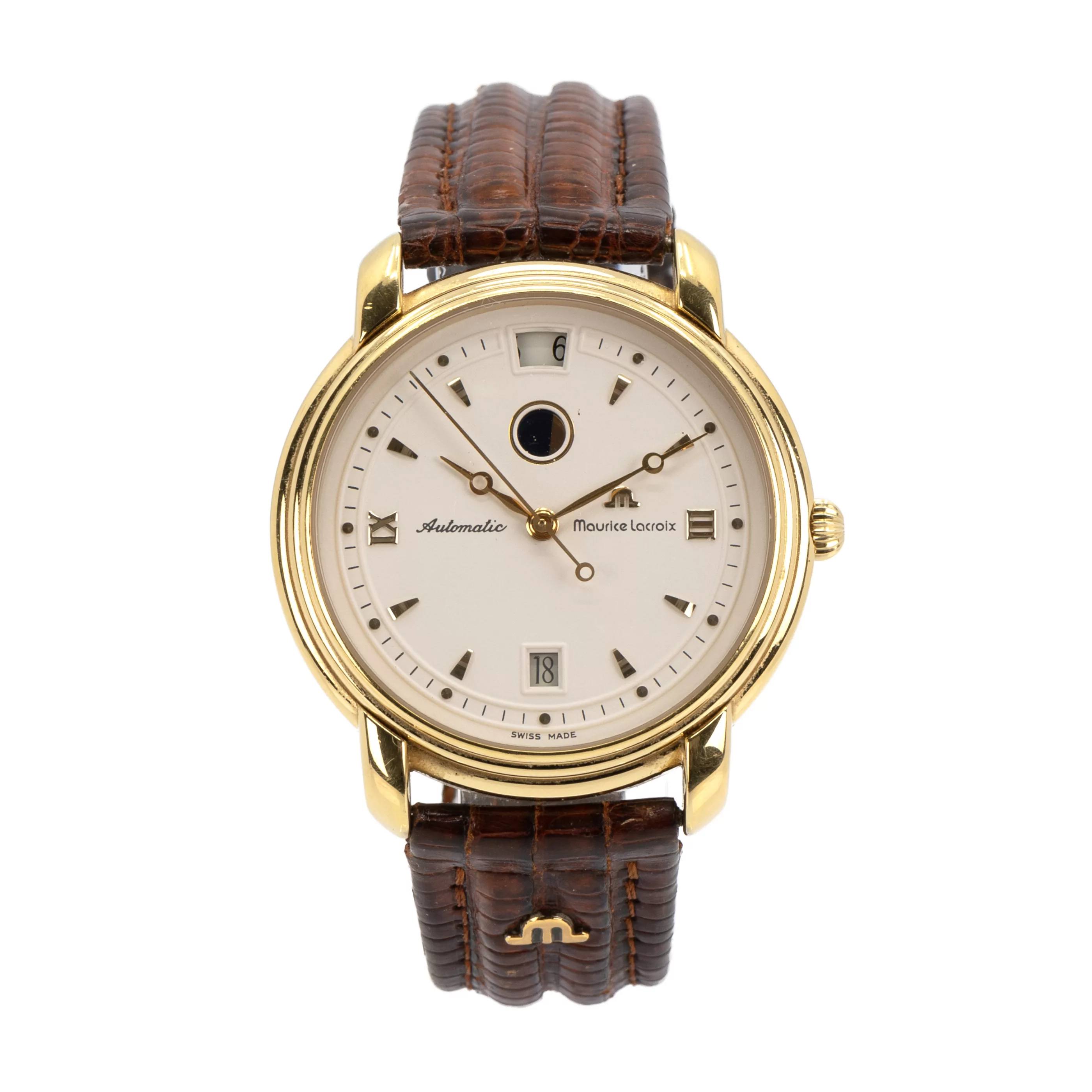 Automatik, Sichtboden, Gehäuse-Nr. 2919 | Ref.-Nr. 29399, Gehäuse Stahl, vergoldet, Durchmesser 38 mm, Original-Armband, Leder, Original-Schließe, Stahl, vergoldet, Länge 21 cm, verstellbar, Gesamtgewicht ca. 55,5 g, Funktion gangbar, geprüft, digitale Anzeige reparaturbedürftig, Zustand gut, leichte Gebrauchsspuren, Zustand und Funktionalität durch unseren Uhrmachermeister geprüft, ohne Original-Box oder -Papiere,