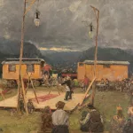 'Travelling circus', oil on wood, 39.5 cm x 50 cm, signed, also signed, titled and inscribed Charlottenburg on the reverse, reinforced on the reverse with inserted wooden strips, one of which is missing, small fixing holes in the upper corners, tiny holes caused by the wood pores in the upper half of the picture