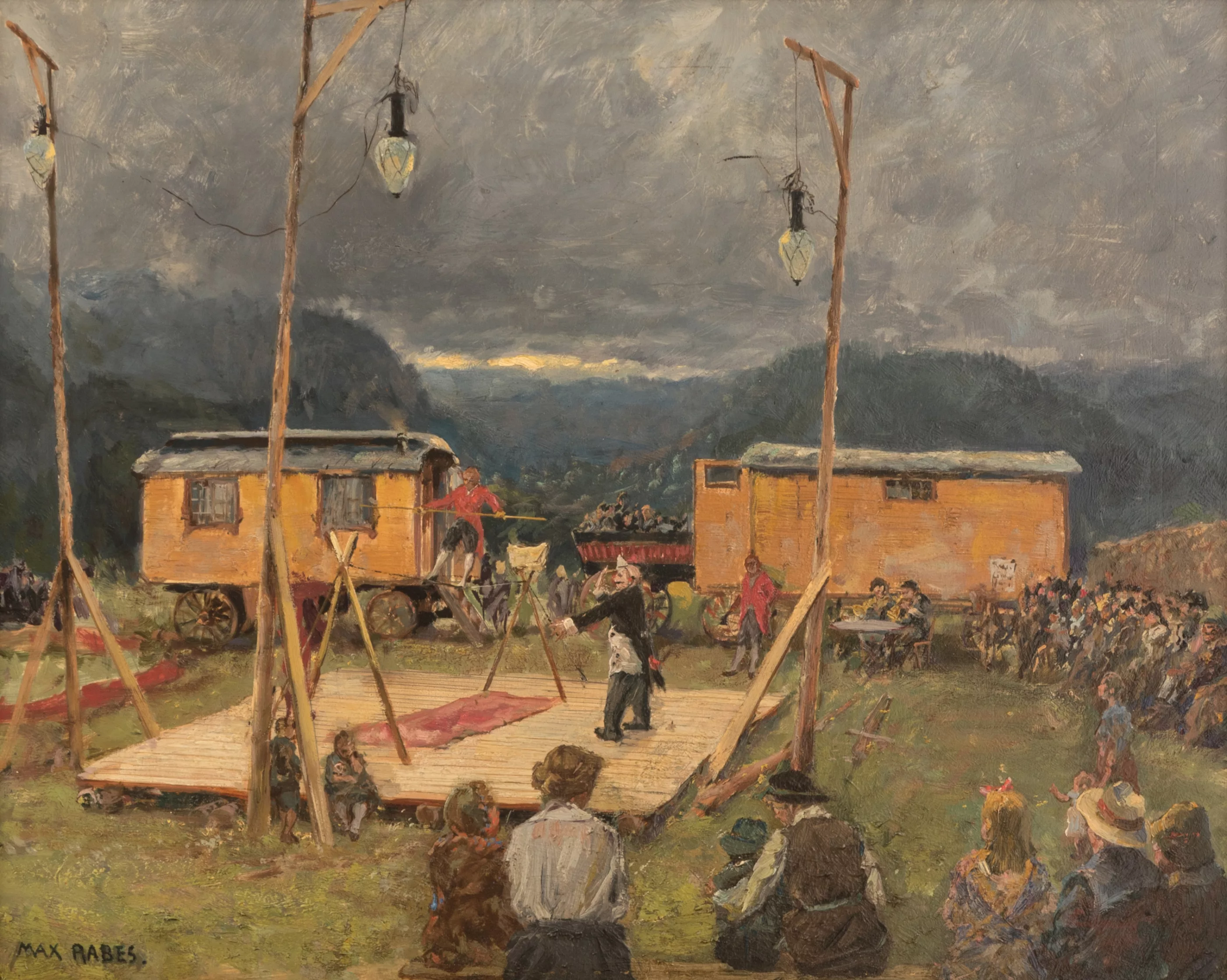 'Travelling circus', oil on wood, 39.5 cm x 50 cm, signed, also signed, titled and inscribed Charlottenburg on the reverse, reinforced on the reverse with inserted wooden strips, one of which is missing, small fixing holes in the upper corners, tiny holes caused by the wood pores in the upper half of the picture