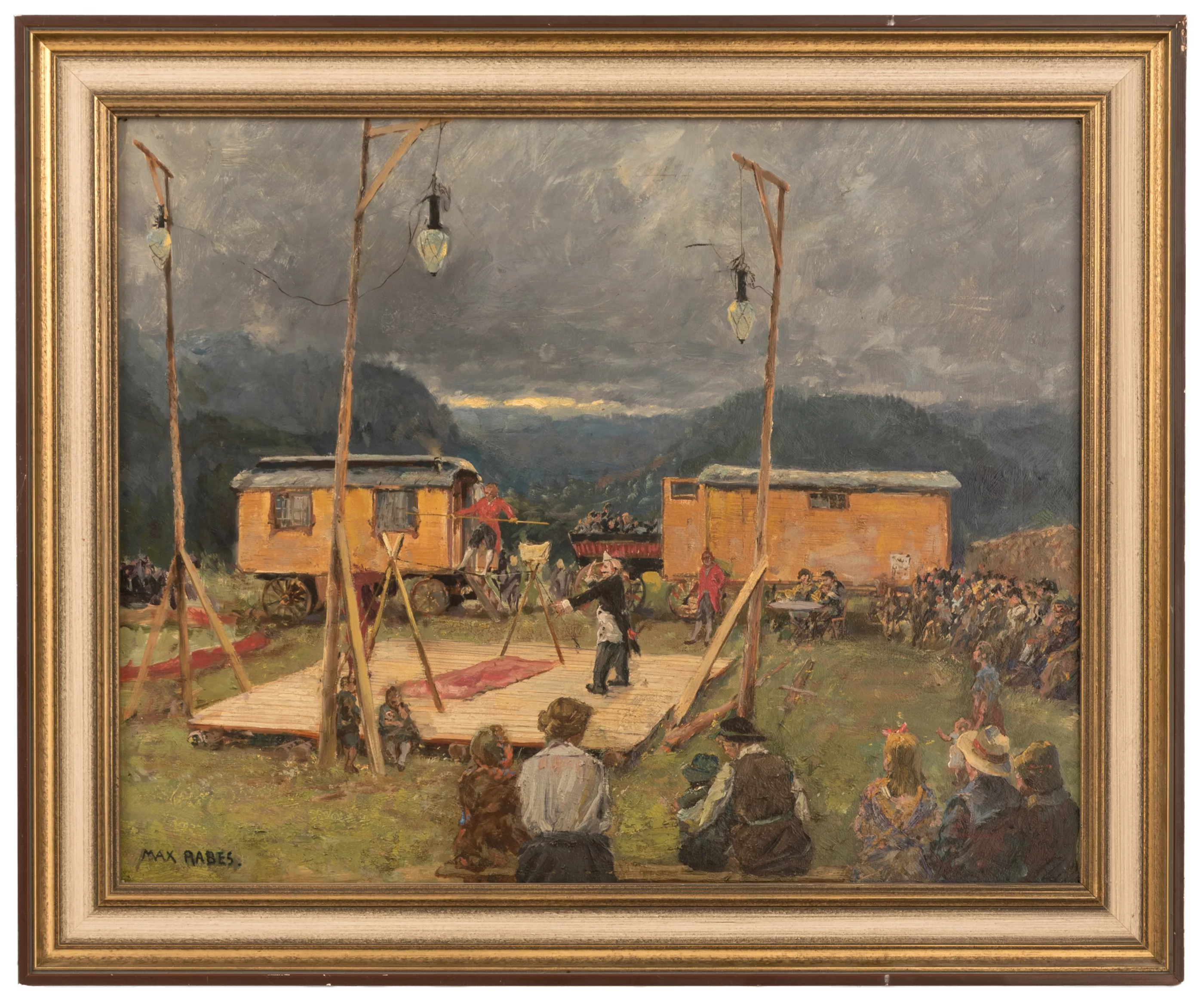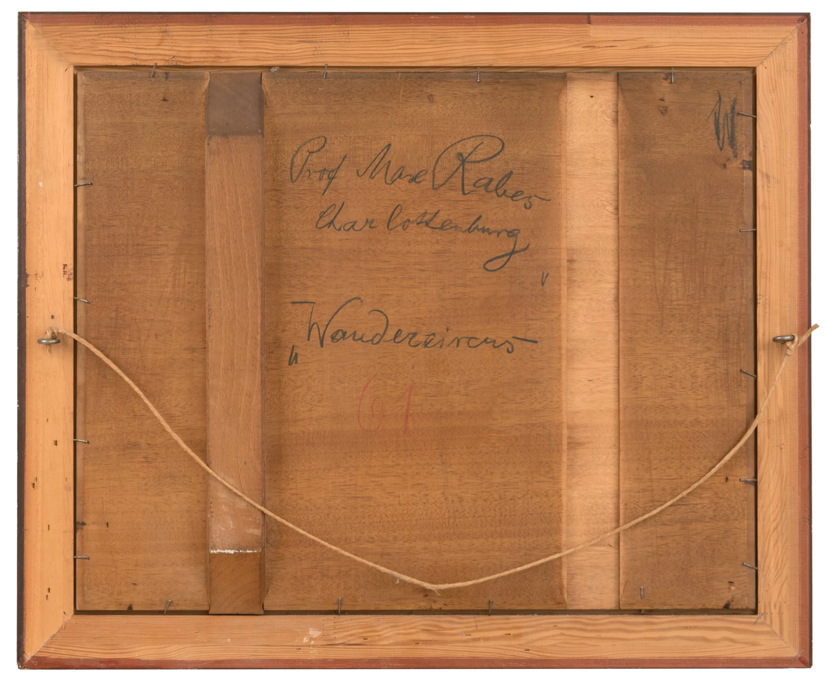 'Wanderzircus', Öl auf Holz, 39,5 cm x 50 cm Werkmaß, signiert, verso ebenfalls signiert, betitelt und Charlottenburg ortsbezeichnet, verso mit eingeschobenen Holzleisten verstärkt, davon eine absent, kleine Fixierungslöcher in den oberen Ecken, in der oberen Bildhälfte winzige Löcher durch die Holzporen verursacht