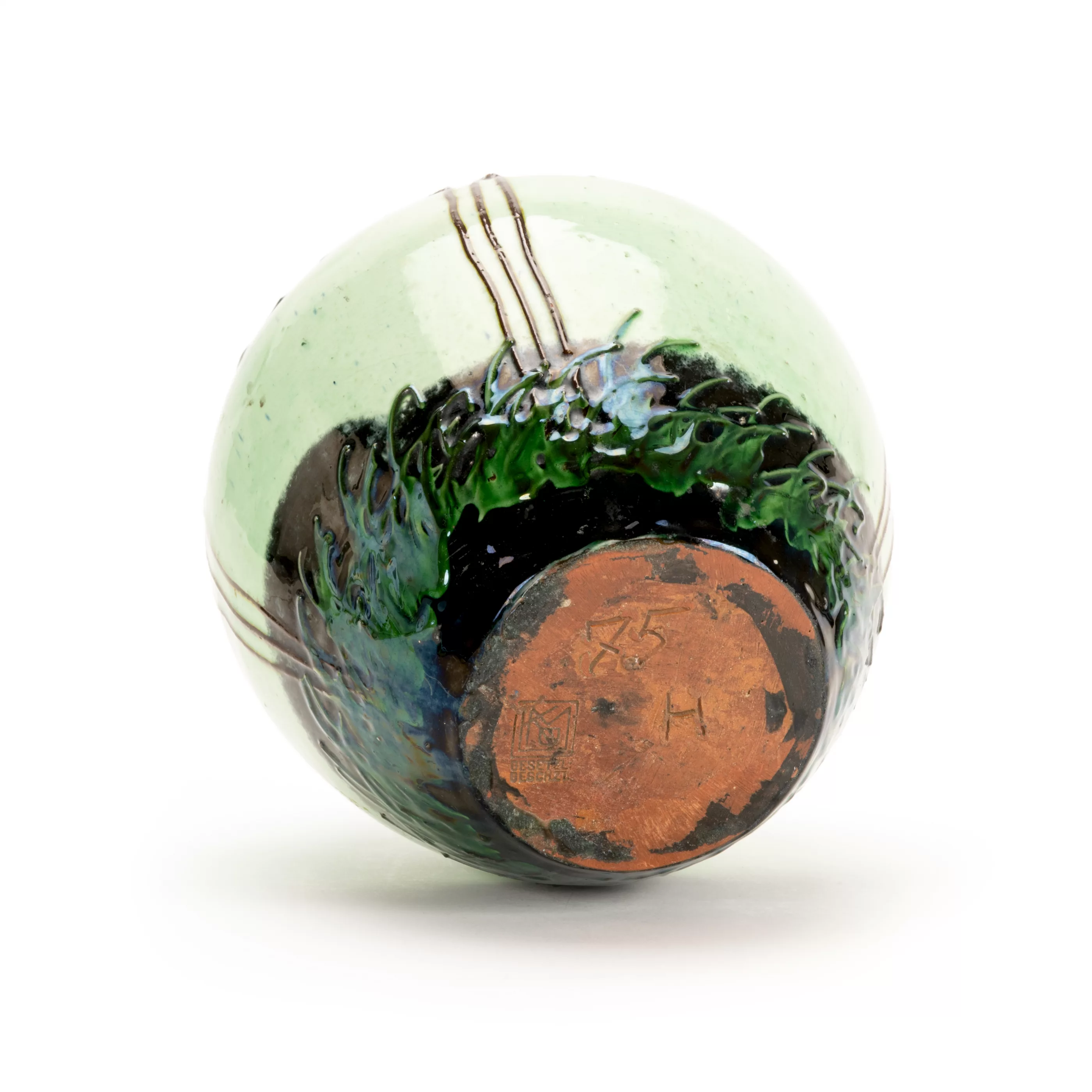 Majolika, schwarz und grün glasiert, Schlickerauftrag in Braun und Dunkelgrün, Höhe 22 cm, unterseitig mit Werkstattmarke MLK und gesetzl: geschzt. geprägt sowie 75 H geritzt, Zustand B, kleinere Altersspuren