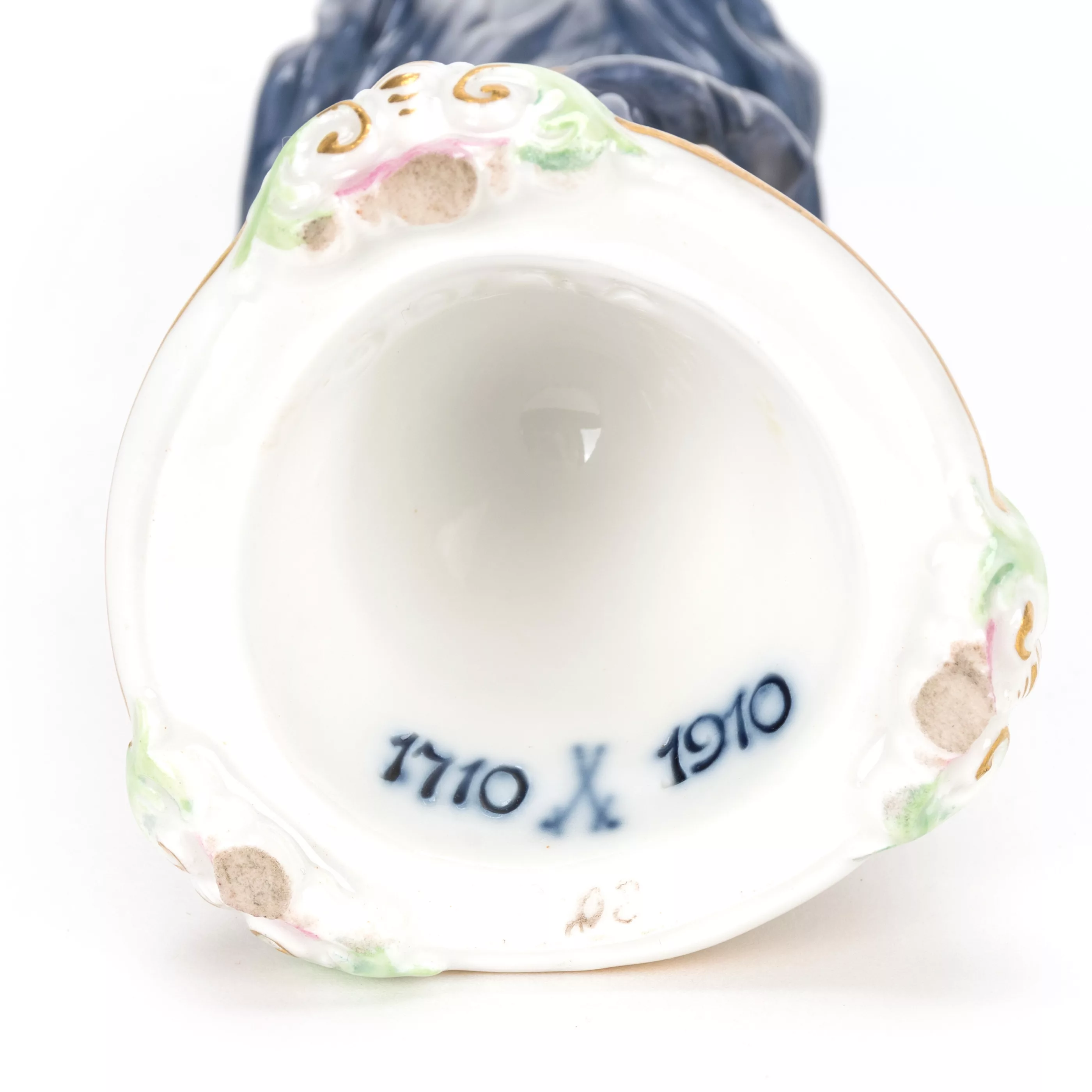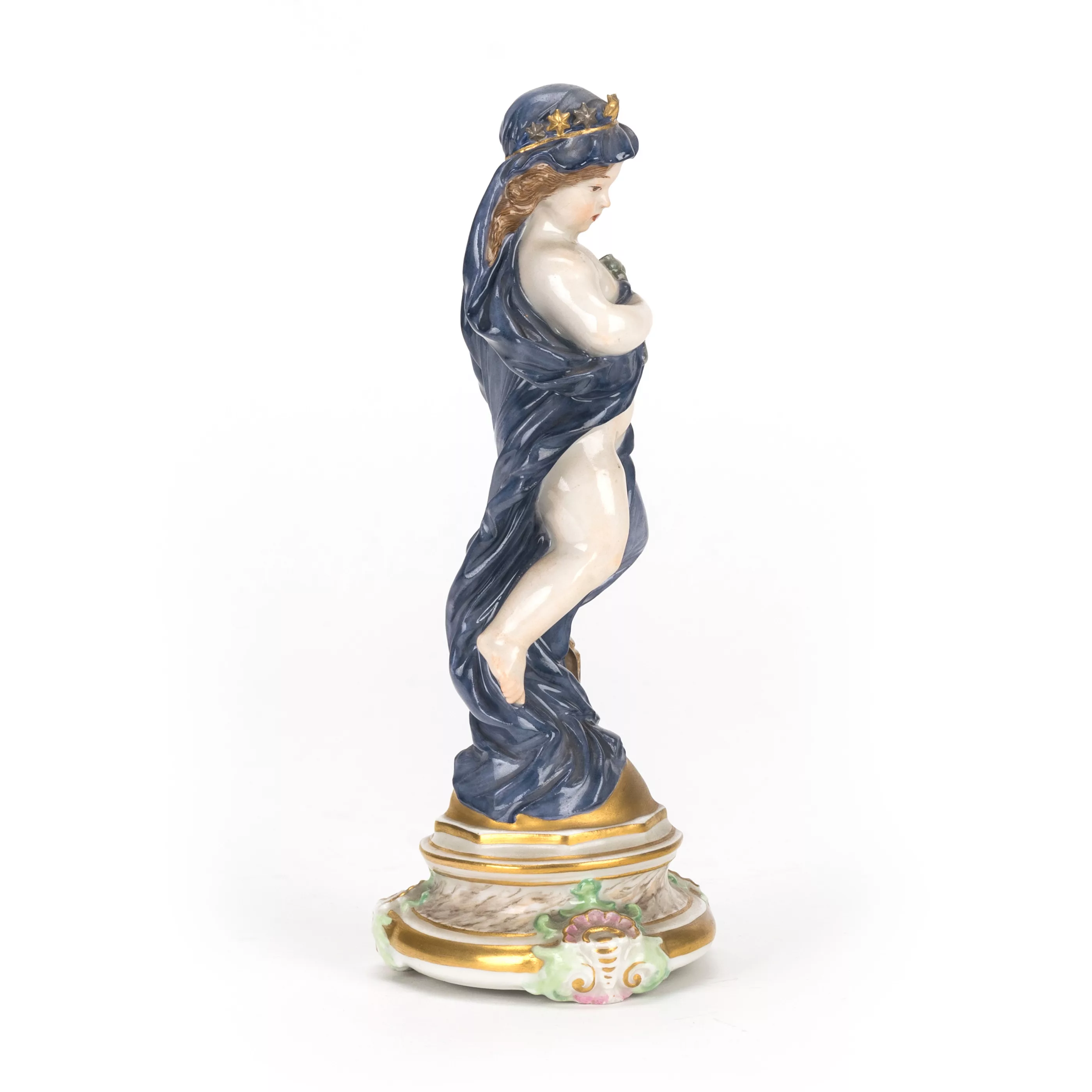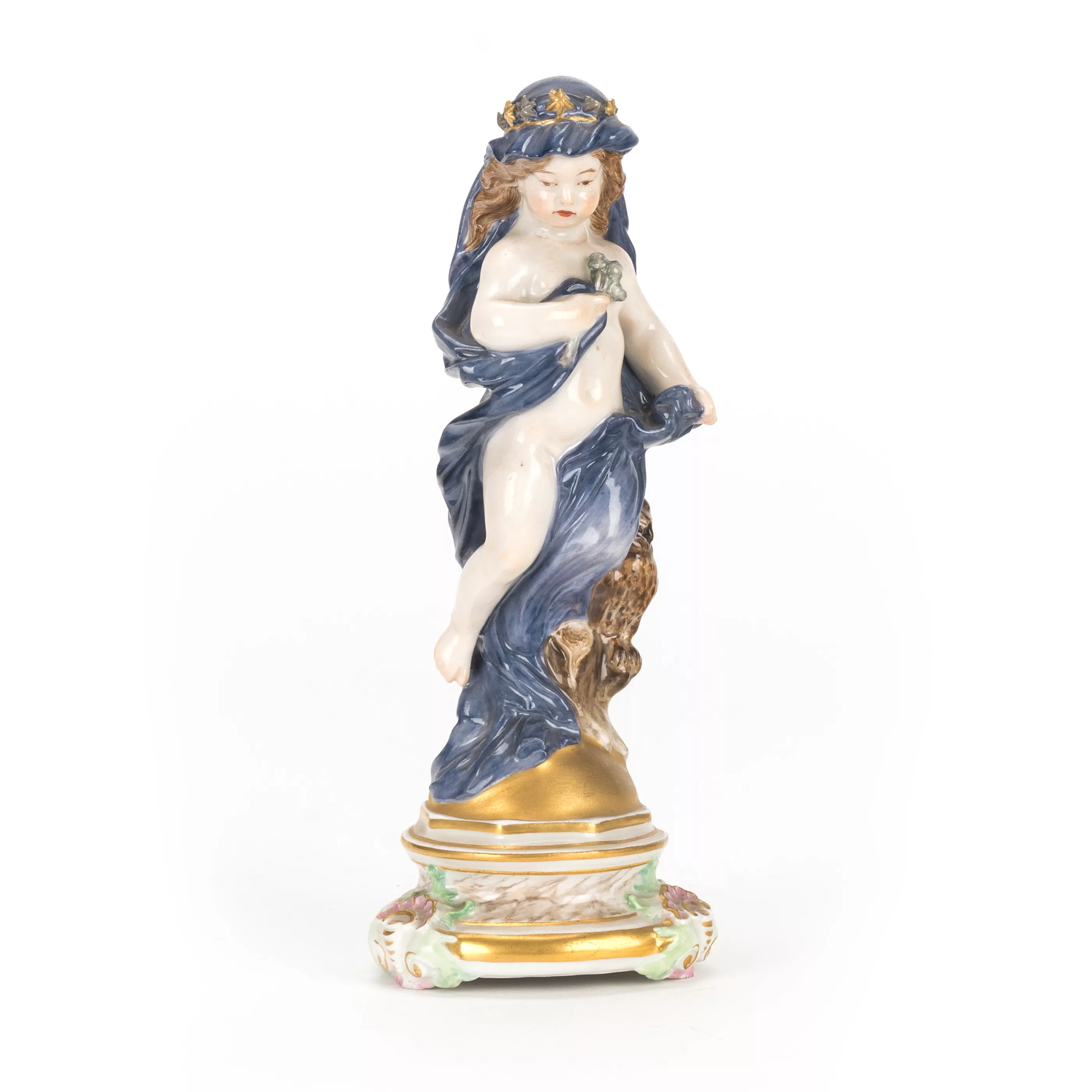 Meissen, design by Heinrich Schwabe (1847 - 1924) from 1880 - 1882, porcelain, painted in colour and decorated in gold, above a base a putto wrapped in a veil held by a crown of stars, holding 3 stalks with poppy capsules in his right hand, an owl sitting on a tree trunk at the feet of the putto on the base, height 17.5 cm, with manufactory mark and anniversary mark '1710 1910' on the underside, impressed number, model no. M 106, infinity mark on the occasion of the 200th anniversary, painter's mark, condition B, 2 small chips to the star crown