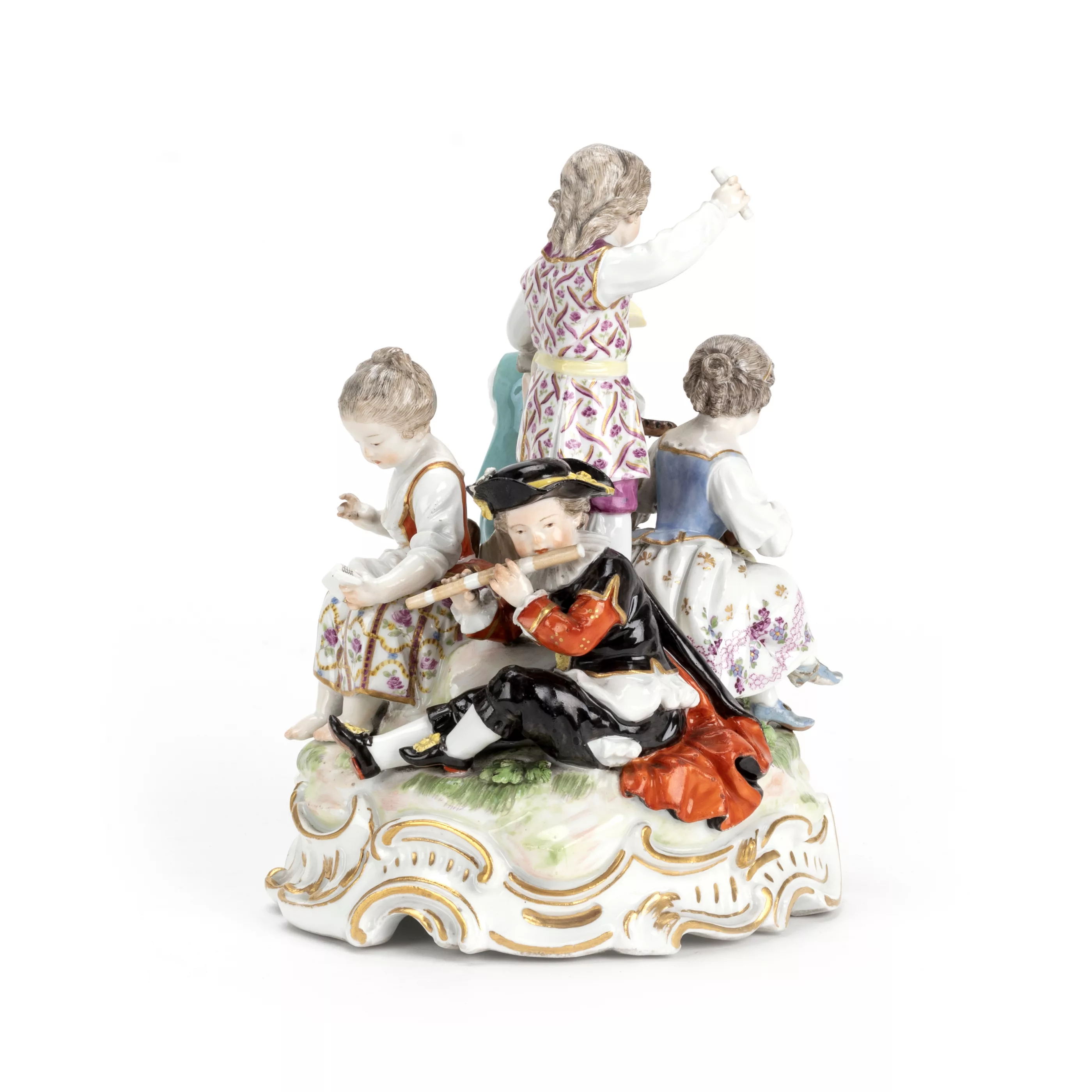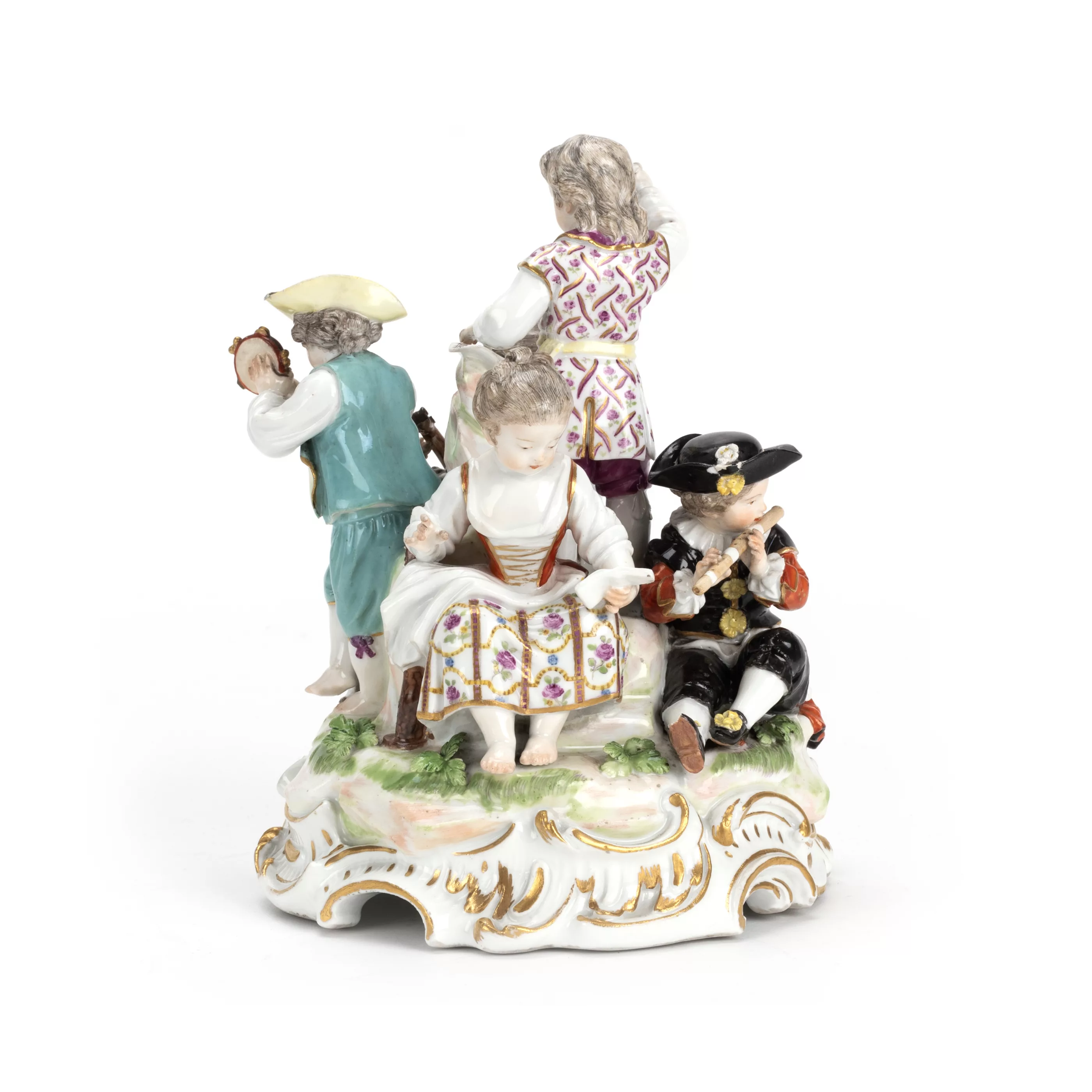 Meissen, Modell von M. V. Acier, Ausführung 1763-1773, Porzellan, farbig bemalt und gold staffiert, auf einem naturalistischen Sockel 5 Kinderfiguren, die zusammen musizieren, in der Mitte der Dirigent, ein Mädchen mit Laute, eine Sängerin, ein Flötist und ein Tamburinspieler, zu dessen Füßen ein Hund sitzt, Höhe 17 cm, Manufakturmarke, Pressmarken N 24. B und 34. B, Zustand C, mehrere restaurierte Stellen, partiell bestoßen