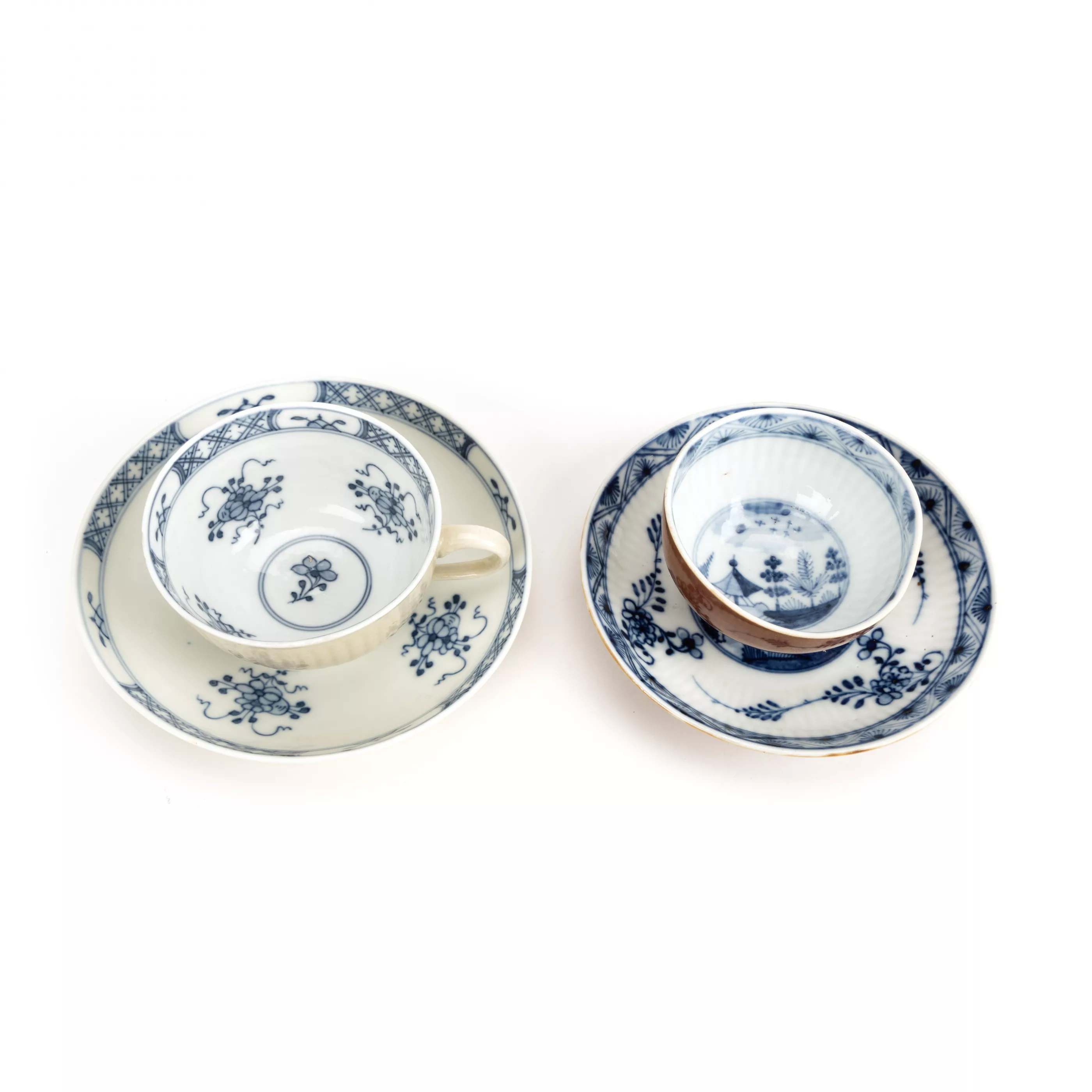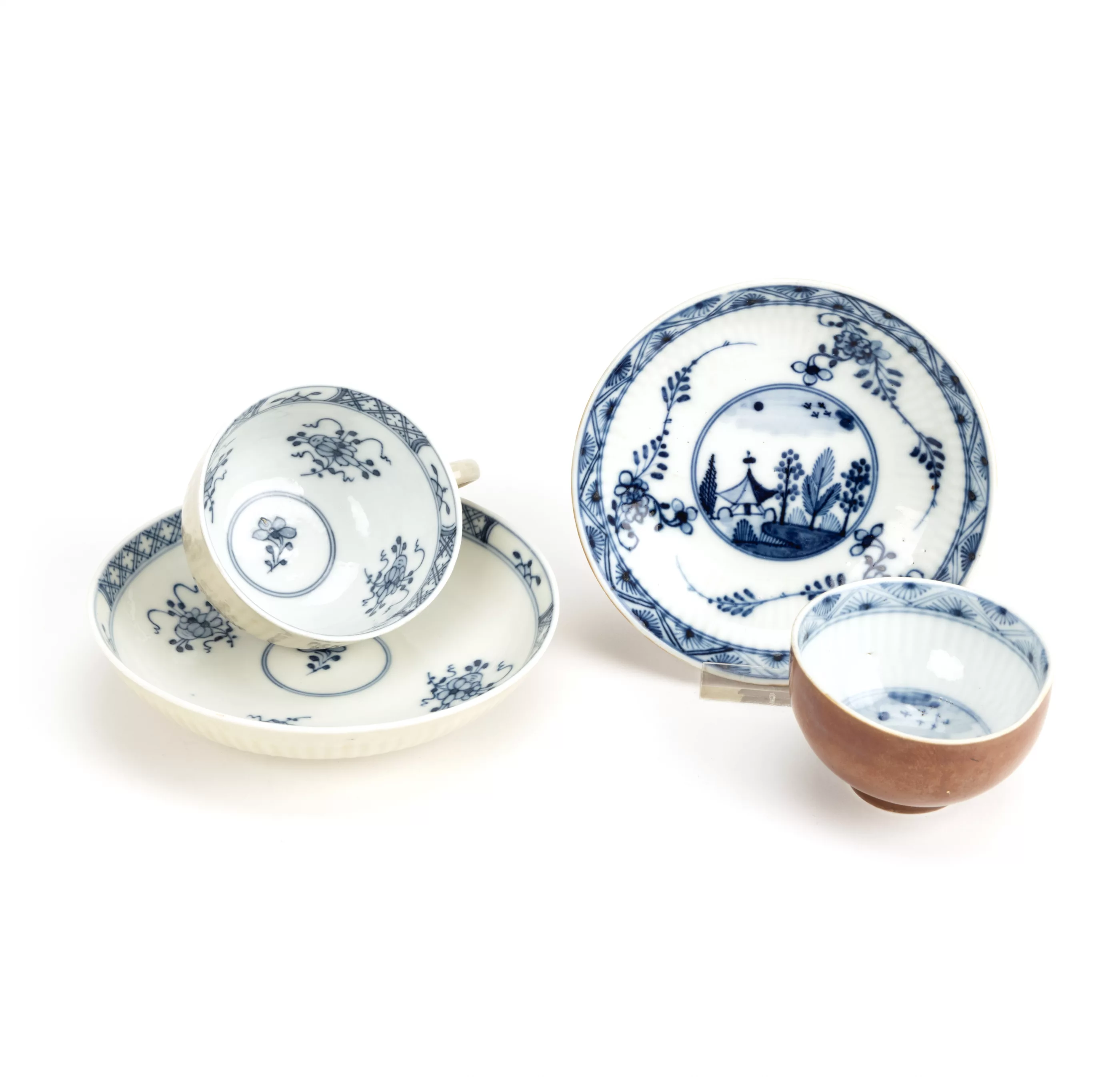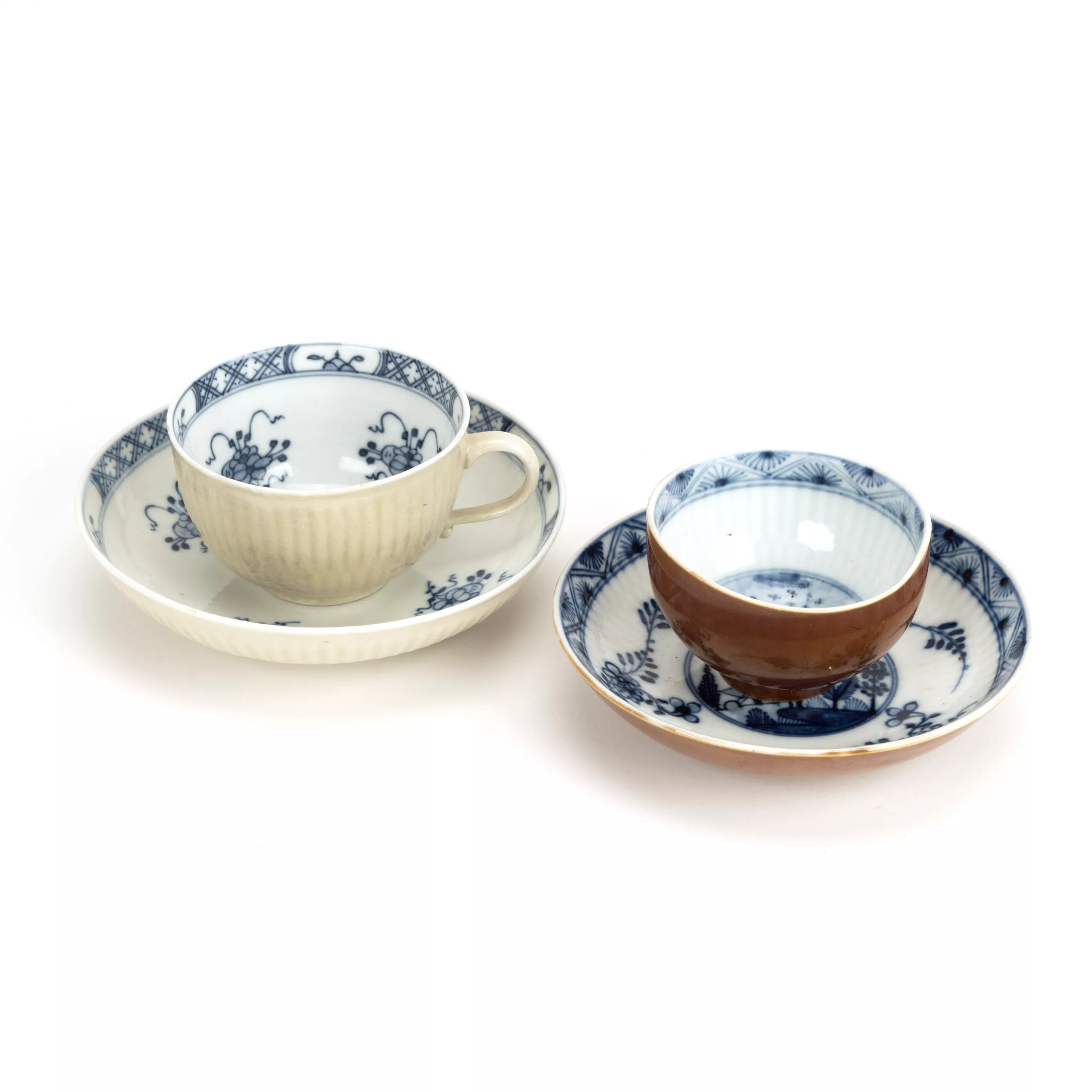 4-tlg., Meissen, Koppchen und Untertasse mit braunem Fond, um 1750/60, Außenseiten kapuzinerbrauner Fond, innen gerippt und dekoriert mit dem Dekor 'Chinesischer Garten mit Teehaus', H 4 cm, Ø UT 11,7 cm und Teetasse mit Untertasse mit Blümchendekor, um 1755, Außenseiten gerippt und mit hellem gelb-grauem Fond, blauer Blümchendekor, am Rand Gitterbordüre unterbrochen von Blümchenreserven, im Spiegel Medaillon mit Blume, H 4,8 cm, Ø UT 12,7 cm, Zustand B, Alters- und Gebrauchsspuren, Koppchen und Untertasse etwas deformiert