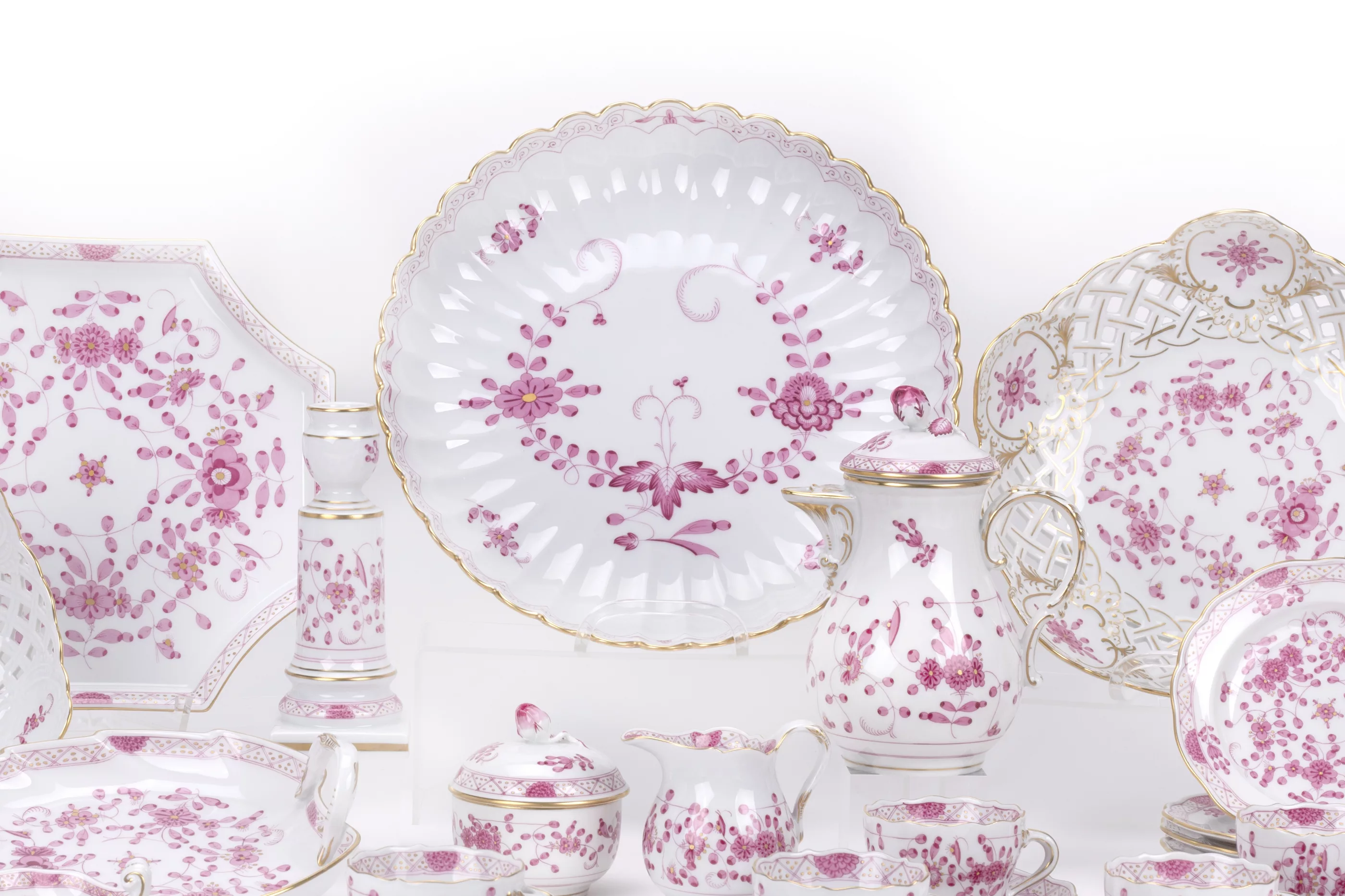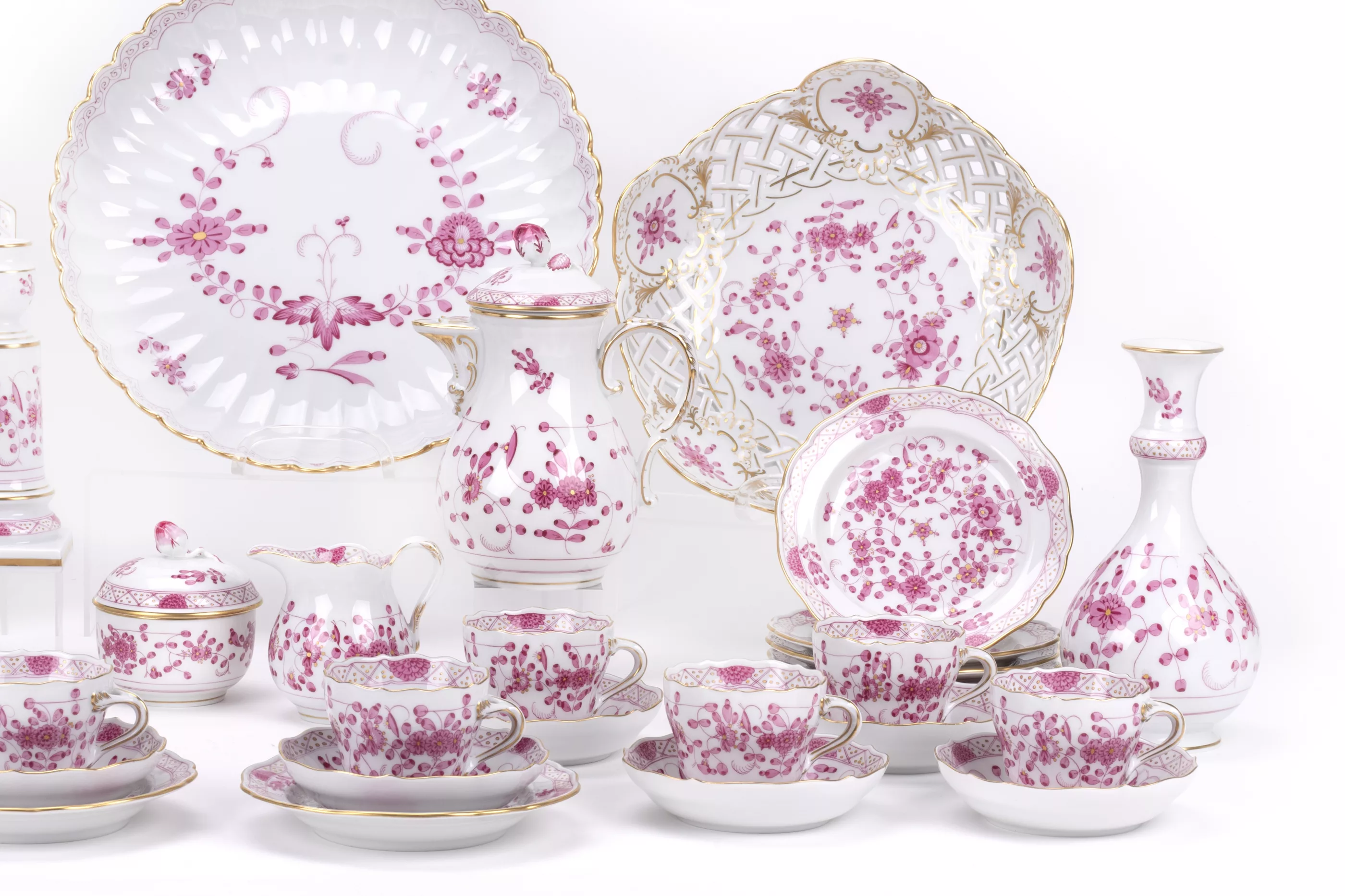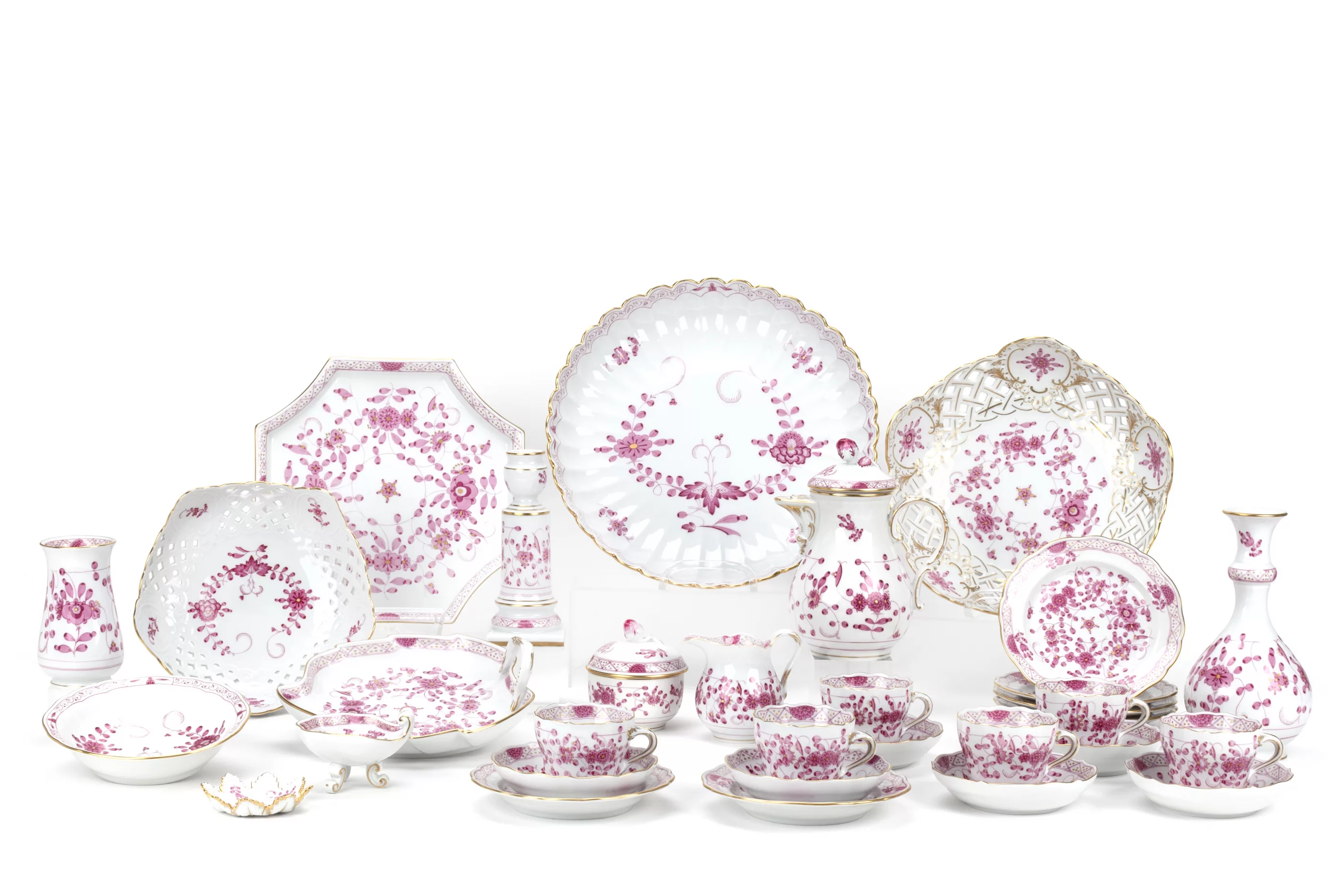 31-tlg., Meissen, Mitte/Ende 20. Jh., Porzellan, weiß, purpurfarben bemalt und gold staffiert, 1 Mokkakanne, Höhe 17,5 cm, 6 Mokkatassen und 6 Untertassen, 1 Milchkännchen, Höhe 8 cm, 1 Zuckerdose, 2 Vasen, Höhe 10,5 und 17,8 cm, 1 Kerzenständer mit Tropfschale, Höhe 17 cm, 1 kleine Korbschale, 1 gr. Korbschale, Ø 22,5 cm, 1 Schälchen in Muschelform auf Füßen, 1 kl. Schale, 1 runder, mehrpassiger Teller, Ø 27,3 cm, 1 Blattschale, 1 oktogonaler Gebäckteller, 6 kl. Gebäckteller, alle Teile mit Manufakturmarke, Malermarke und Modellnummern, 3 Teile mit 2 Schleifstrichen, Zustand A