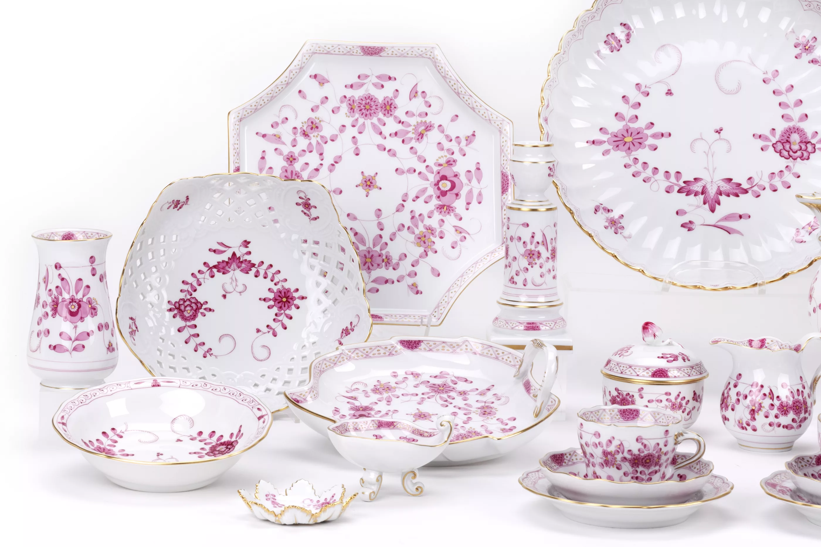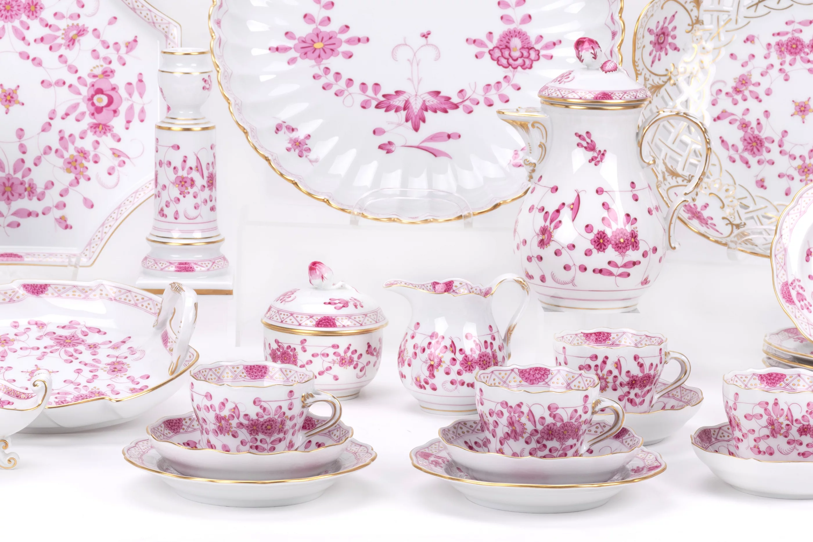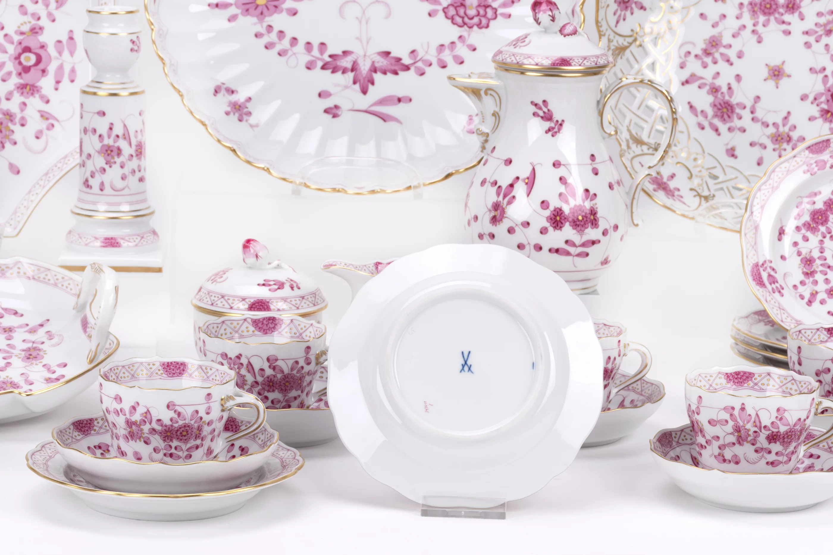 31-tlg., Meissen, Mitte/Ende 20. Jh., Porzellan, weiß, purpurfarben bemalt und gold staffiert, 1 Mokkakanne, Höhe 17,5 cm, 6 Mokkatassen und 6 Untertassen, 1 Milchkännchen, Höhe 8 cm, 1 Zuckerdose, 2 Vasen, Höhe 10,5 und 17,8 cm, 1 Kerzenständer mit Tropfschale, Höhe 17 cm, 1 kleine Korbschale, 1 gr. Korbschale, Ø 22,5 cm, 1 Schälchen in Muschelform auf Füßen, 1 kl. Schale, 1 runder, mehrpassiger Teller, Ø 27,3 cm, 1 Blattschale, 1 oktogonaler Gebäckteller, 6 kl. Gebäckteller, alle Teile mit Manufakturmarke, Malermarke und Modellnummern, 3 Teile mit 2 Schleifstrichen, Zustand A