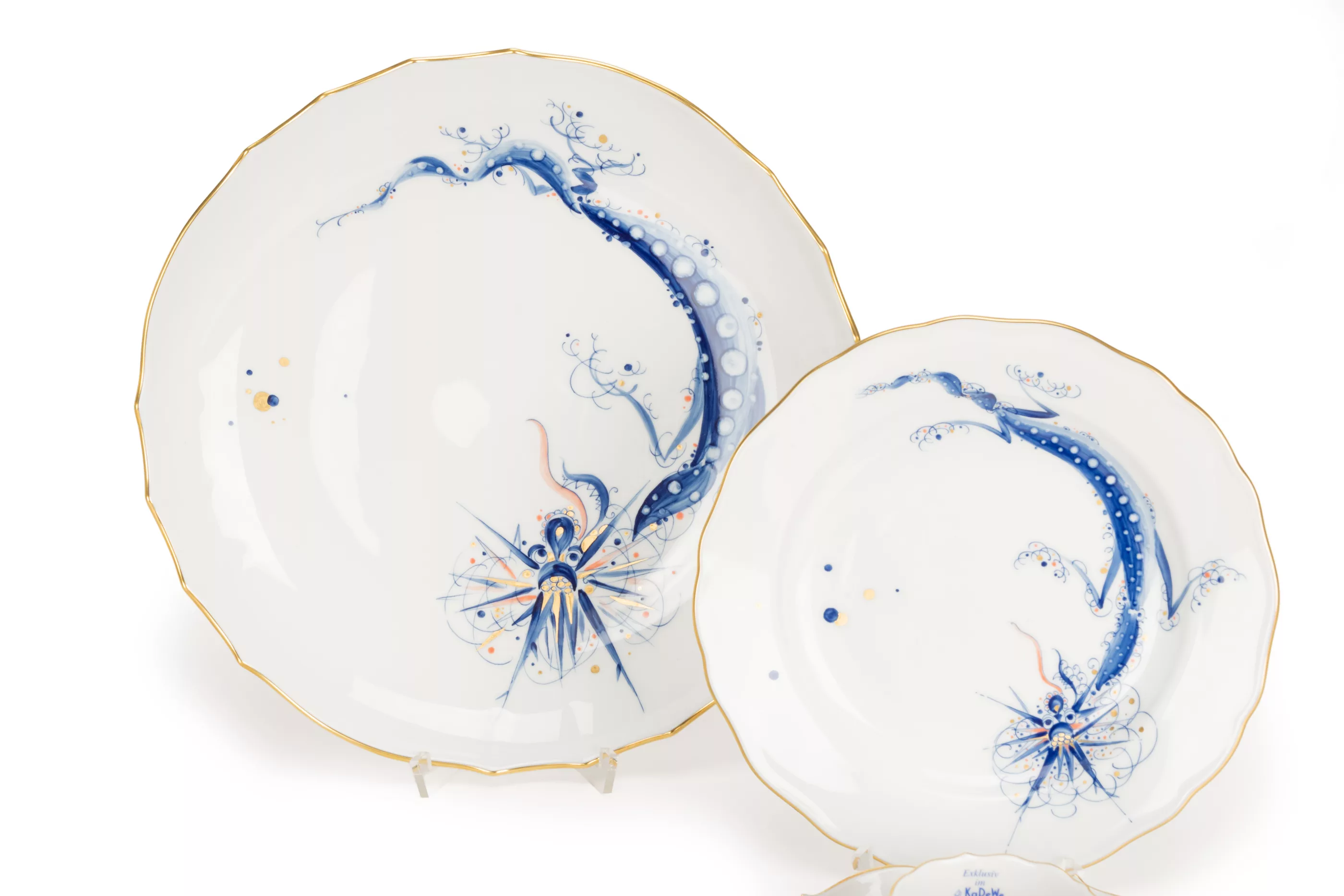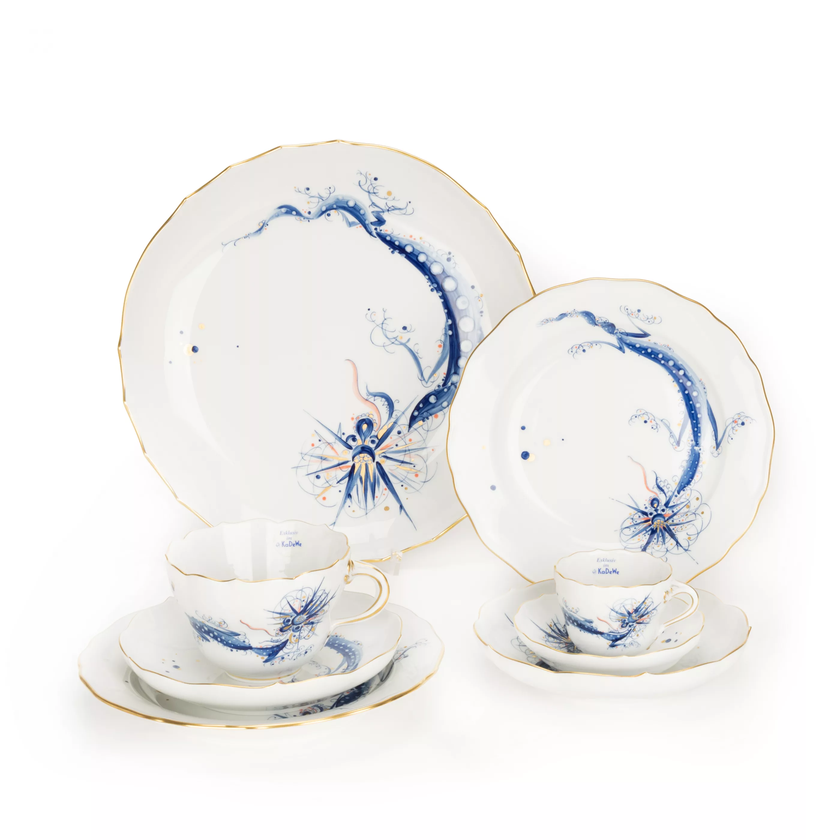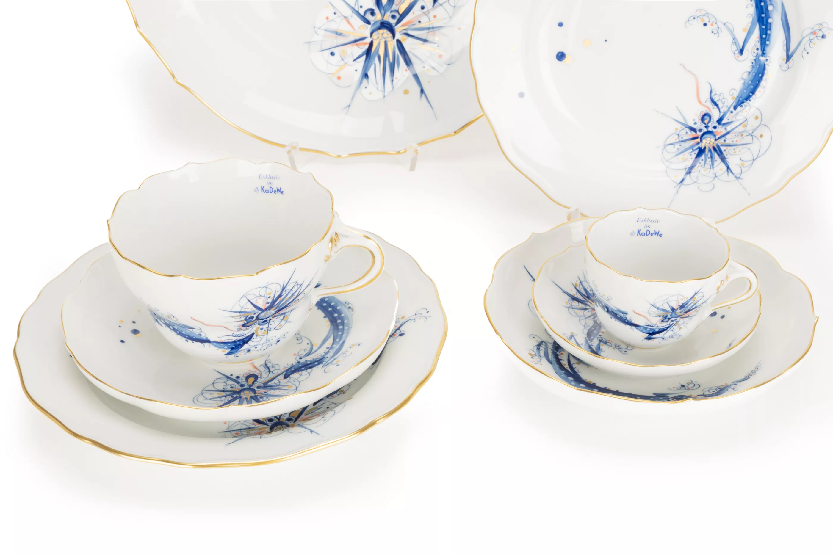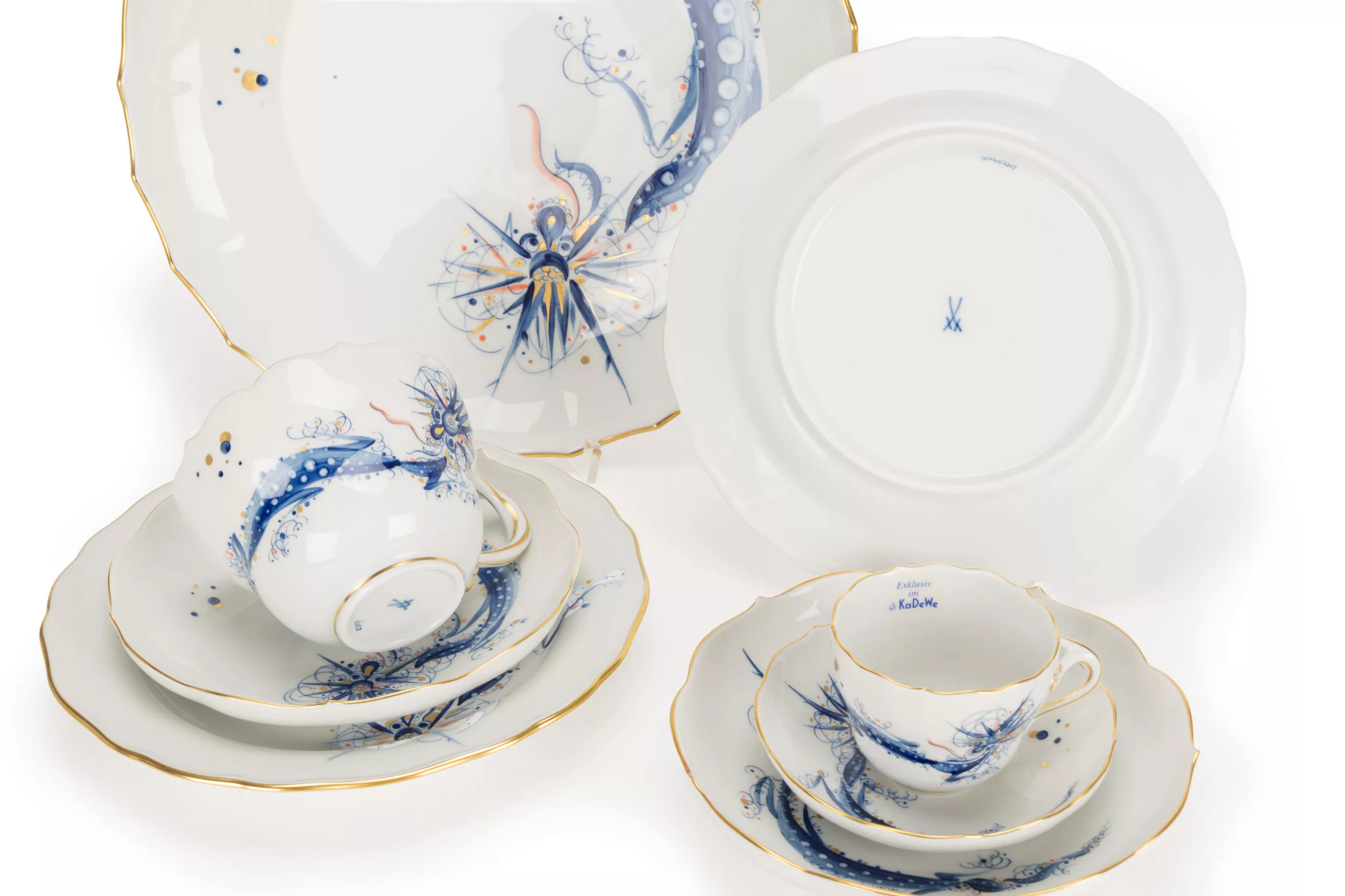 8-piece set, Meissen, 2001, porcelain, white, polychrome painted and gold painted, Meissen special edition for the KaDeWe in Berlin, 1 coffee cup, h 7 cm, 2 saucers, 2 cake plates, Ø 20 cm, 1 demitasse cup and 1 saucer, 1 large bowl, Ø 28 cm, manufacturer's mark, painter's marks, press number, one plate with year mark, 2 pieces with KaDeWe sticker, condition A