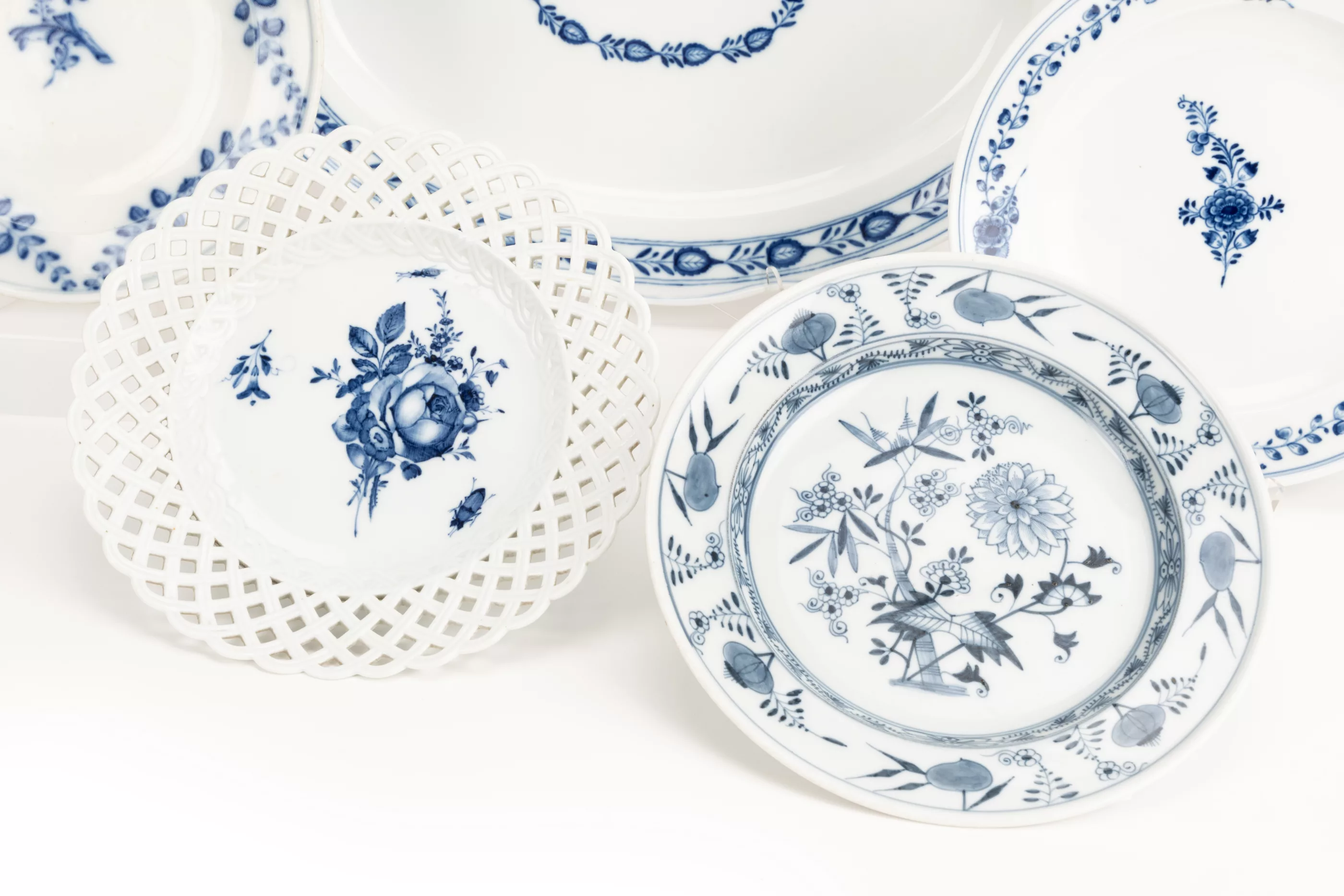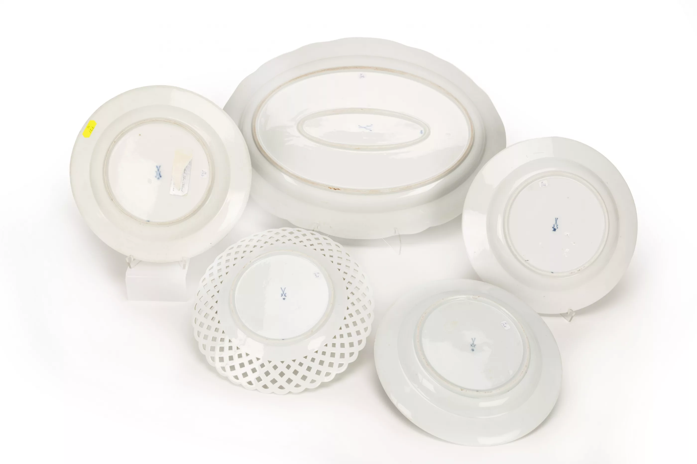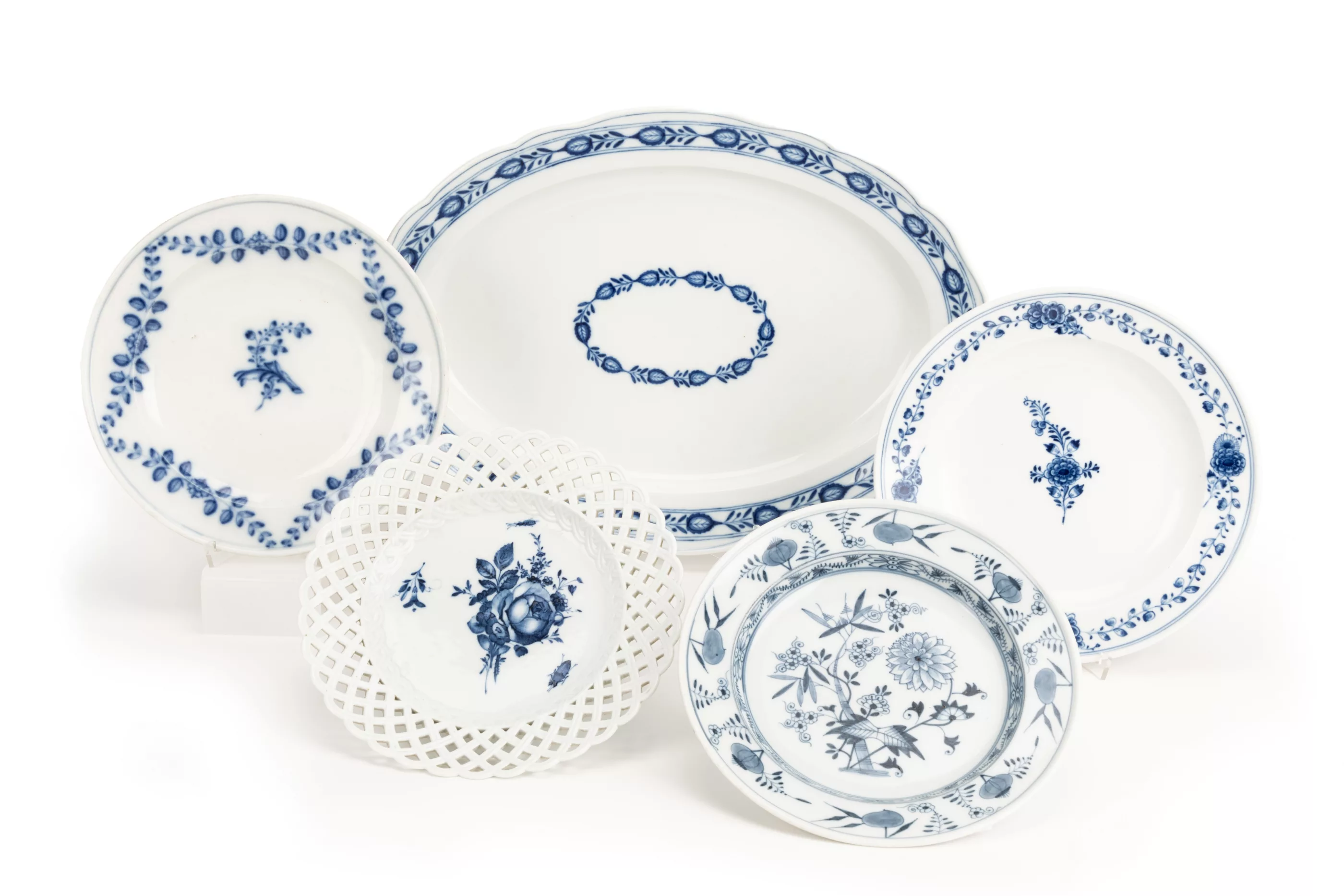 5-tlg., Meissen, 18. und 19. Jh., Porzellan, weiß, blau bemalt, 1 große Vorlege- oder Speiseplatte, um 1820, Blaumalerei mit Blätterkantenmuster, L 46 cm, 1 Teller mit ausgeschnittenem Rand, Ende 18. Jh., blaue Blumen- und Insektenmalerei, Ø 23,5 cm, 1 blauer Zwiebelmusterteller, Ende 18. Jh., Ø 23,5 cm, 1 Speiseteller mit Blumenkranzdekor, 3. Viertel 18. Jh., Fahne mit blauem Blumenkranz, außen Doppelring, im Spiegel Blütenzweig, Ø 25 cm und 1 Speiseteller mit Festonmuster, um 1800, Blumengirlande auf der Fahne und Blumen im Spiegel, Zustand B, alle Teile mit Alters- und Gebrauchsspuren