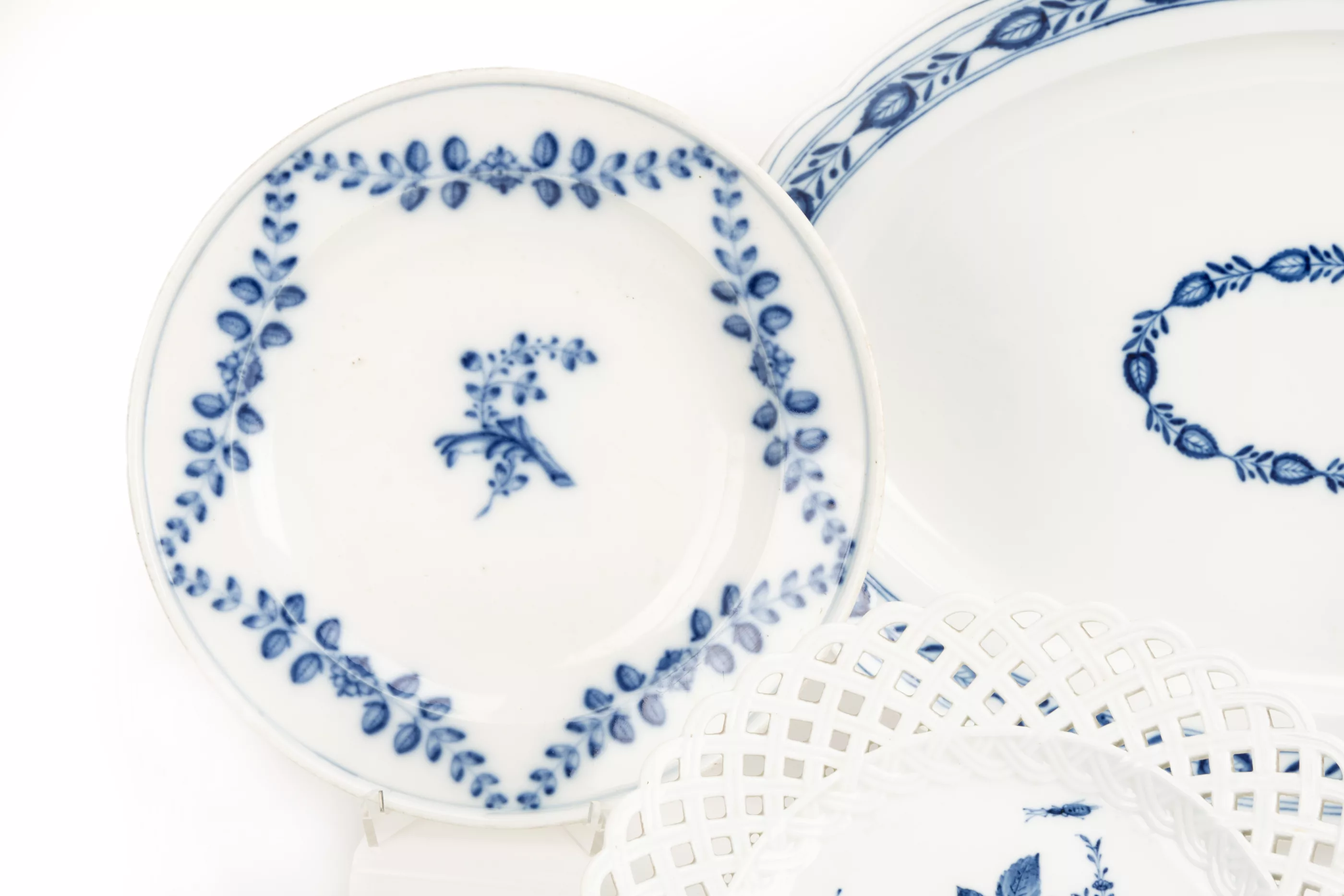 5-piece set, Meissen, 18th and 19th century, porcelain, white, painted blue, 1 large serving or dinner plate, c. 1820, blue painting with leaf edge pattern, l 46 cm, 1 plate with cut-out rim, late 18th century, blue flower and insect painting, Ø 23.5 cm, 1 blue onion pattern plate, late 18th century, Ø 23.5 cm, 1 dinner plate with floral wreath decoration, 3rd quarter 18th century, flag with blue floral wreath, double ring on the outside, branch of flowers in the mirror, Ø 25 cm and 1 dinner plate with festoon pattern, c. 1800, garland of flowers on the flag and flowers in the mirror, condition B, all items with signs of age and wear