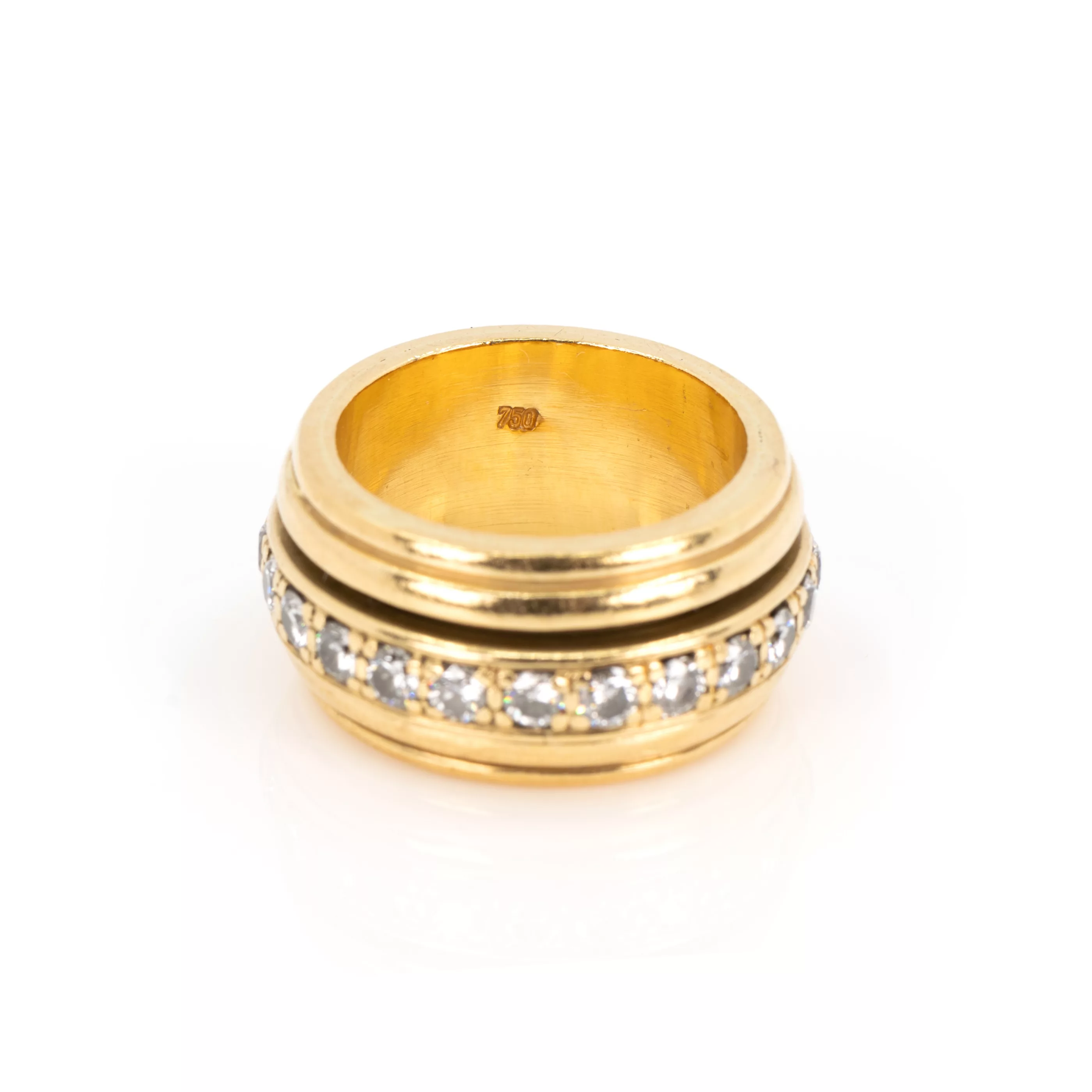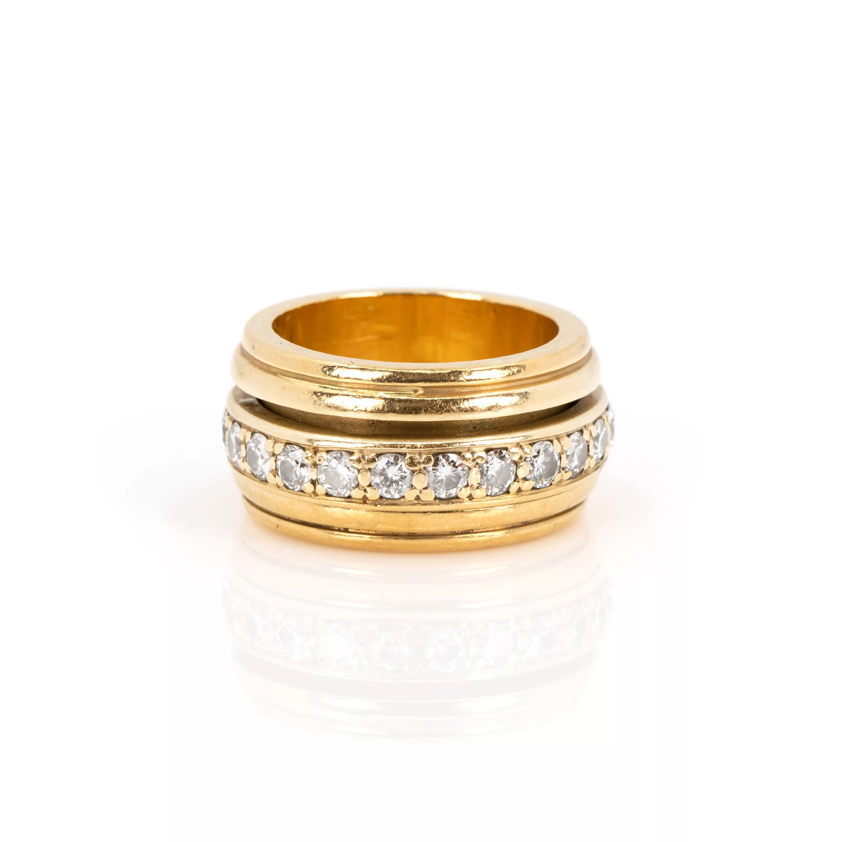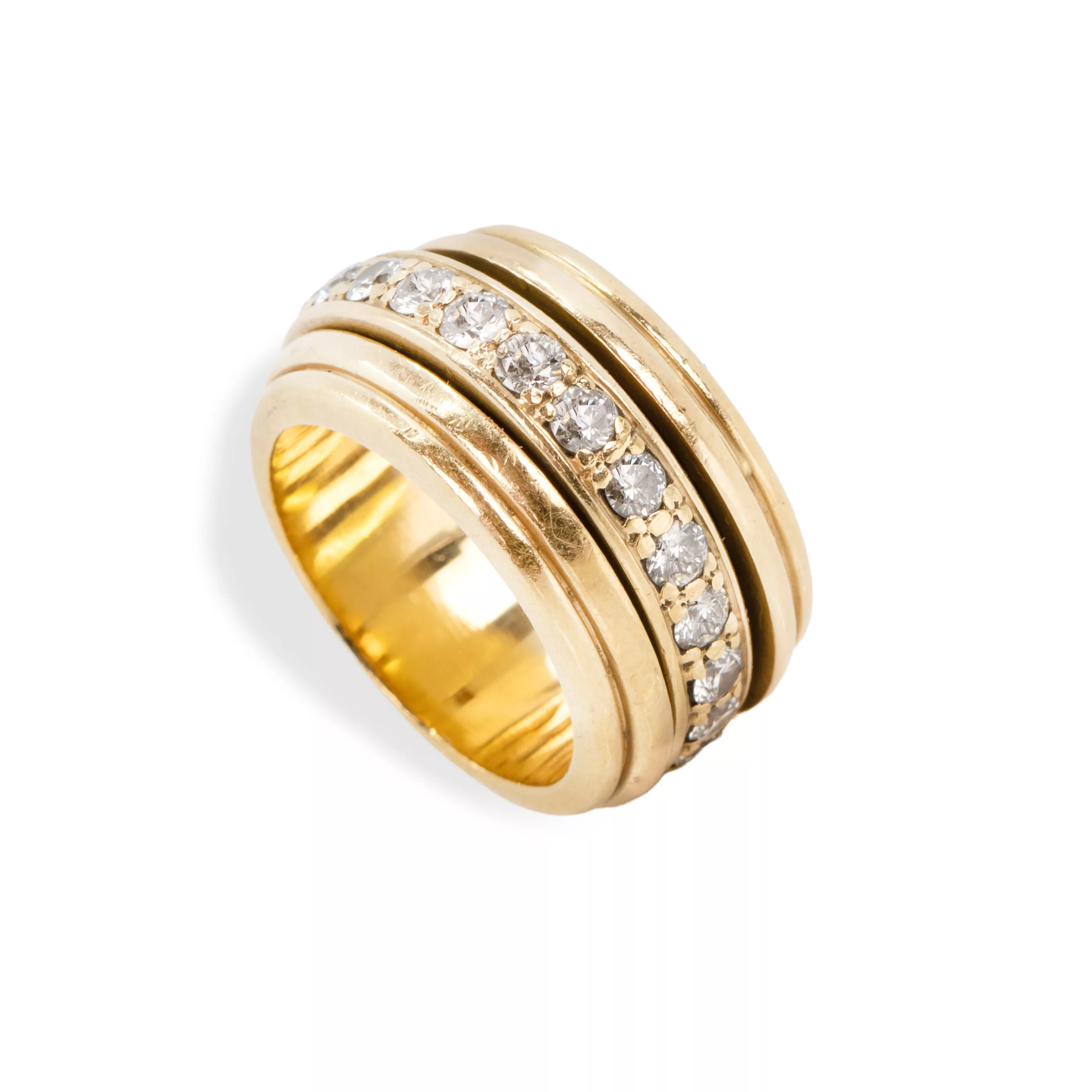 750 yellow gold, hallmarked, 24 brilliant-cut diamonds, total approx. 1.92 ct, G-H, vvs-vs, the diamond-set middle part is rotatable, RW 55, weight approx. 23.2