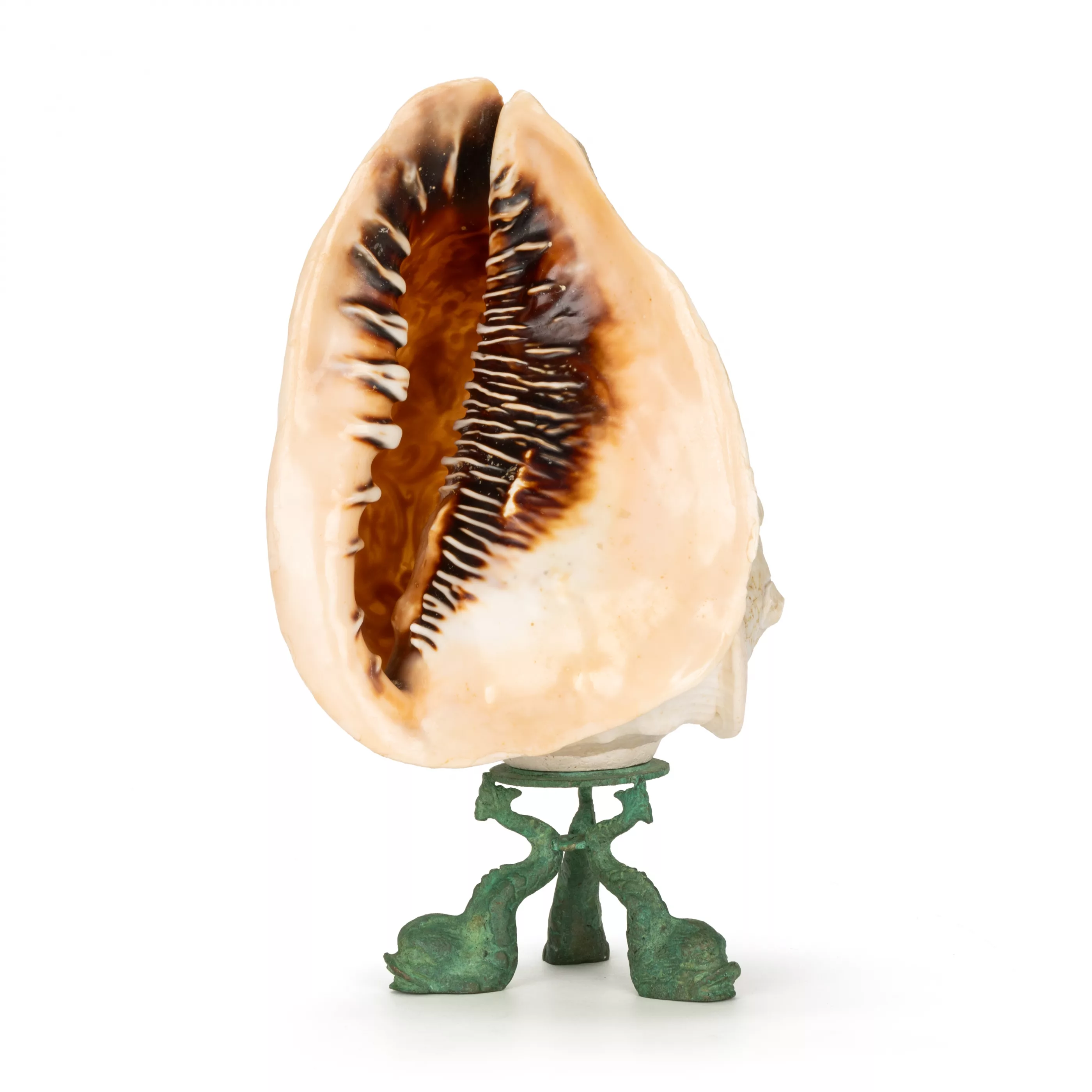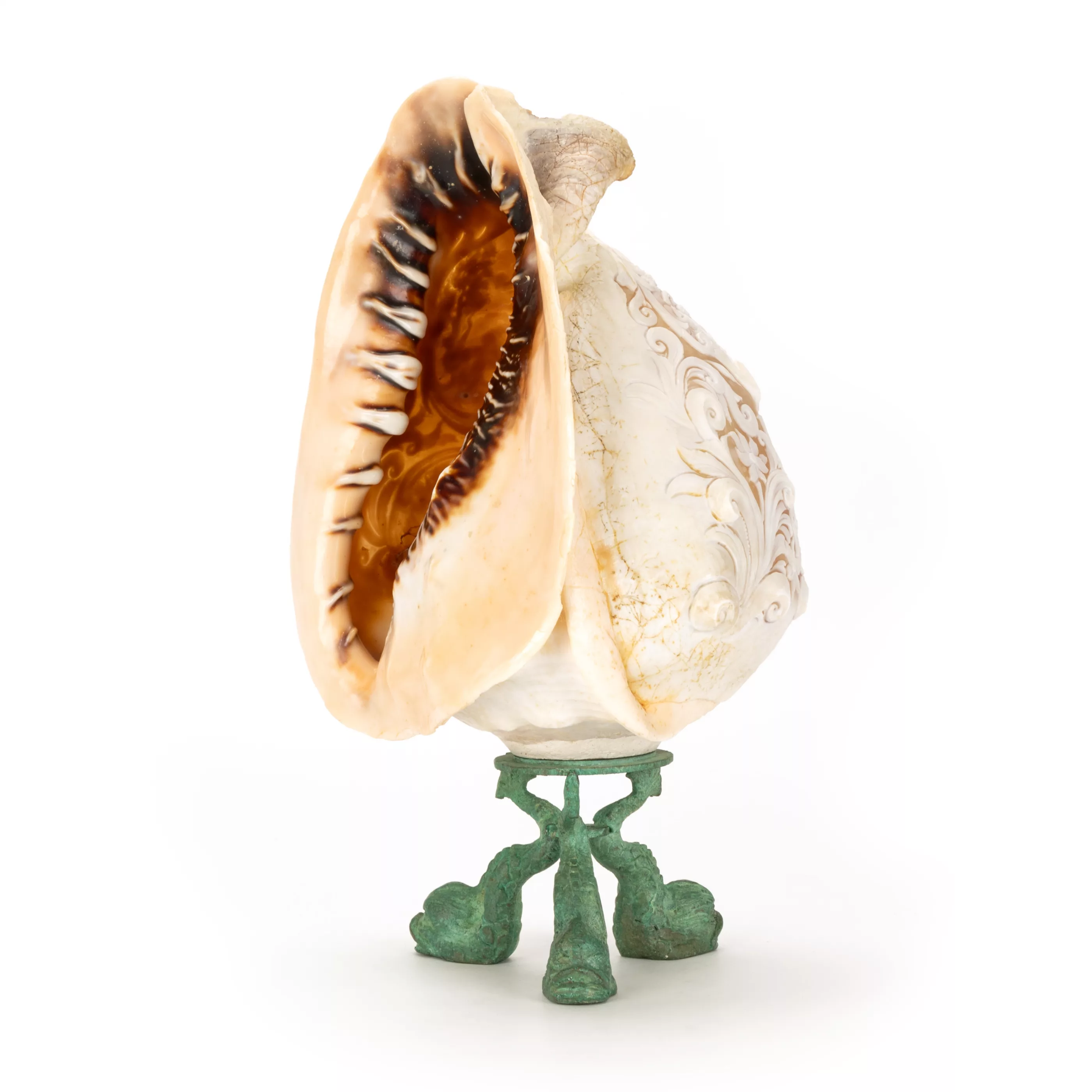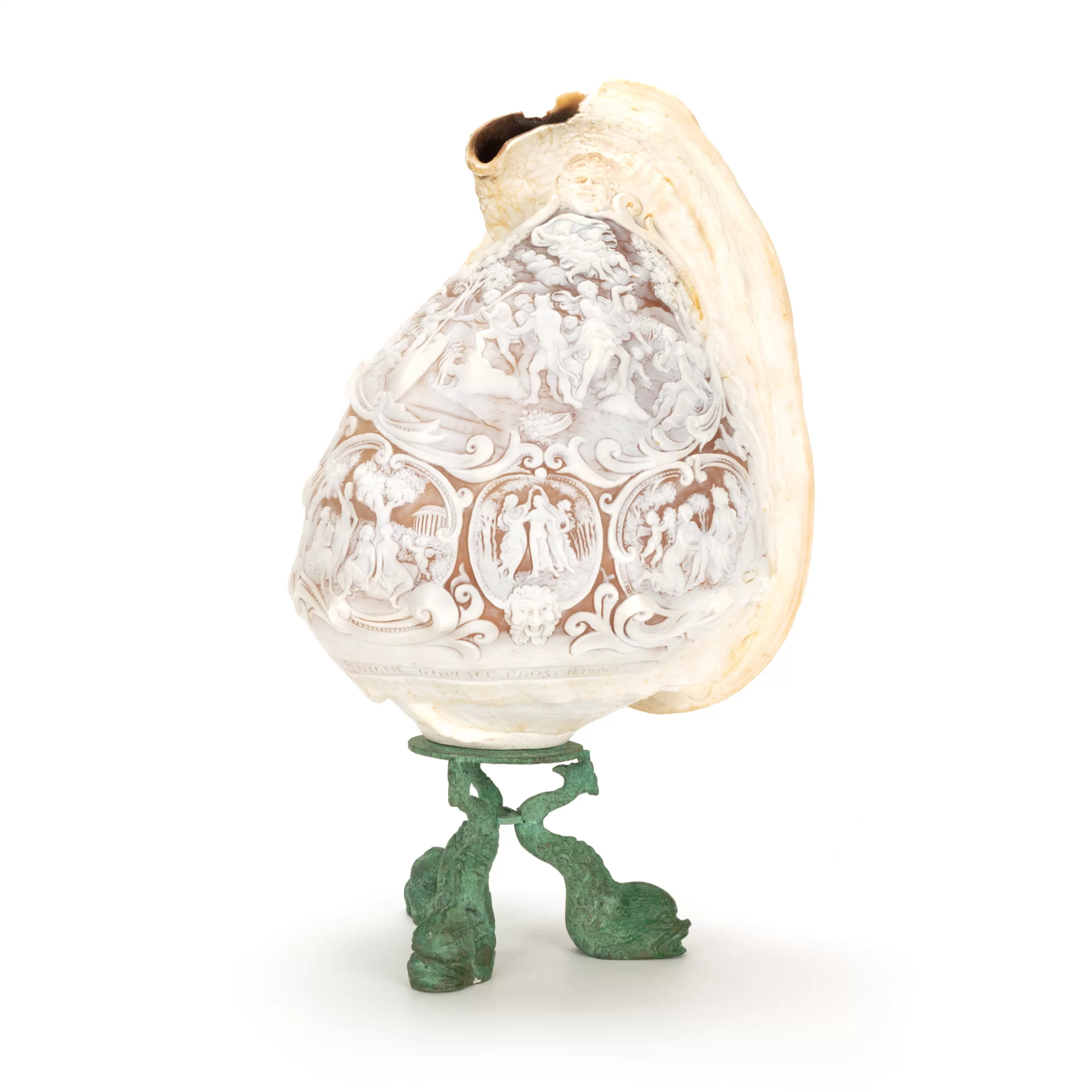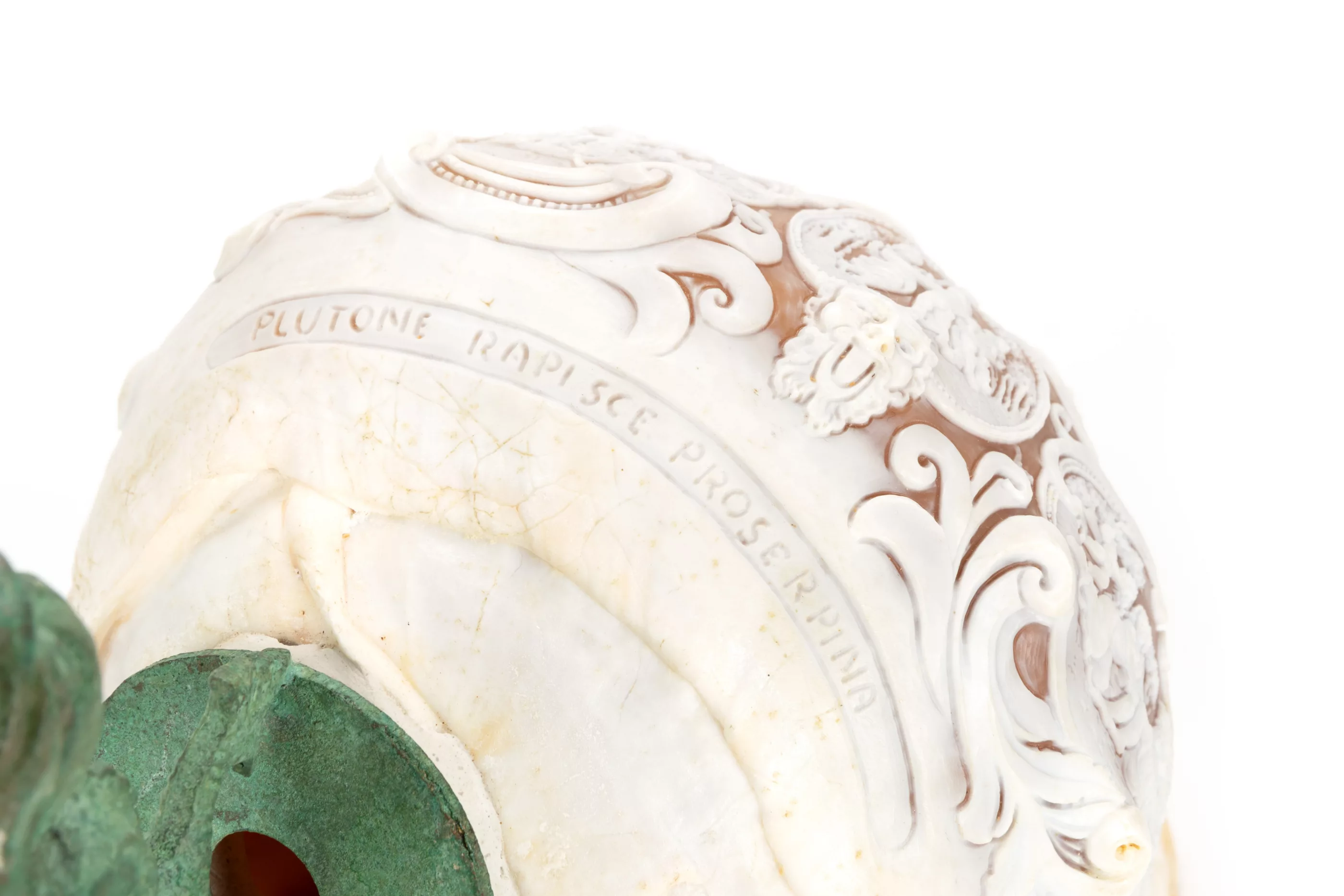 Italien, Ende 19. Jh./Anfang 20. Jh., große Porzellanschnecke mit feiner Reliefschnitzerei, auf Metallfuß, die Szene der römischen Mythologie stellt den Raub der Proserpina dar, gekennzeichnet auch durch die Innschrift 'Plutone rapisce Proserpina', mit Fuß 30 x 18 x 15,5 cm unterseitig durch ein rundes Loch mit Leuchtmittel elektrifizierbar, oberseitig kleine Absplitterung