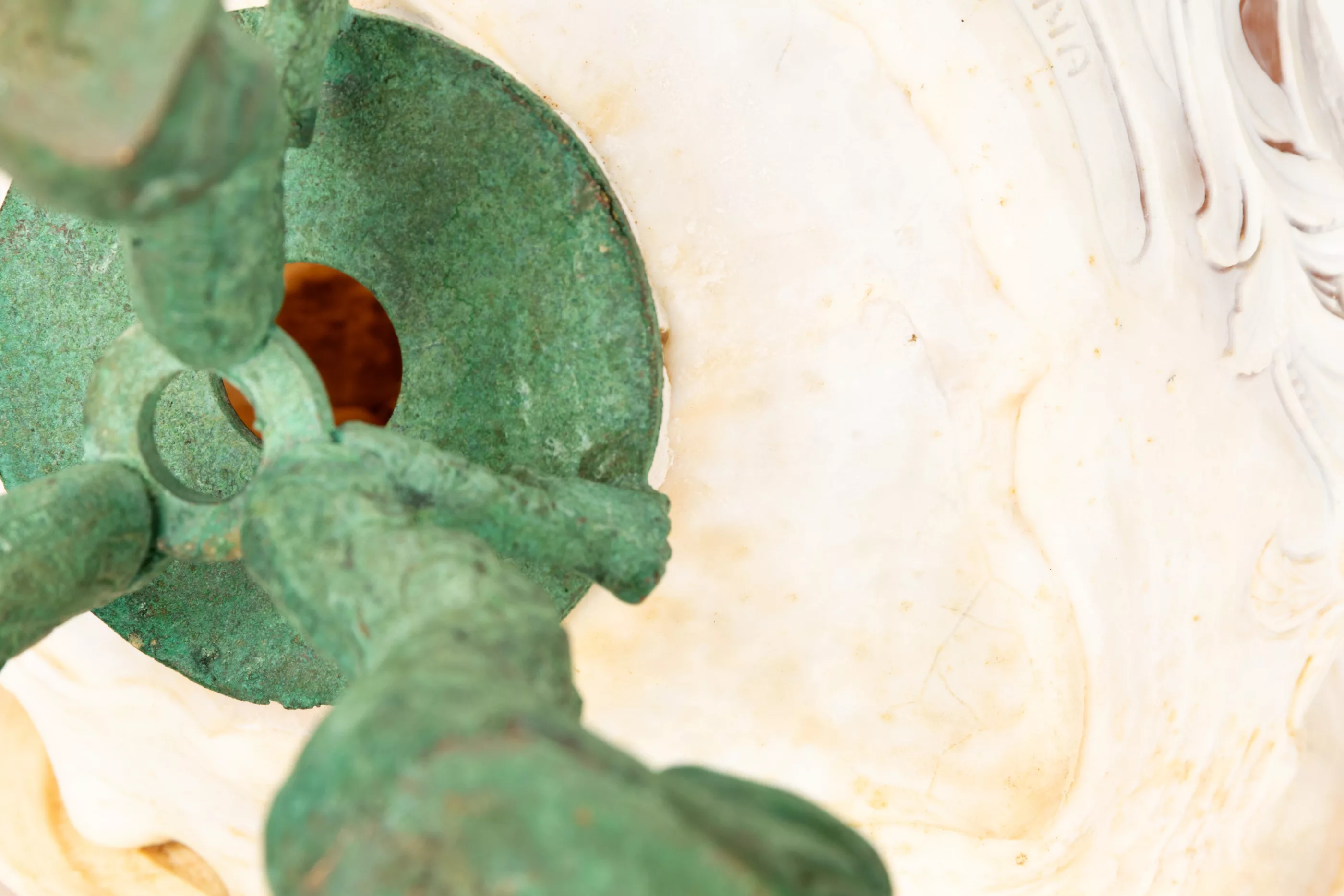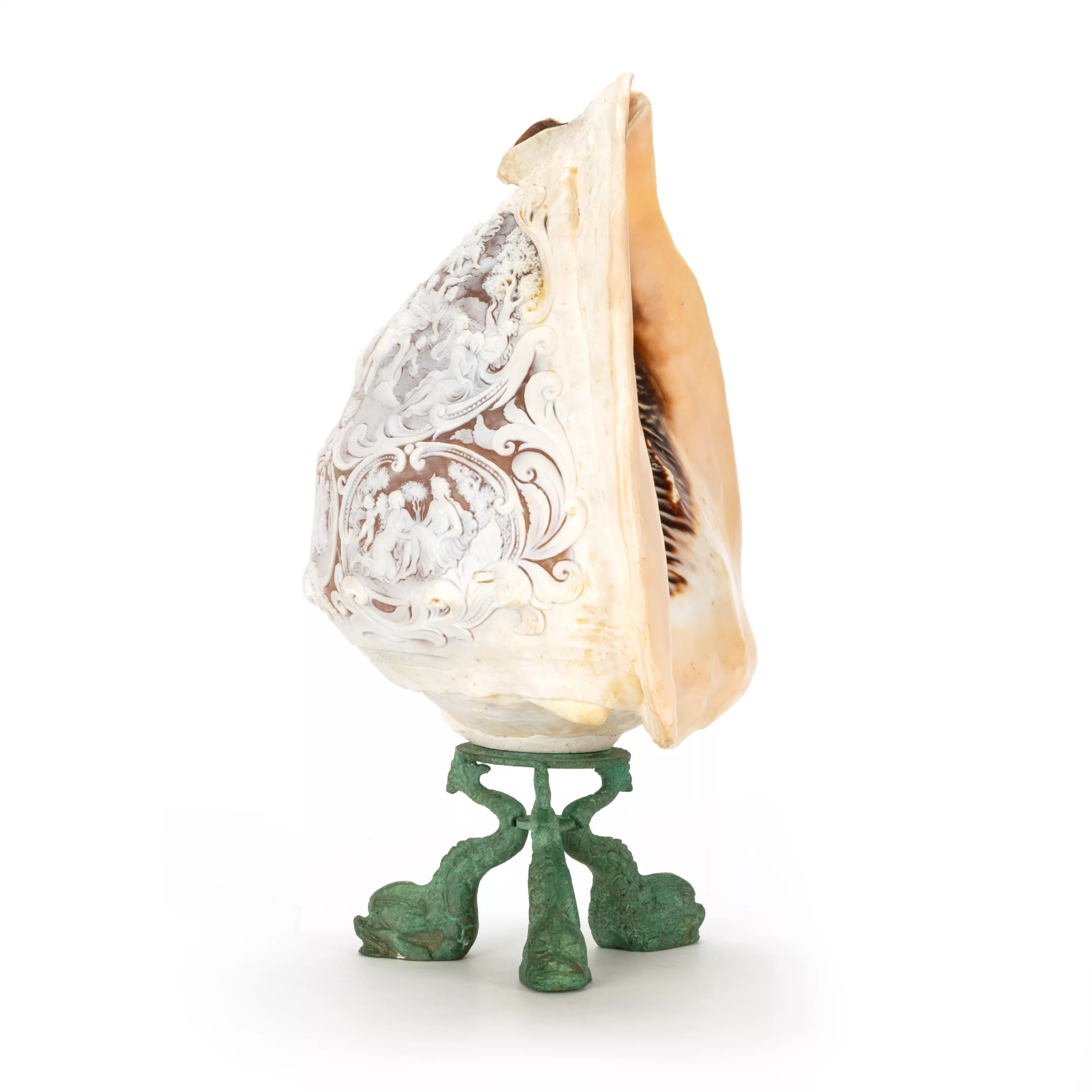 Italien, Ende 19. Jh./Anfang 20. Jh., große Porzellanschnecke mit feiner Reliefschnitzerei, auf Metallfuß, die Szene der römischen...