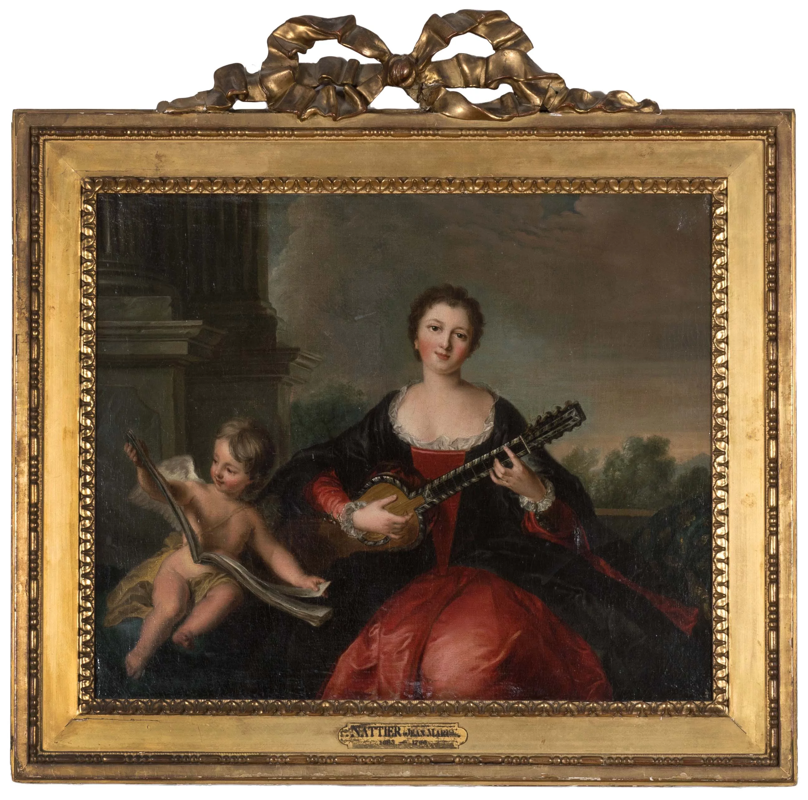 Mademoiselle de Beaujolais beim Spielen einer Gitarre, Öl auf Leinwand, 44,5 cm x 54,5 cm Leinwandmaß, nachträglich signiert, 1733 datiert, retuschiert, vermutlich wurde der Buchstabe c(opy) vor Nattier übermalt, Provenienz: Stuttgarter Kunstauktionshaus Dr. Fritz Nagel (Kaufbeleg aus dem Jahr 1983 anbei)