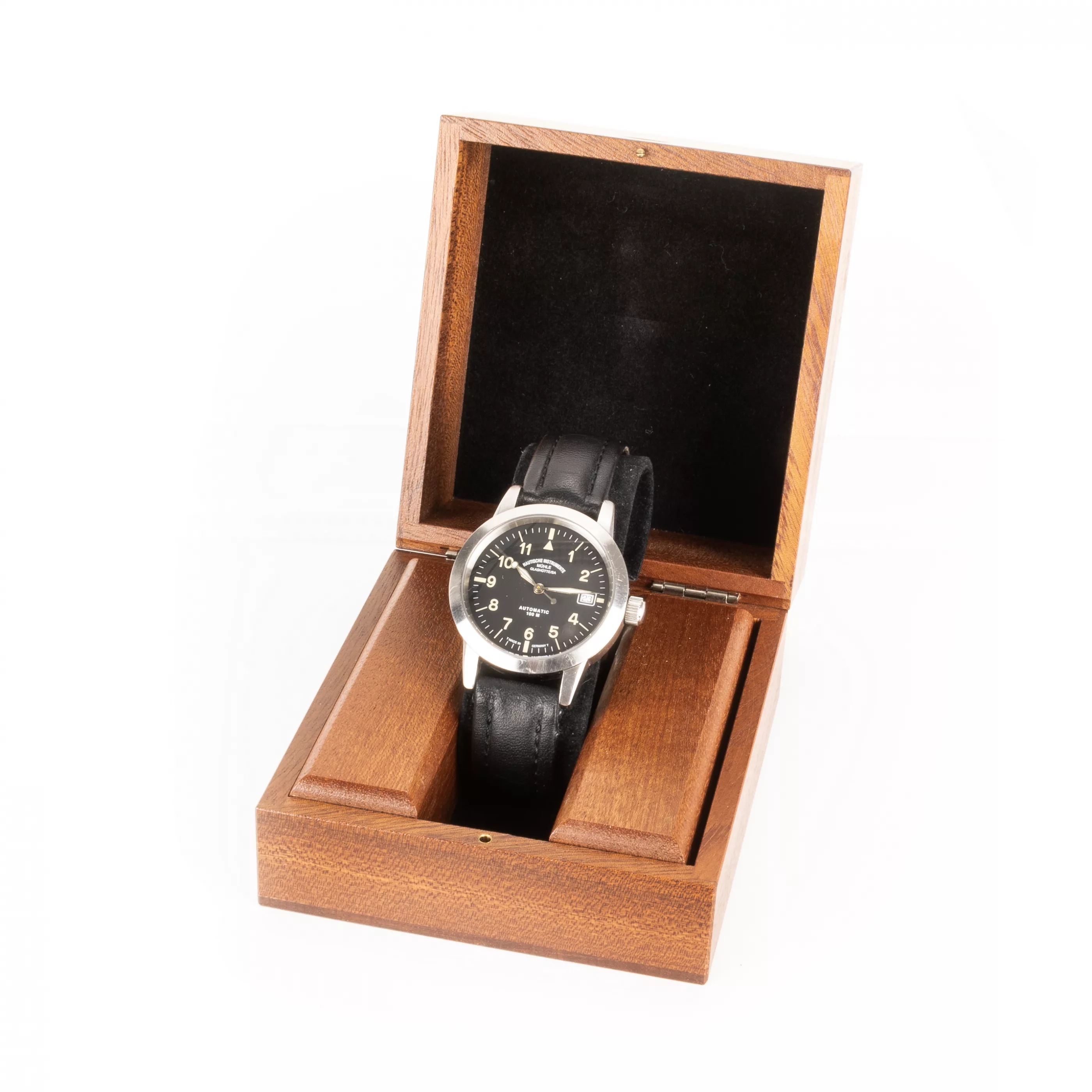 Sports-Automatic- M12, Jahr 2001, Automatik, Ref.-Nr. M12610, Gehäuse Stahl, Durchmesser 38 mm, Original-Armband, Leder, Original-Schließe, Stahl, Länge 21 cm, Gesamtgewicht ca. 71,7 g, Funktion geprüft, gangbar, Zustand gut, Tragespuren, Armband an einer Seite gerissen, mit Original-Box und -Papieren, Zertifikat, Bedienungsanleitung mit Verkaufsurkunde