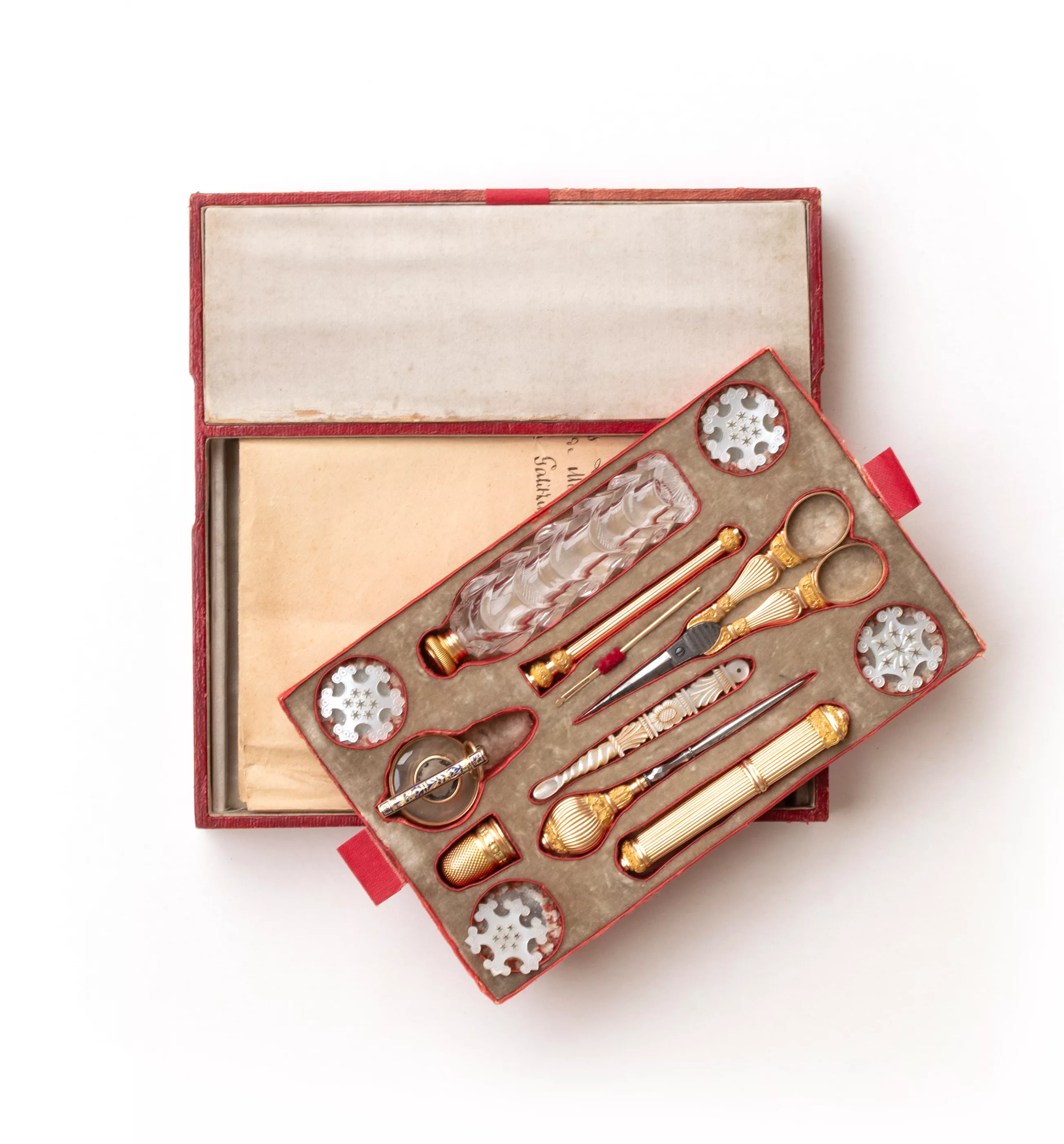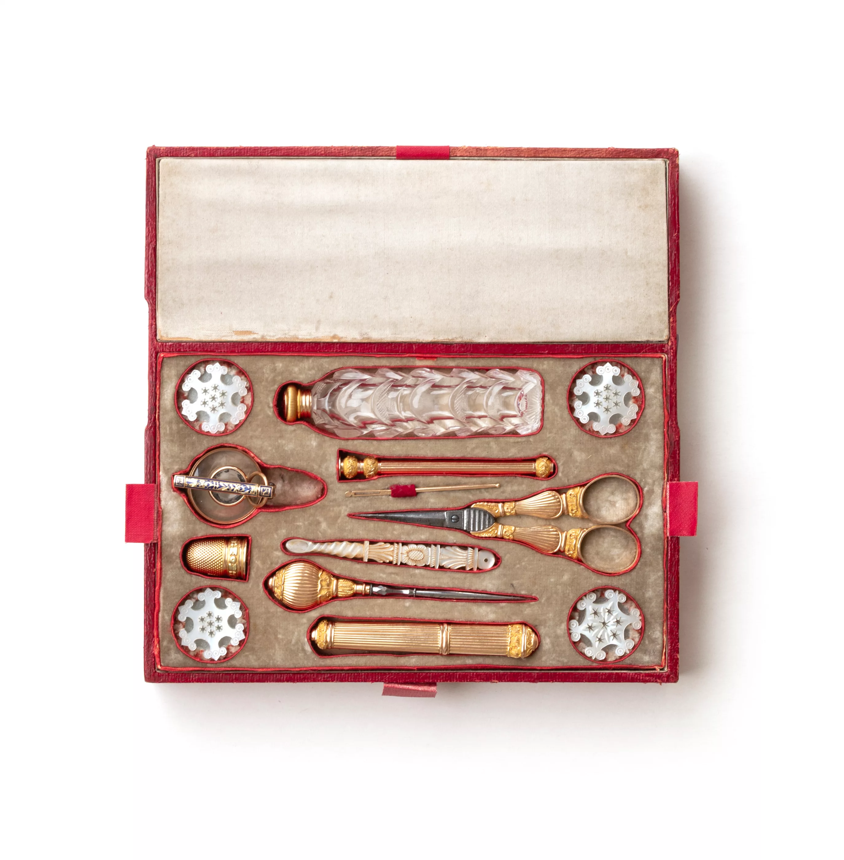 Frankreich, erste Hälfte 19. Jh., bestehend aus Nähutensilien, Bleistift, Lupe und Parfüm-Flakon aus 750 Gelb-, Rot und partiell Grüngold, ca. 57 g Gold, Perlmutt, Glas, Emaille, punziert mit links gerichtetem Widderkopf, Frankreich 1819-1838, Herstellerpunzen auf der Schere verschlagen, partiell kleine Bereibungen und Kratzer, Schwarzlotmalerei der Lupe partiell abgeplatzt