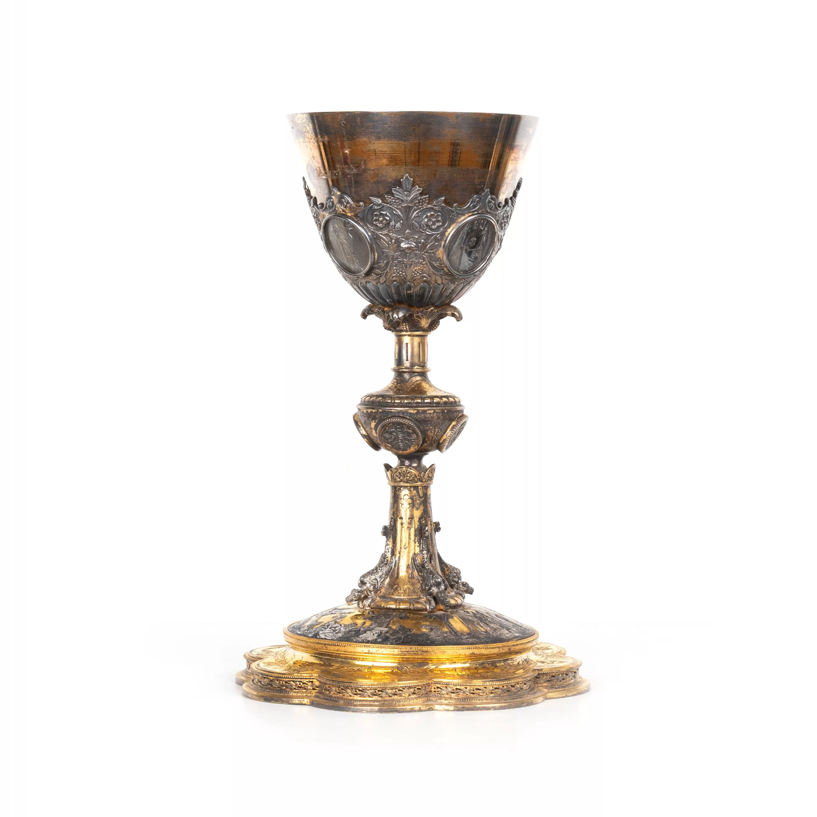 Frankreich, 2. Hälfte 19. Jh., Vermeil, Silber 950/1000 vergoldet, mit Minervapunze 1838 - 1979, Punze mit den Buchstaben 'R N' und Kelch, Höhe 24,5 cm, Gewicht ca. 636 g, berieben mit kleinen Kratzern, partieller Verlust der Vergoldung