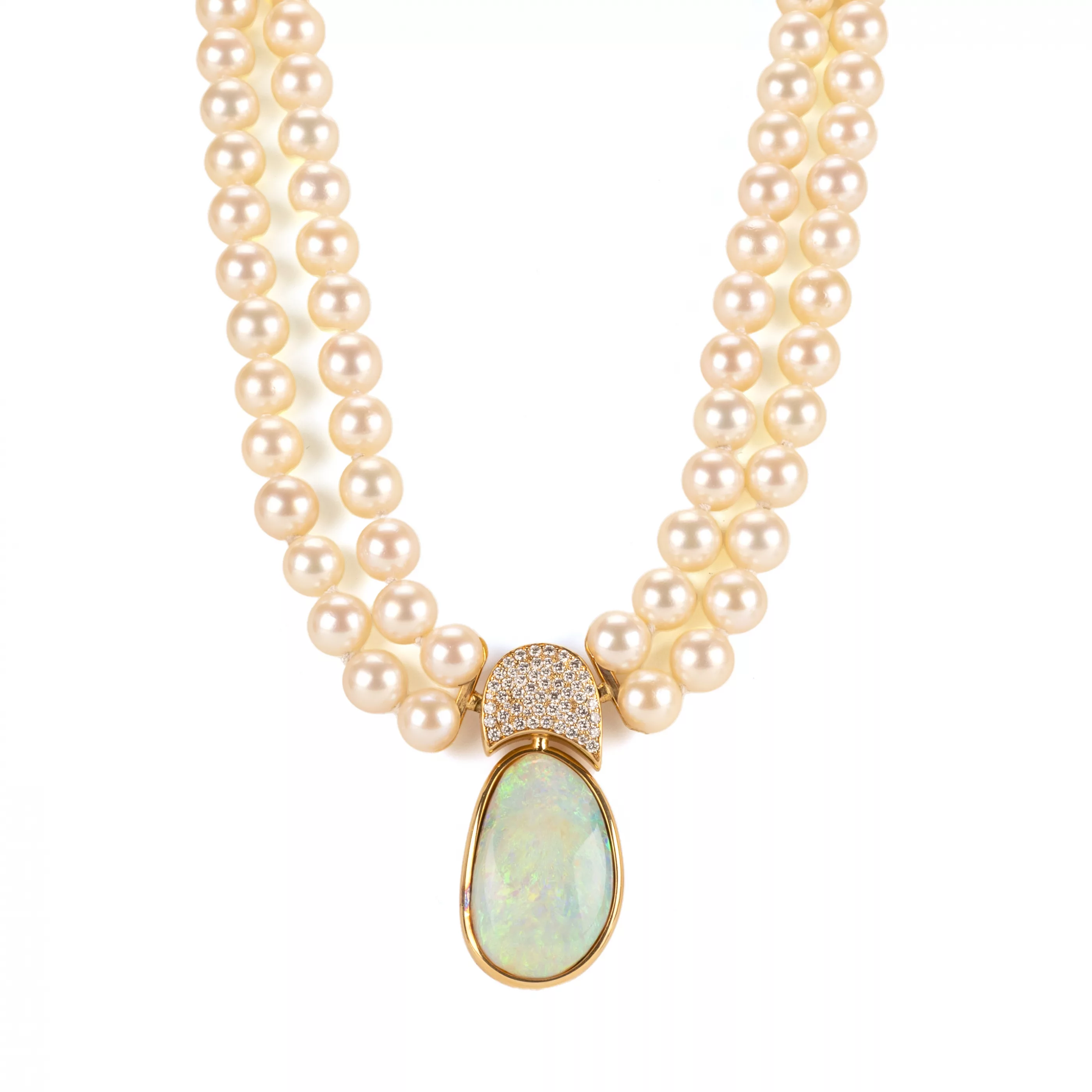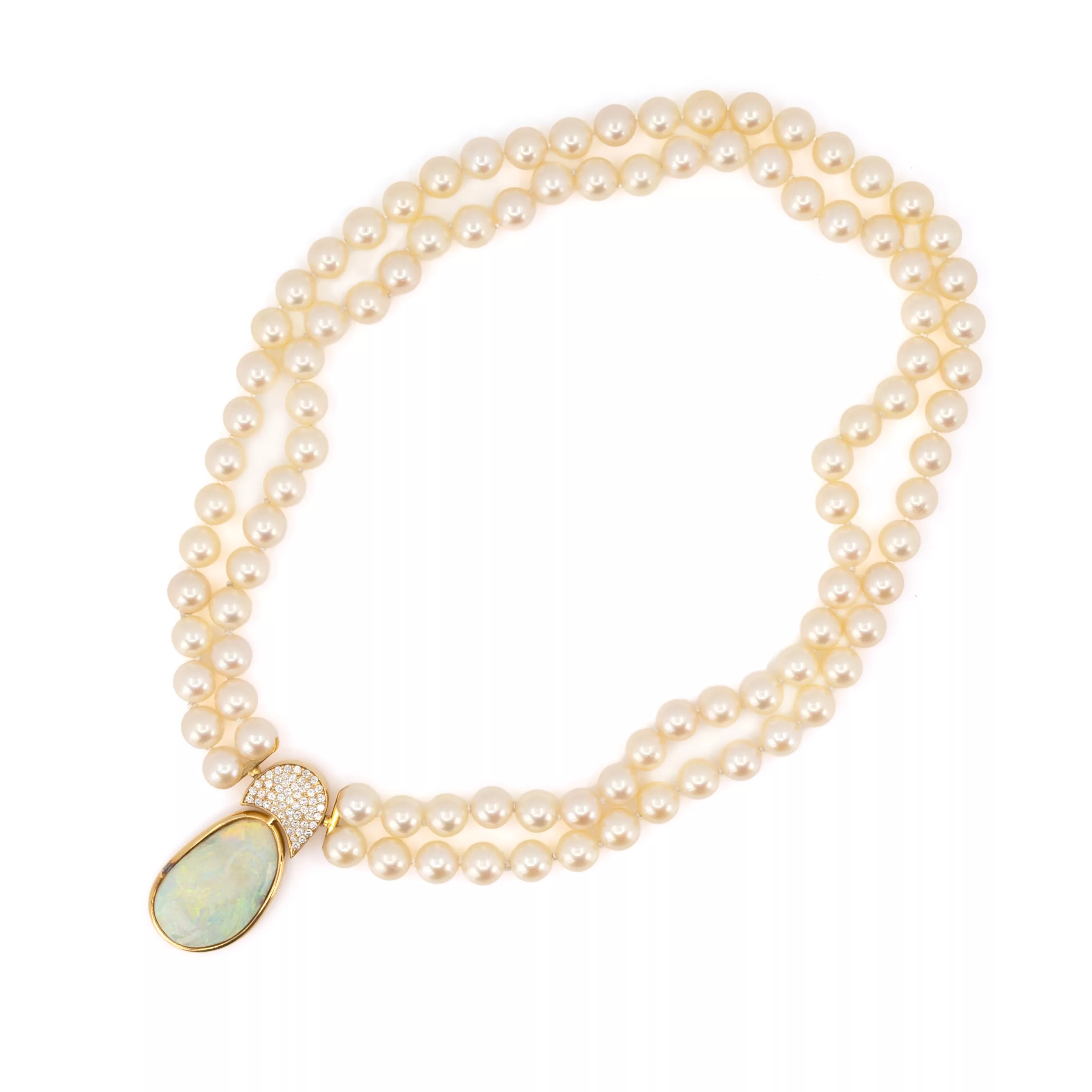 750 Gelbgold, punziert, Schließe/Anhänger mit ca. 60 Diamanten im Brillantschliff, gesamt ca. 0,60 ct, Opal-Cabochon 2,70 x 1,67 cm, Ø Zuchtperlen 7,50 - 7,90 mm, Länge 42 cm, Länge Schließe 4 cm, Gewicht ca. 84,7 g