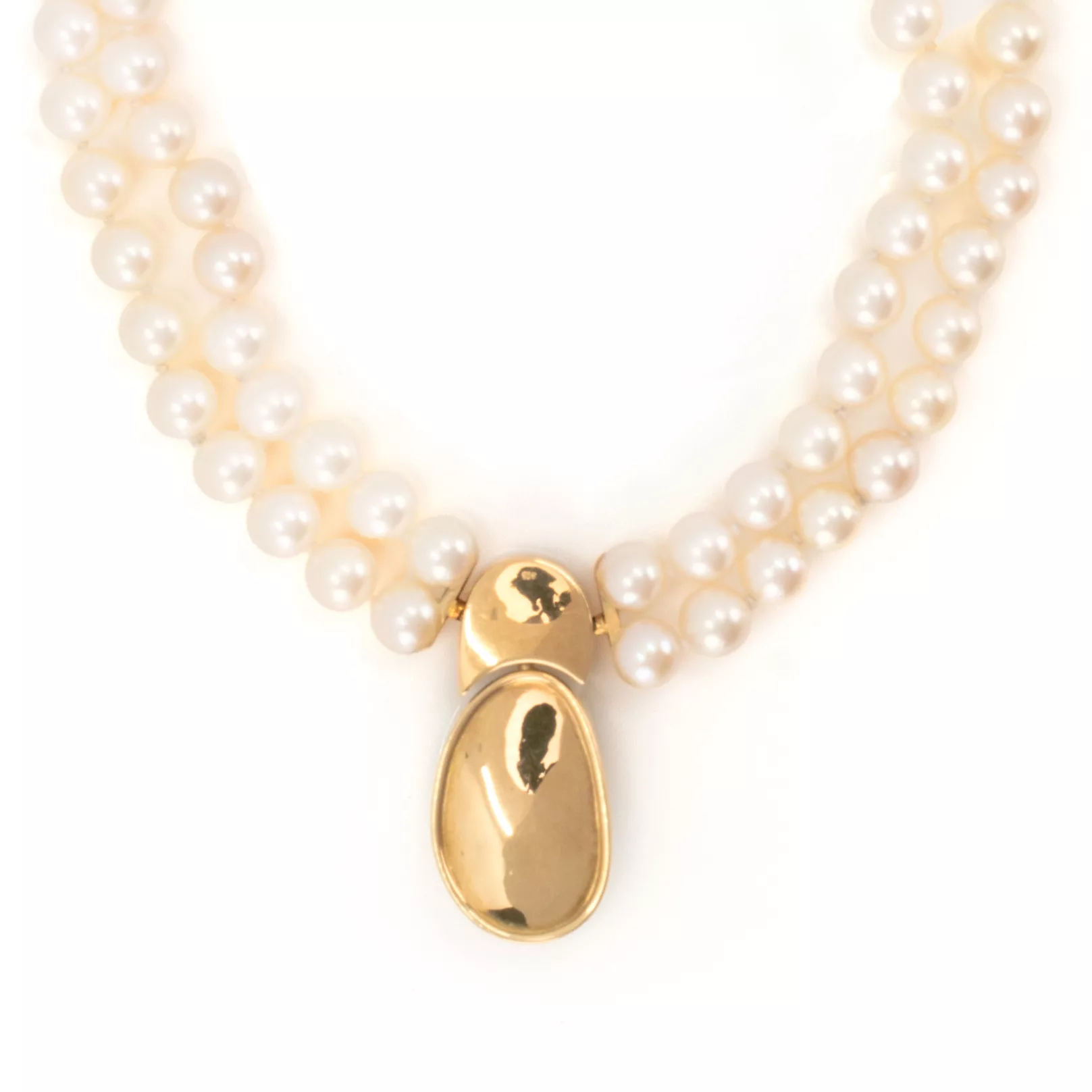750 yellow gold, hallmarked, clasp/pendant with approx. 60 brilliant-cut diamonds, total approx. 0.60 ct, opal cabochon 2.70 x 1.67 cm, cultured pearls Ø 7.50 - 7.90 mm, length 42 cm, length clasp 4 cm, weight approx. 84.7 g