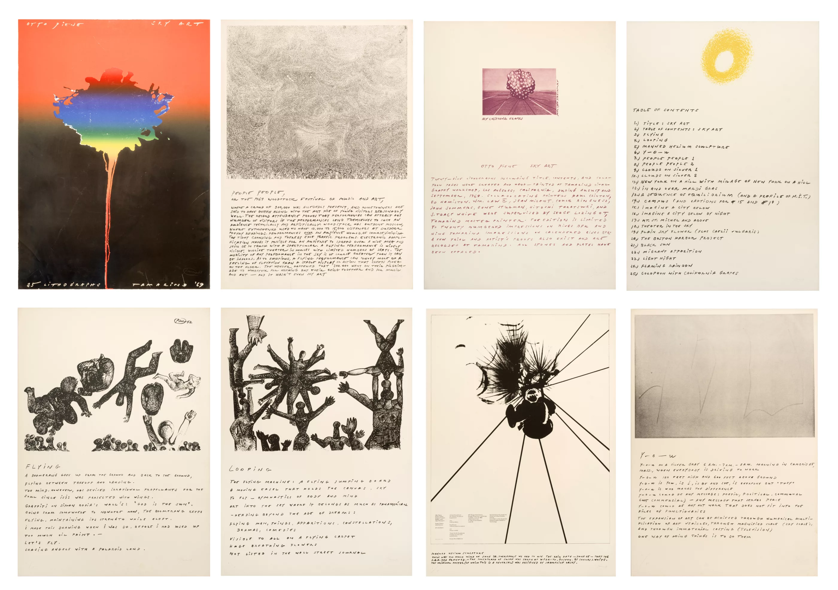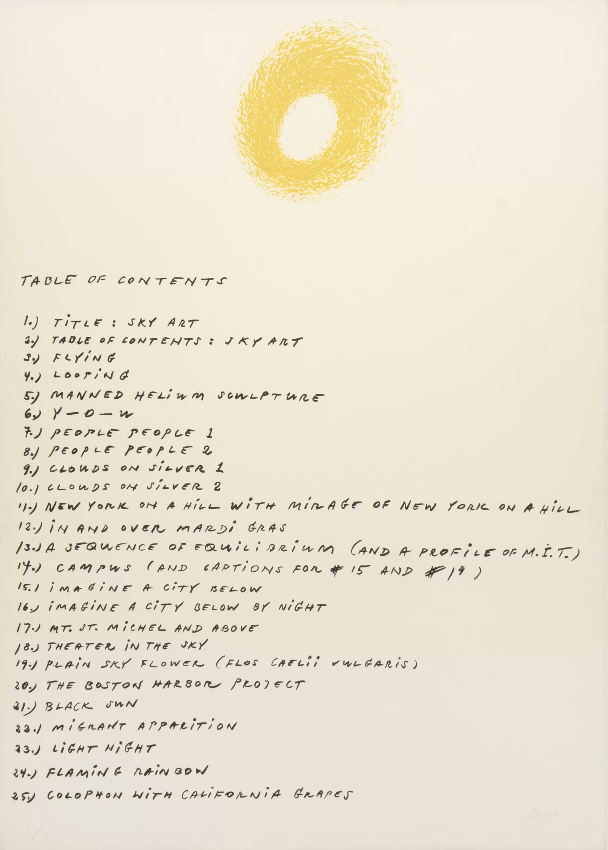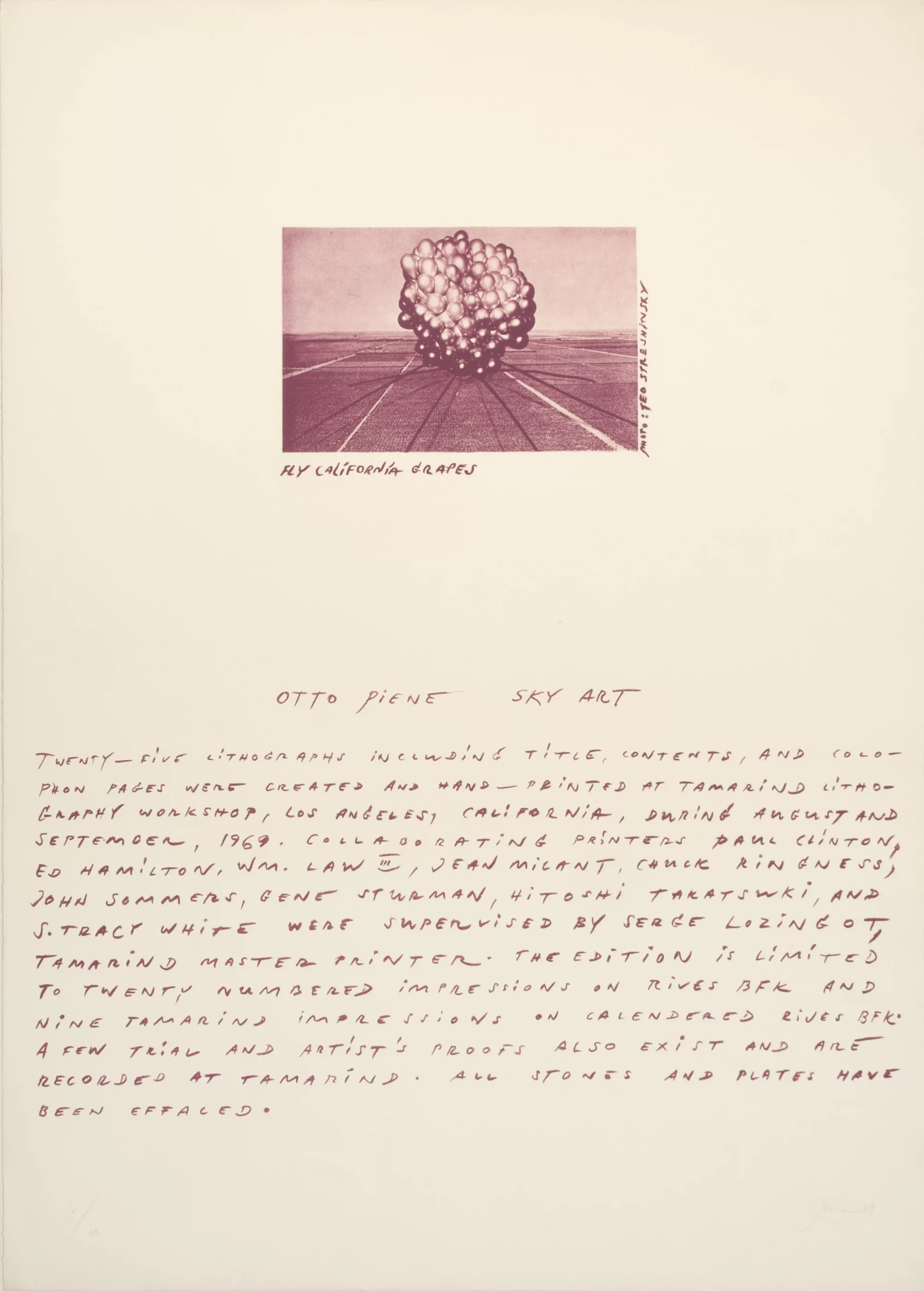 Mappenwerk 'Sky Art', 25 Lithografien auf Bütten, ca. 89 cm x 63 cm Blattmaß, jeweils signiert, 69 datiert, 6/20 nummeriert, Blatt 22 und 24 jeweils 13/20 nummeriert, gedruckt und ediert von Tamarind Lithography Workshop, Los Angeles, die Blätter 22 und 24 fehlten und wurden 2003 von Otto Piene ersetzt, eine Kopie des Schreibens anbei, Titelblatt mit Kratzern, minimal bestoßen, vereinzelt Stecknadellöcher, zwei Blätter beschnitten, partiell Griffspuren, Literatur: Wvz. Rottloff 33-57