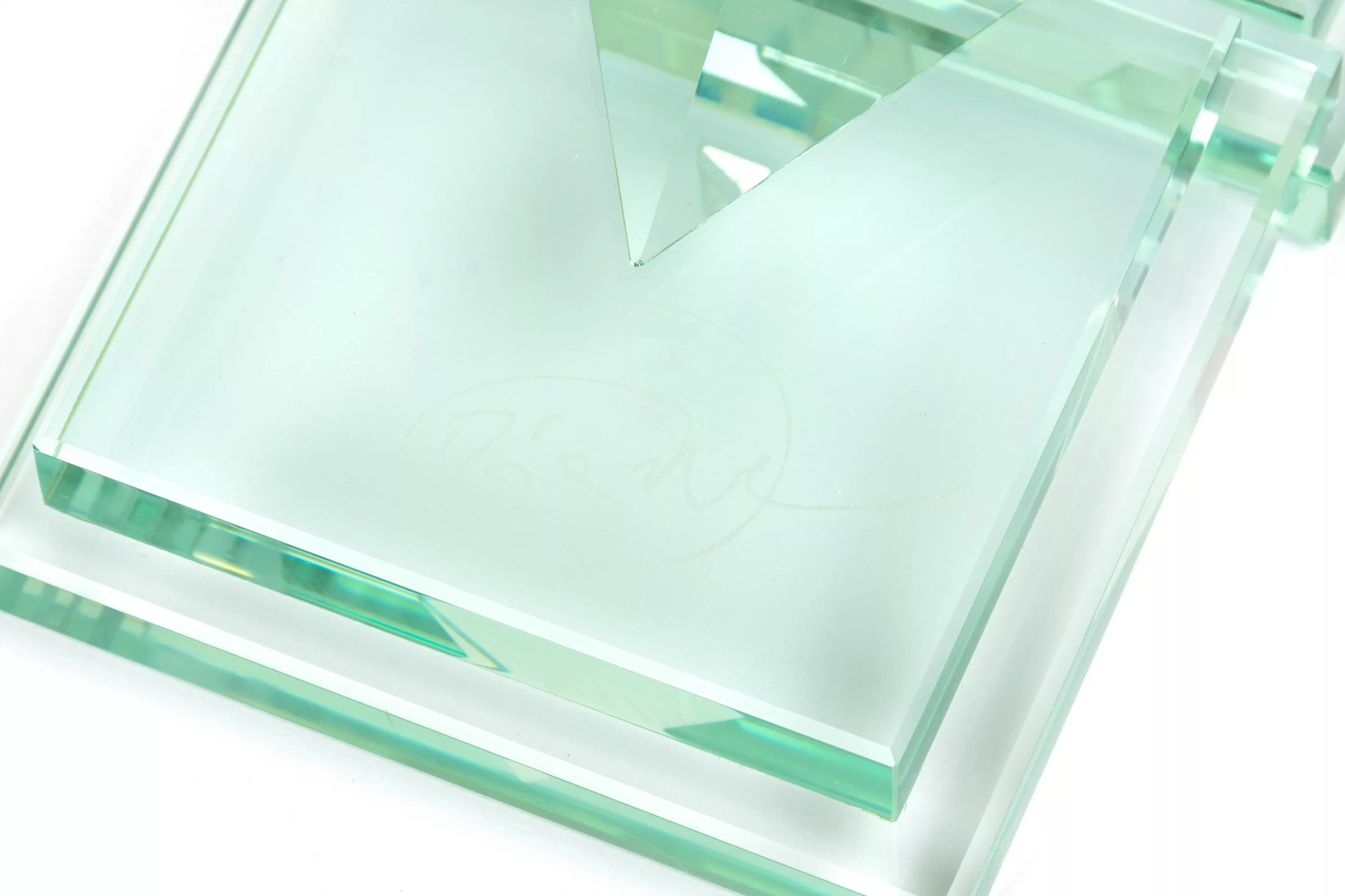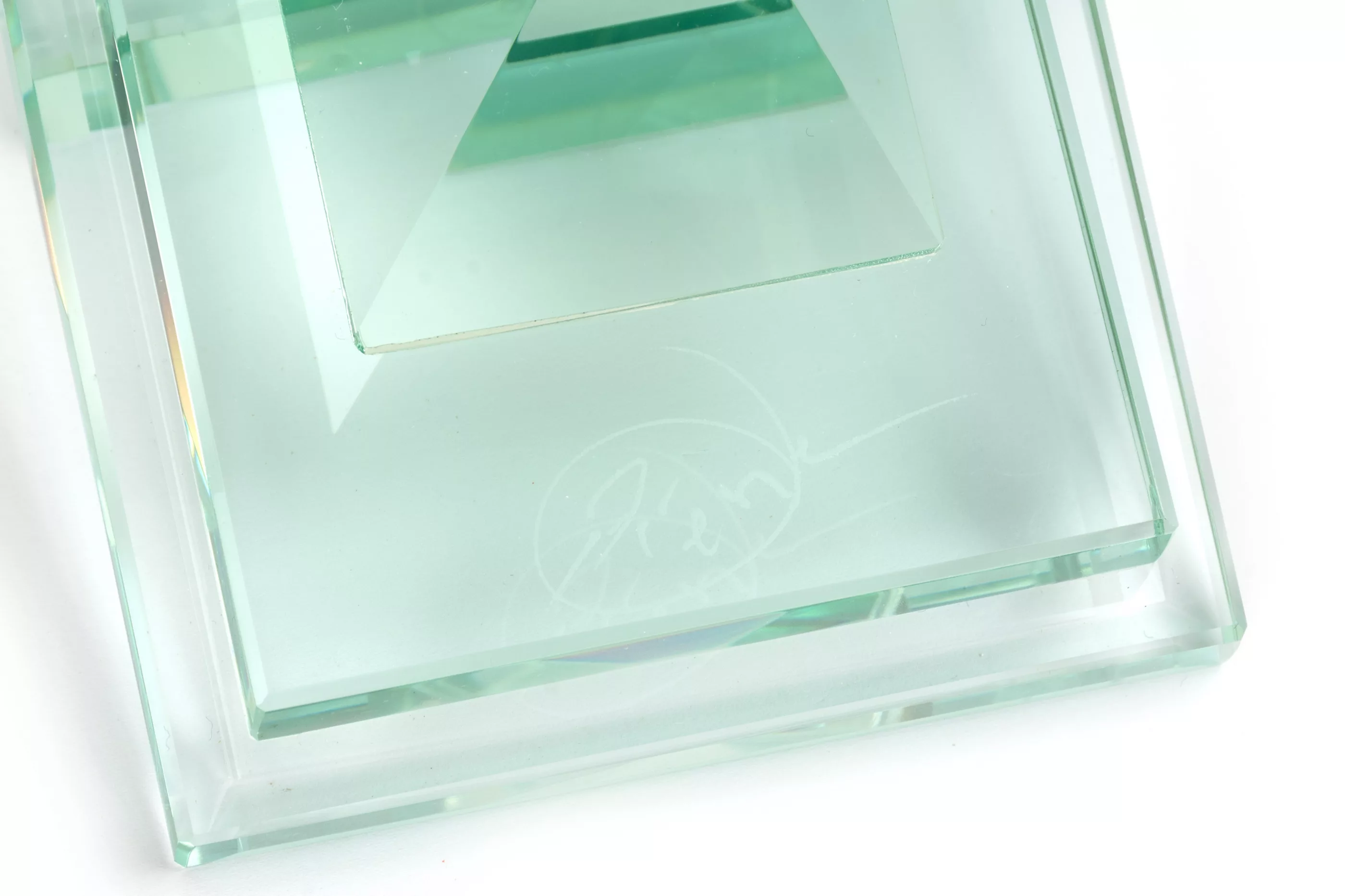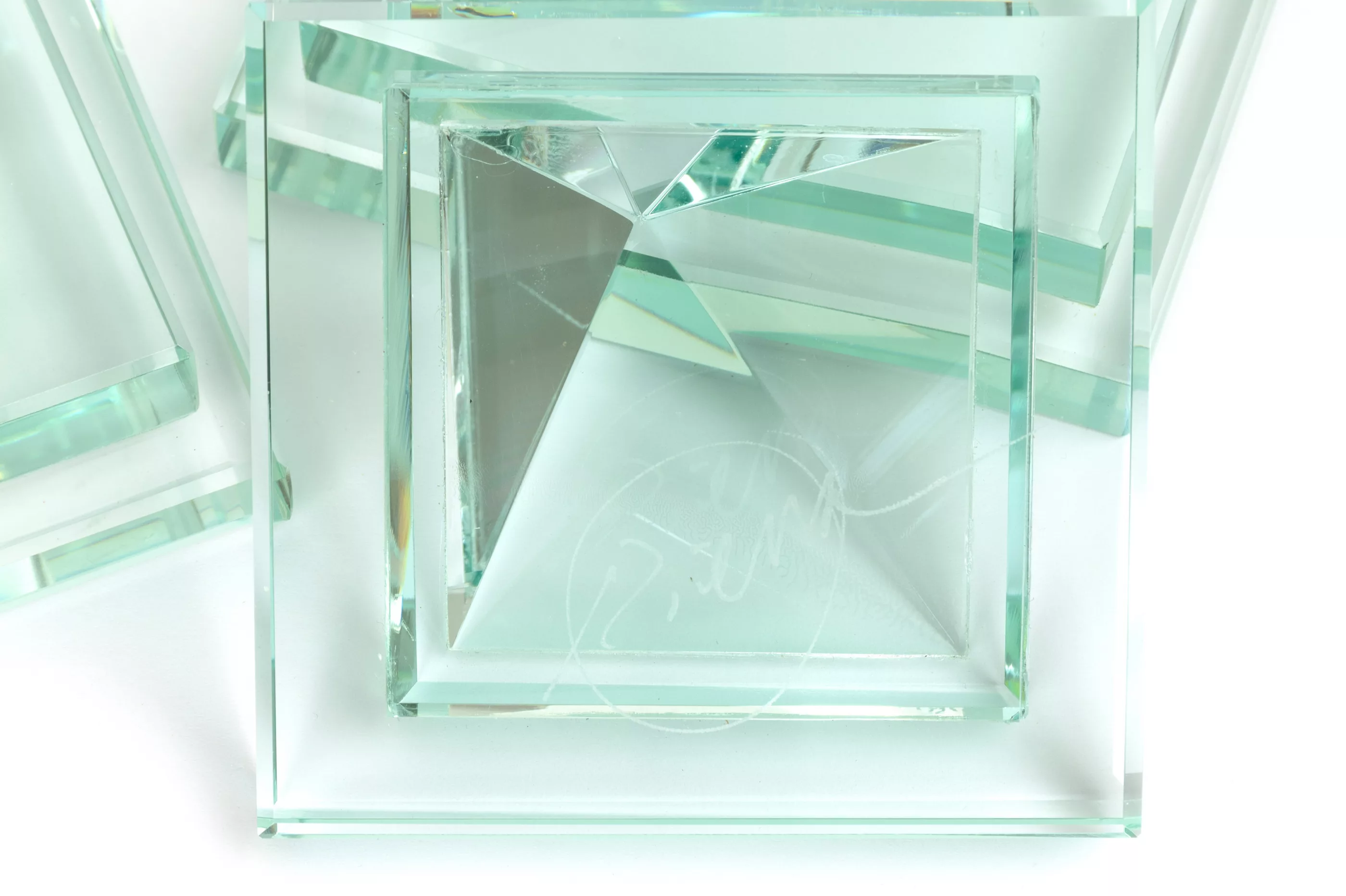Three cut glass objects on the occasion of the construction project of the Schadow Arcades in Düsseldorf, whose dome was designed by Piene, float glass/optical prism glass 7.8 x 8 x 4 cm, 9 x 9 x 4 cm and 9 x 9.5 x 4 cm work dimensions, each with incised signature partially minimally rubbed with minimal scratches The Schadow Arcades in Düsseldorf are an upmarket shopping centre building in the city centre. They were built by architect Walter Brune between 1990 and 1994. The prismatic dome that has crowned the Shadow Arcades since 1994 was designed by Otto Piene. The three glass objects come from the estate of Karl Alexander Dedy, who, together with Otto Piene, planned and realised the glass roofing of the arcades. On completion of the construction work, these prisms were signed by Piene and given as gifts to architects, planners and others involved.