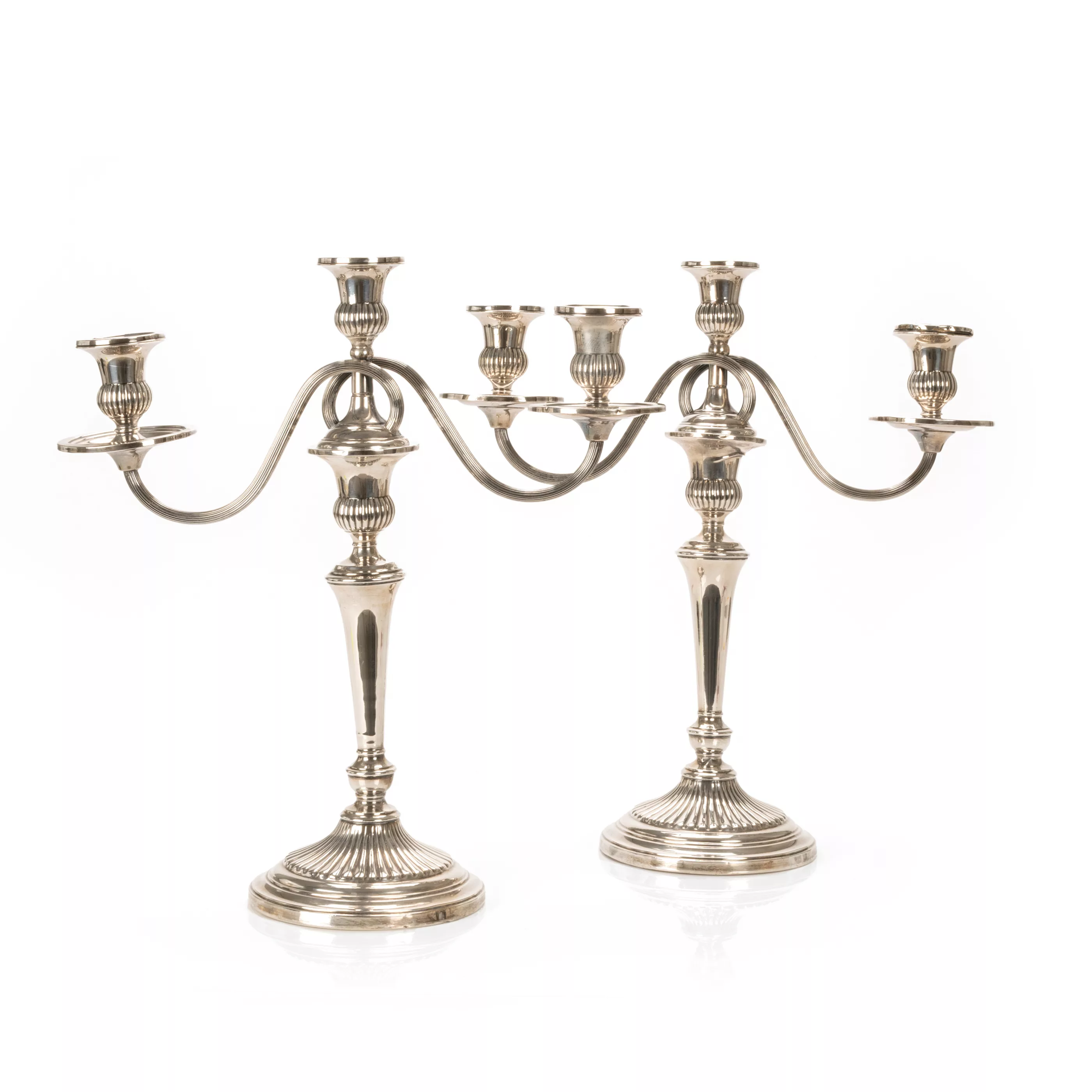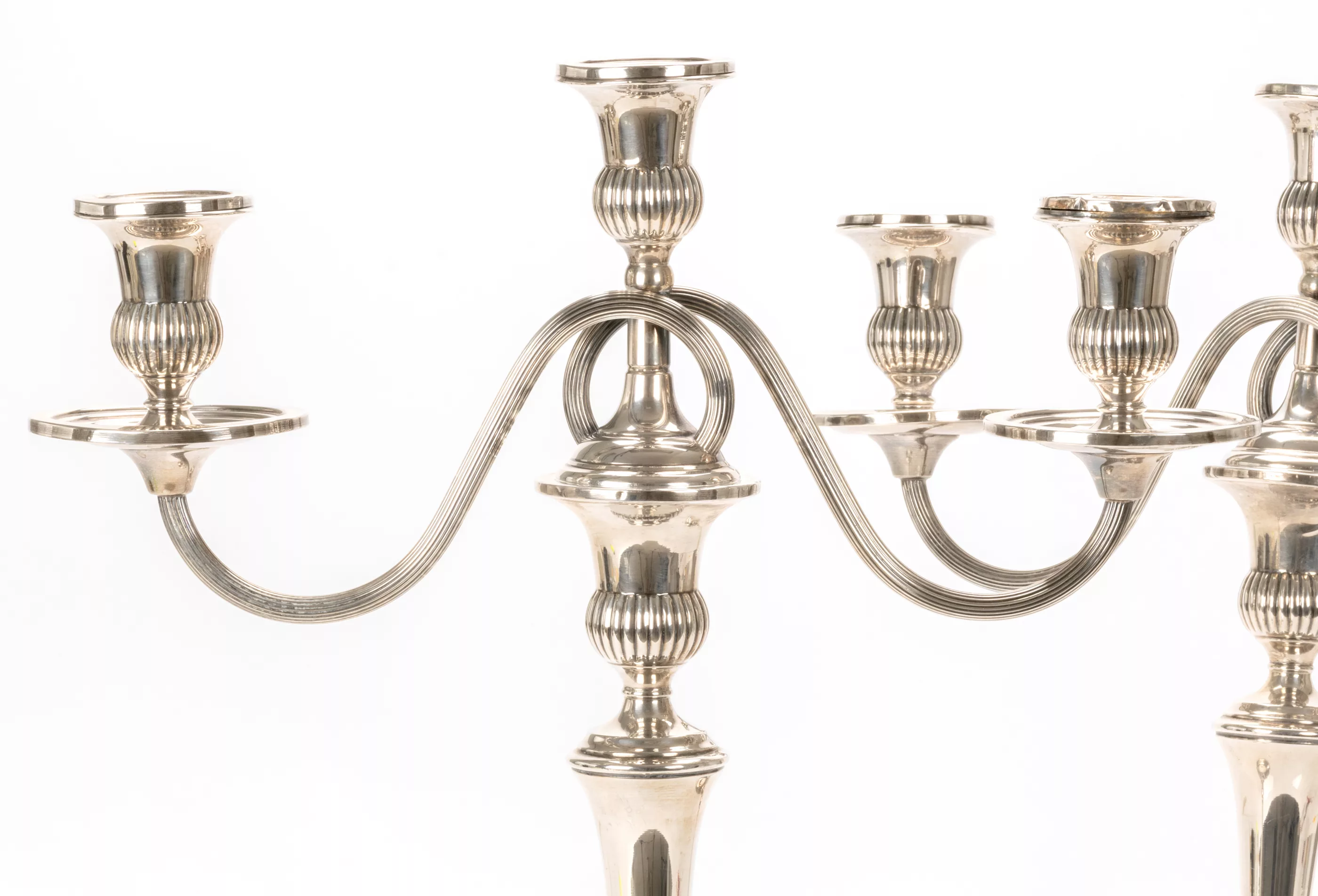 USA, c. 1930-1940, 925 silver, hallmarked, fineness and marked 'reinforced with cement', on a round, stepped stand, surrounding palmette frieze, partially recessed, stepped shaft, 2 ribbed s-shaped arched arms, removable spout attachment, height 39 cm, total weight (filled) approx. 2,936 g, one candlestick dented and crooked