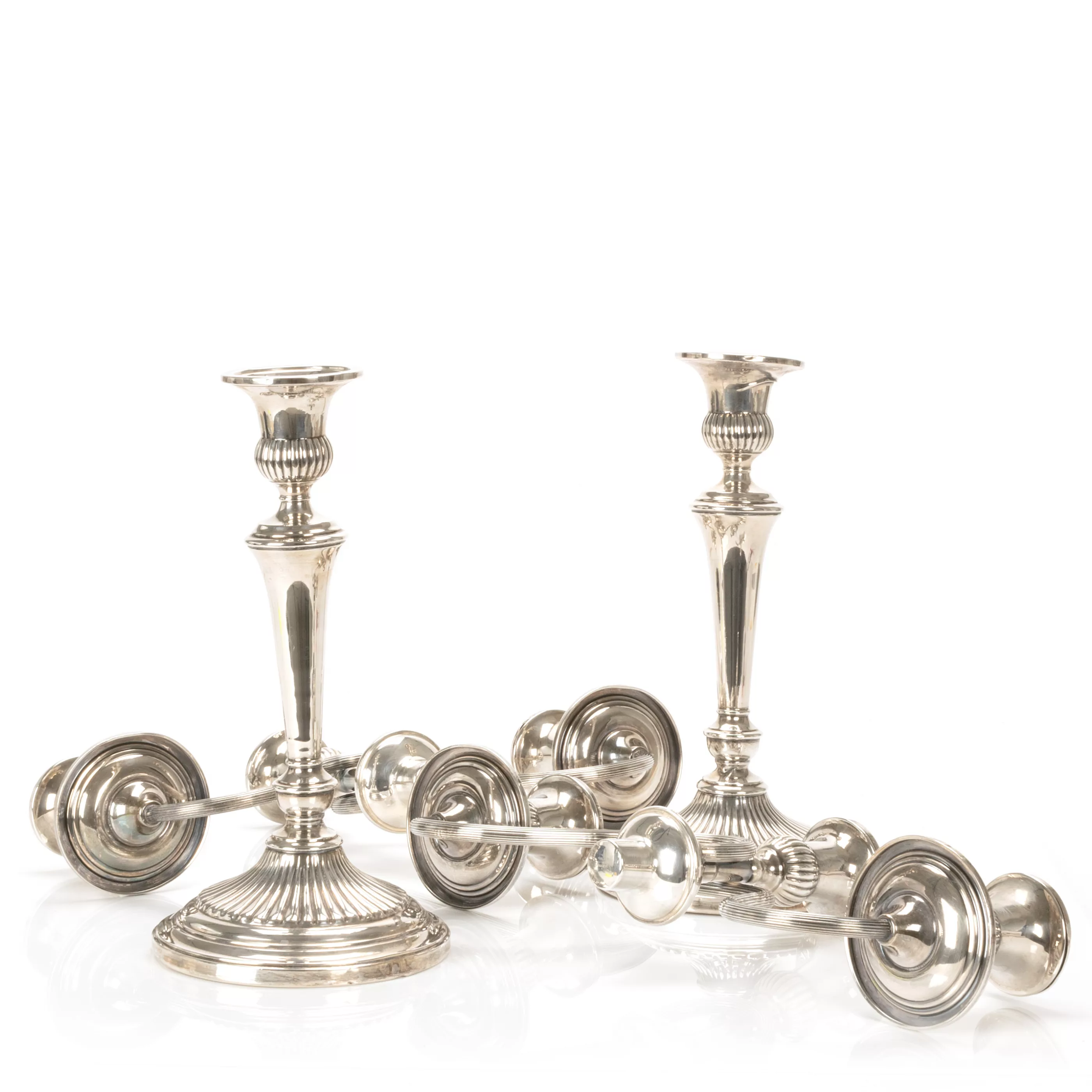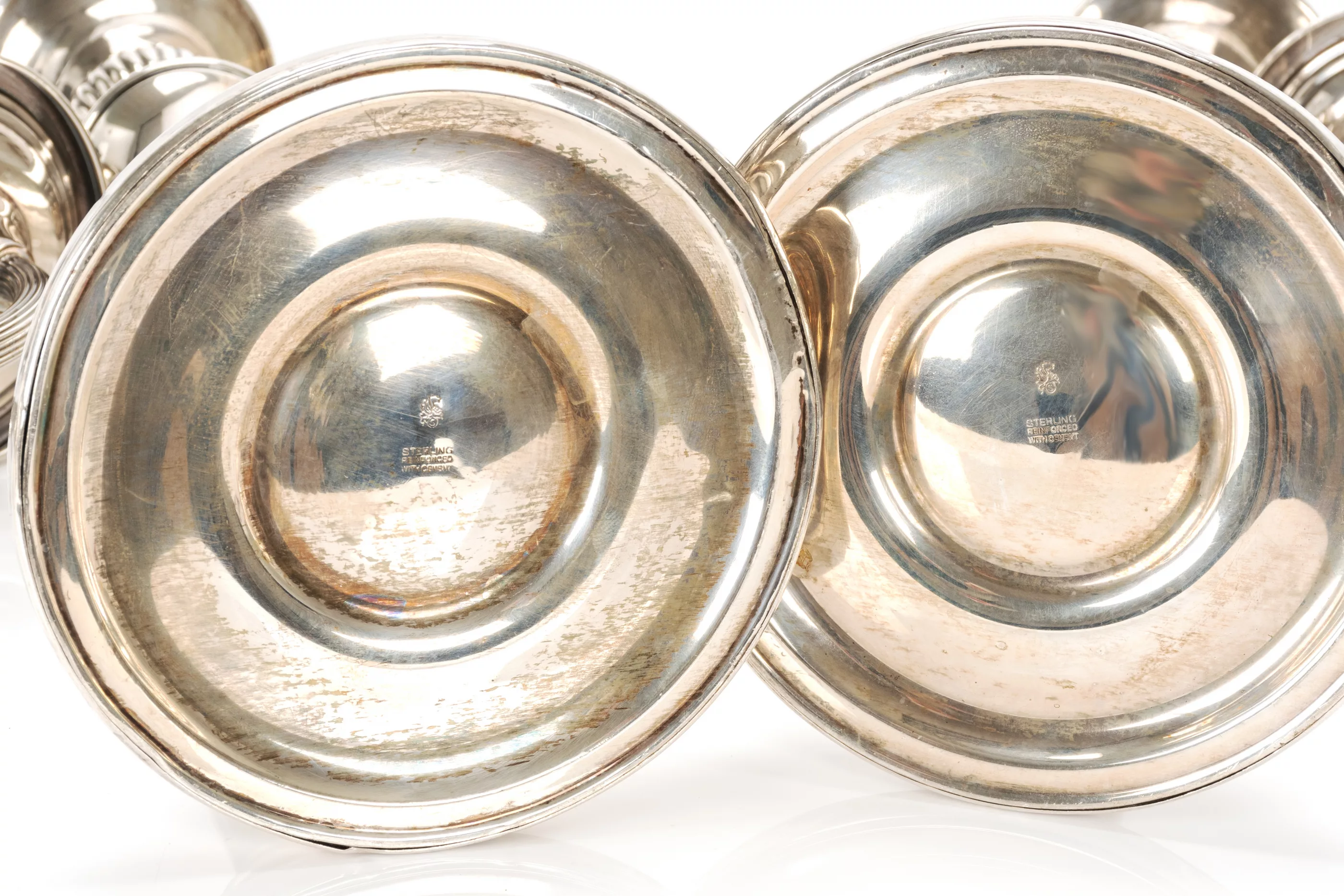 USA, um 1930-1940, 925 Silber, punziert, Feingehalt und bezeichnet 'reinforced with cement', auf rundem, getreppten Stand umlaufender Palmettenfries, partiell eingezogener, getreppter Schaft, 2 gerippte s-förmige Bogen-Arme, abnehmbarer Tüllenaufsatz, Höhe 39 cm, Gesamtgewicht (gefüllt) ca. 2.936 g, ein Leuchter gedellt und schief