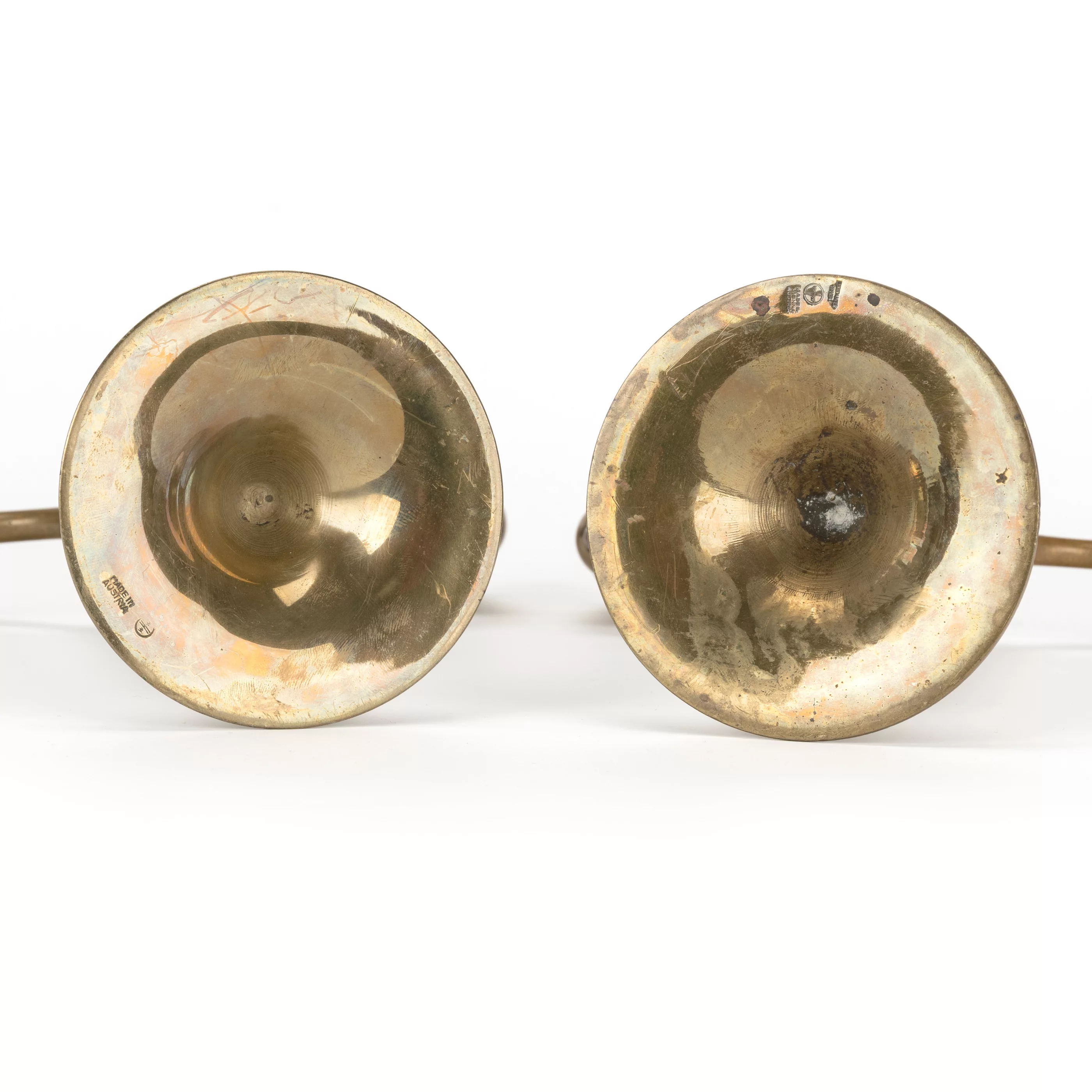 Österreich, Mitte 20 Jh., Entwurf von Karl Hagenauer (1898 Wien - 1956 ebenda) und hergestellt durch die 'Werkstätte Hagenauer', Messing, poliert, Höhe 23,5 cm, 1 Kerzenständer unterseitig bezeichnet 'Hagenauer Wien', jeweils unterseitig mit Manufakturmarke und bezeichnet 'Made in Vienna Austria', Zustand A/B, minimale Alters- und Gebrauchsspuren