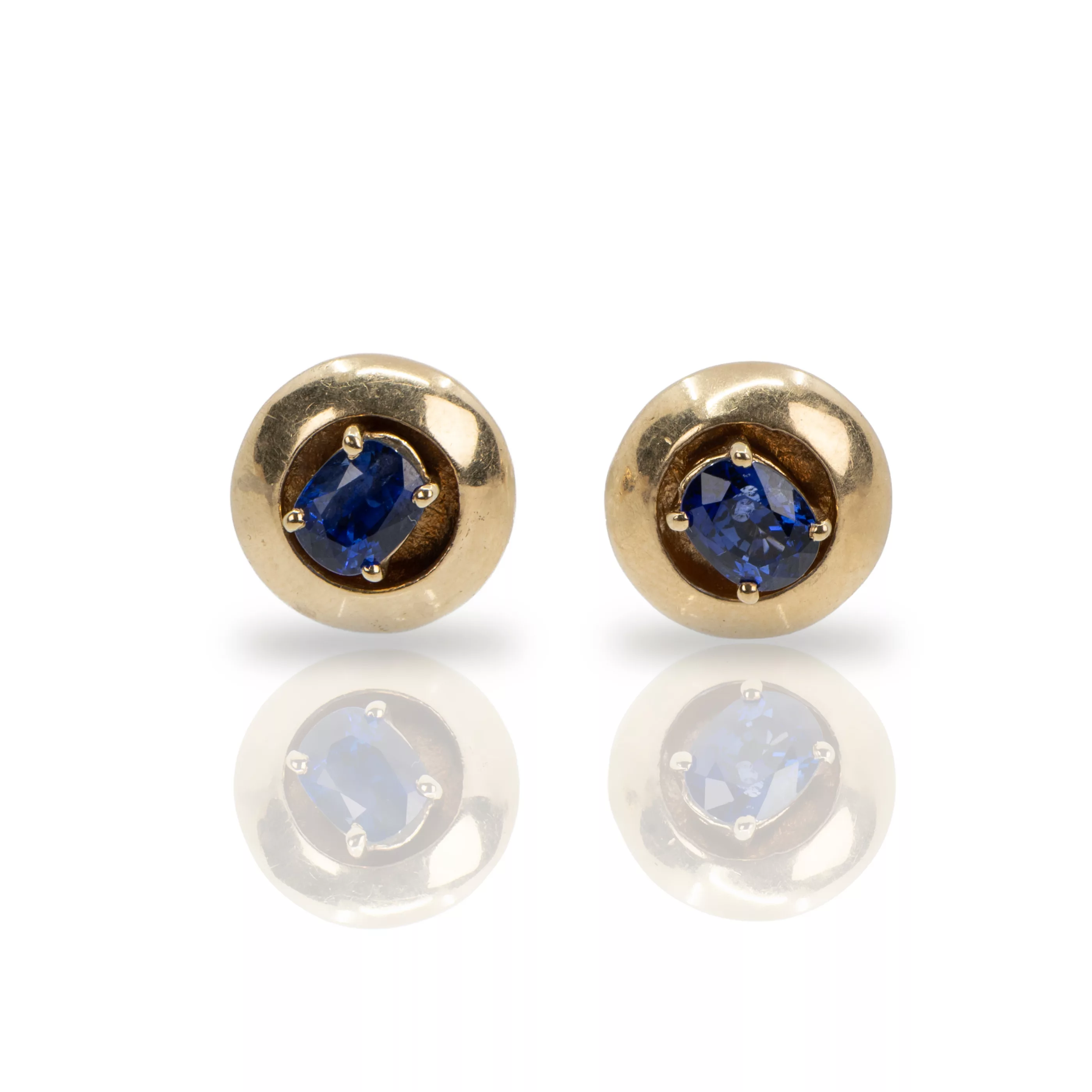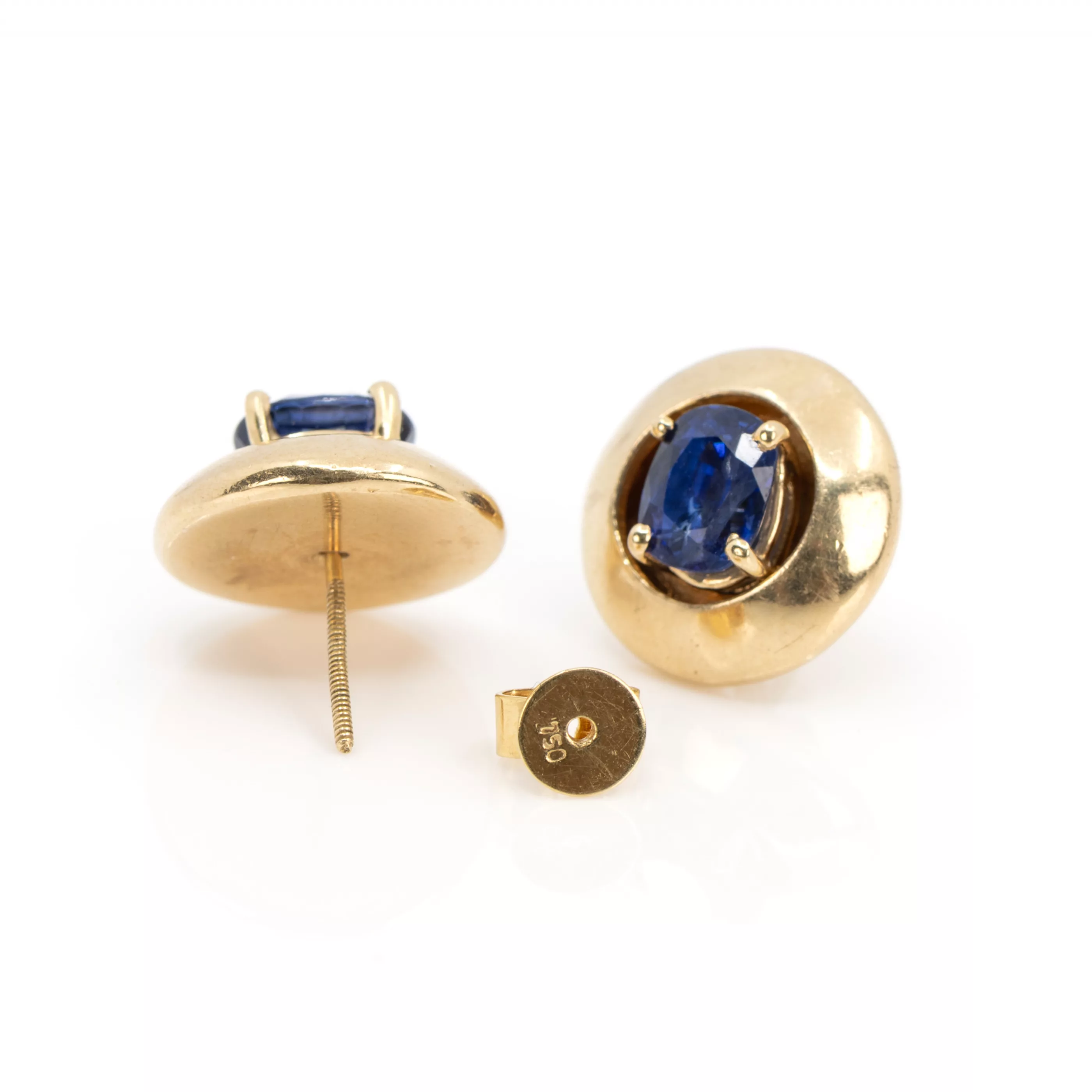 585 yellow gold, tested, each with 1 oval-cut sapphire, total approx. 1.75 ct, sapphires backed with removable gold discs, total weight approx. 6 g, clasps replaced, pin minimally bent