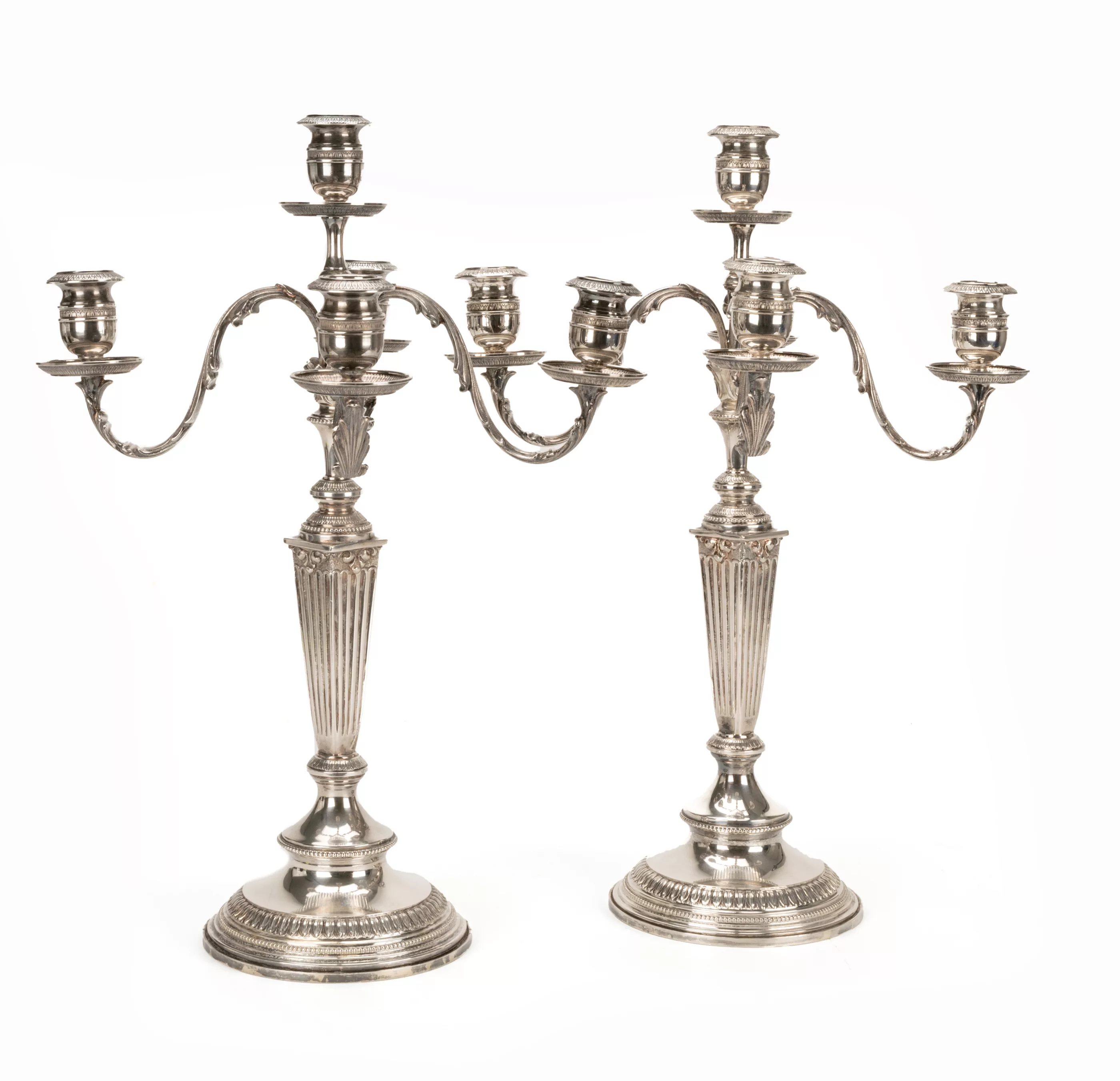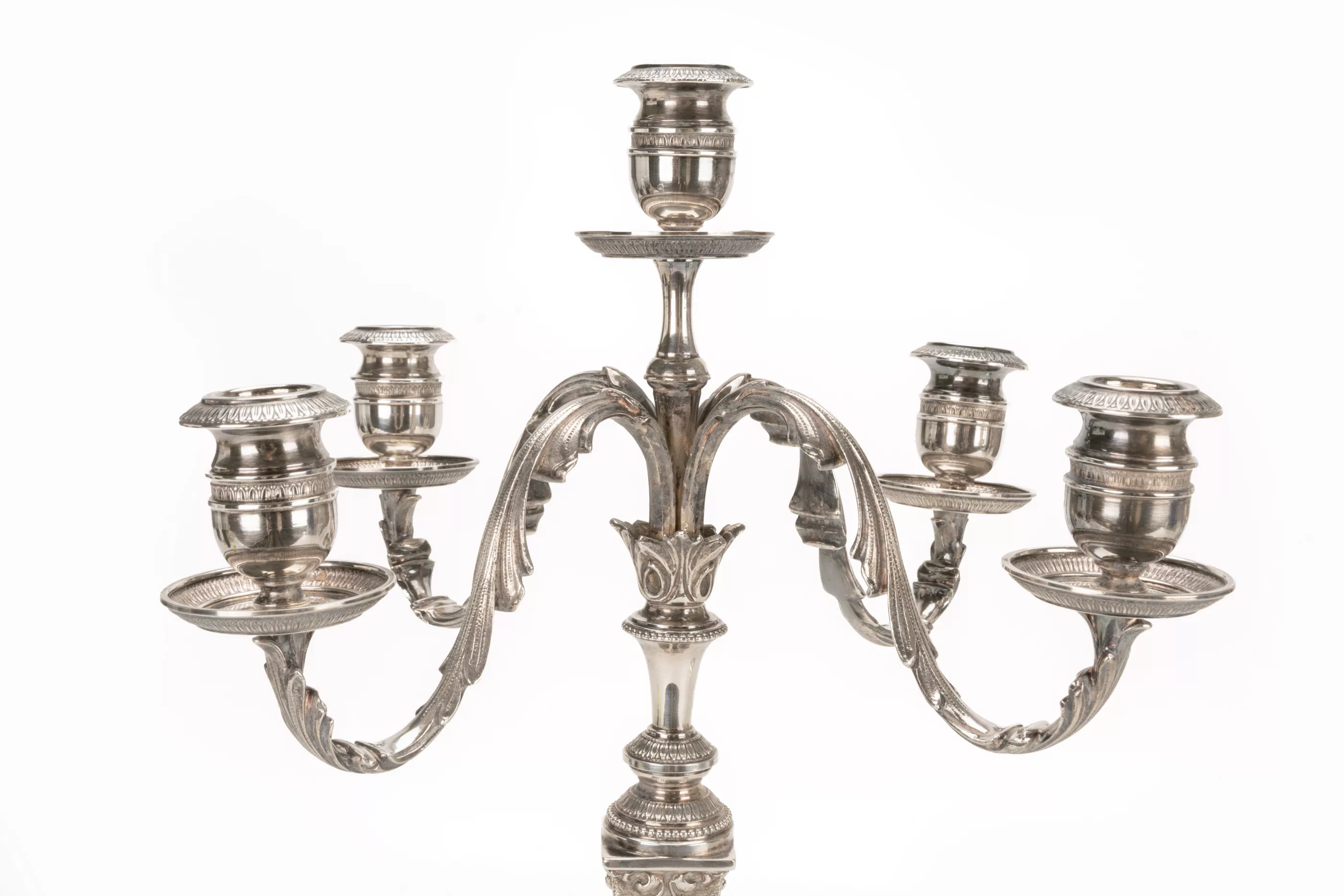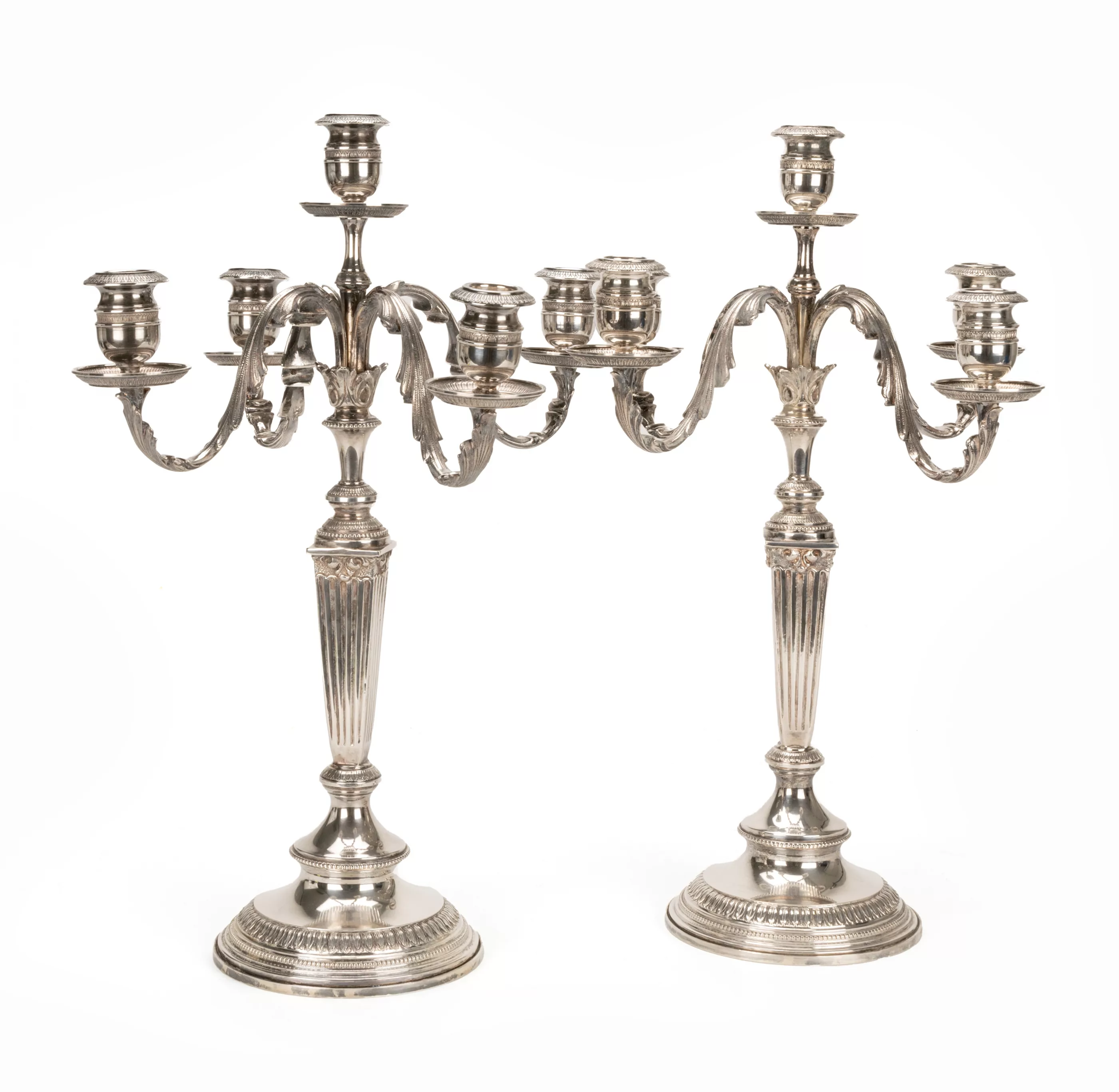 2-tlg., Italien, 1944-1968, 800 Silber, punziert, Feingehalt, Nummerierung und Buchstaben AP oder AB, jeweils 5-flammig, kannelierter Schaft auf rundem Stand, Palmetten- und Rocailledekor, verschraubte Tüllen, Höhe 43 cm, Gesamtgewicht ca. 3.040 g, partiell Tüllen minimal verbogen