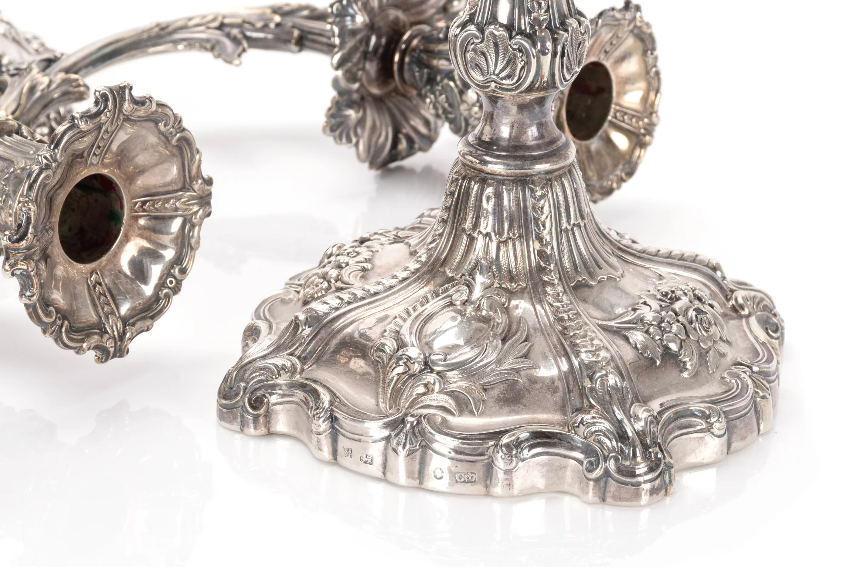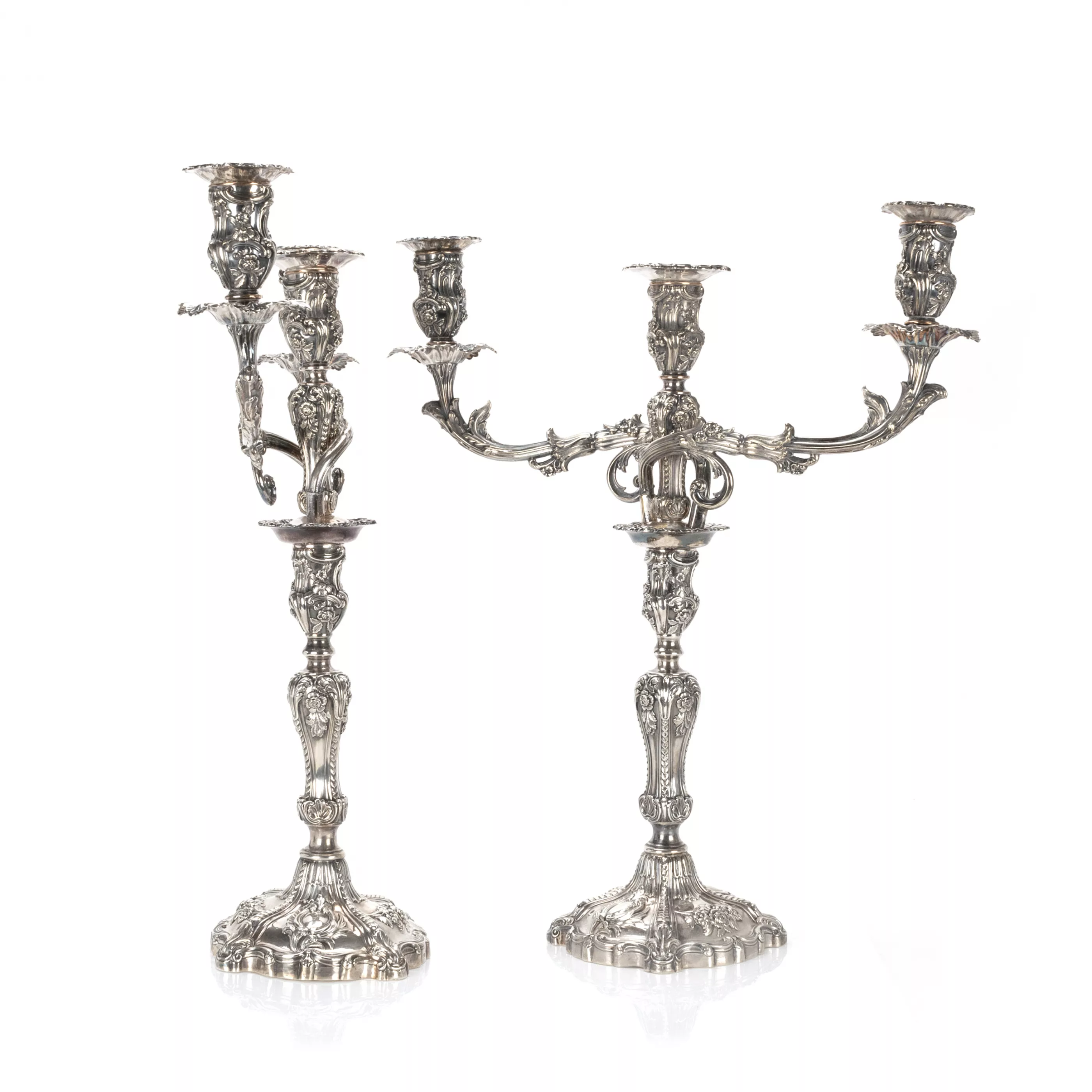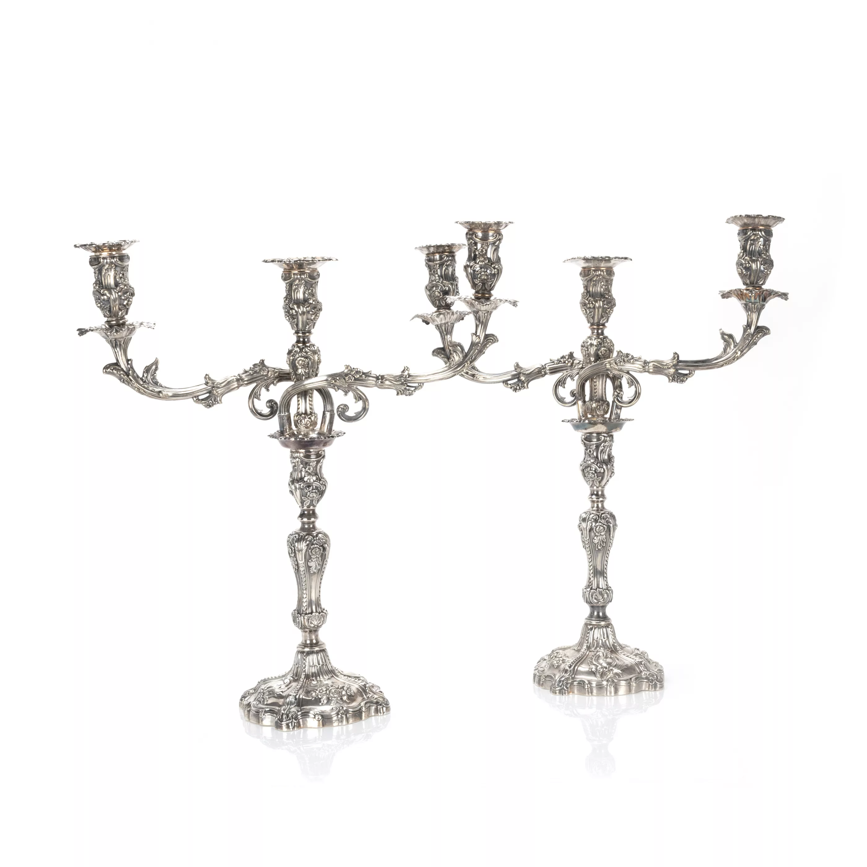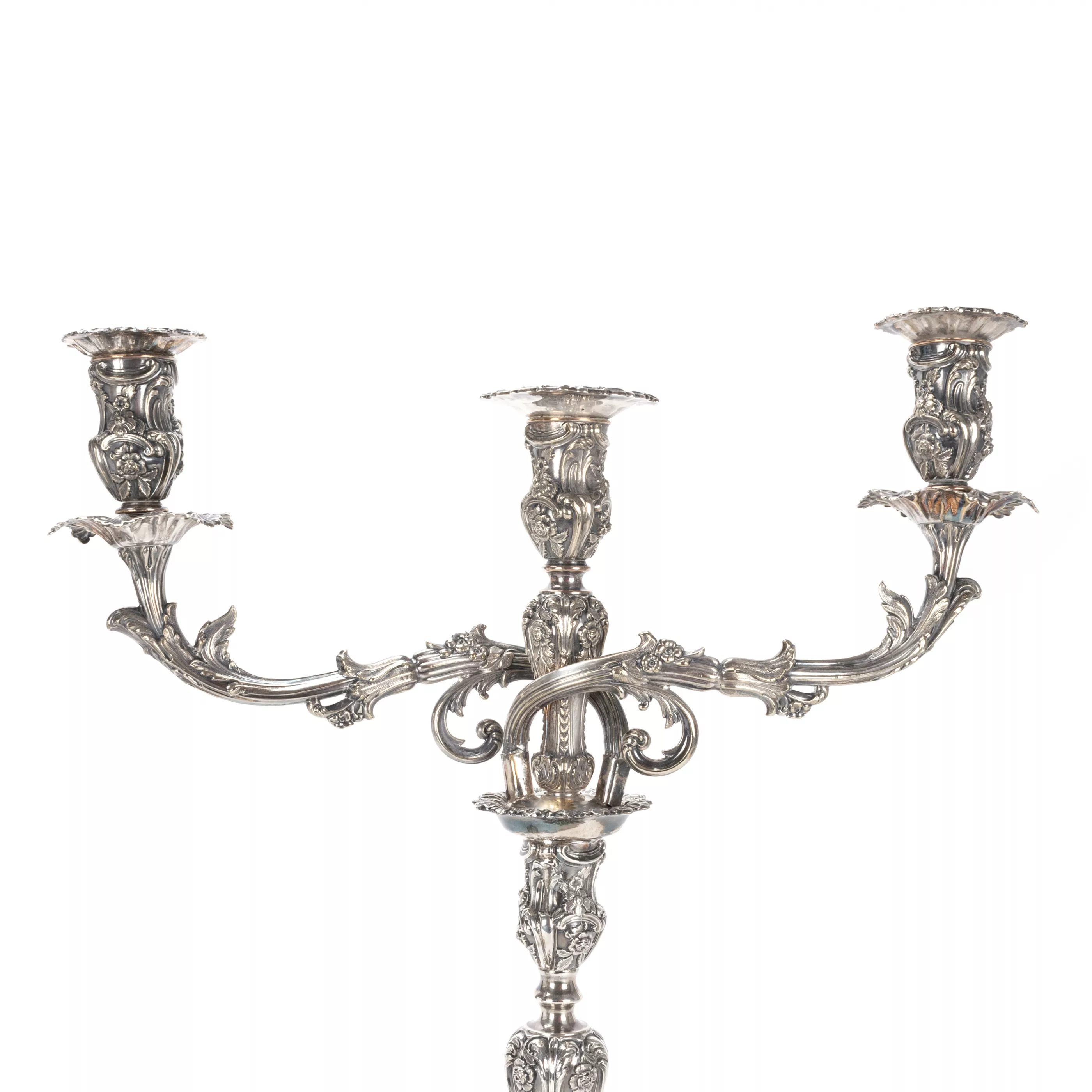 2-tlg., Sheffield, England, 1845/46, 925 Silber, punziert, Jahrespunze, Feingehalt, Queen Victoria Marke, Meisterpunze 'TINC', 3-flammiger Aufsatz versilbert und später ergänzt, quadratische, passige Füße, mehrfach getreppt ansteigend mit gewölbtem Balusterschaft, reich verziert mit Rocaillen, Muscheln und Blumenschmuck, Wappenkartuschen am Fuß mit schwer leserlichen Initialen, Tüllen abnehmbar, sodass der Kandelaber auch einflammig aufgestellt werden kann, Höhe 49 - 51 cm, Breite ca. 45 cm, Gesamtgewicht (gefüllt) ca. 2.300 g, partiell leicht verbogen, leichte Alters- und Gebrauchsspuren