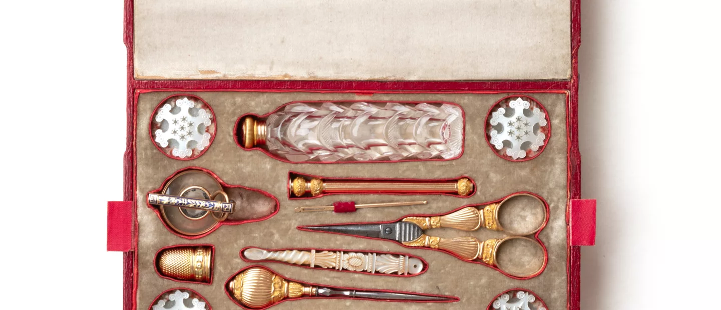 Nécessaire à Couture mit Nähutensilien, Bleistift, Lupe und Flakon: Frankreich, erste Hälfte 19. Jh., bestehend aus Nähutensilien,...