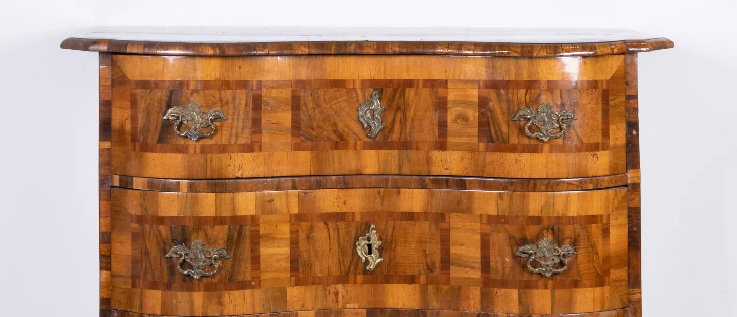 Barockkommode: wohl Deutschland, 18 Jh., Nussbaum auf Weichholz furniert, Messingbeschläge späteren Datums, geschwungene Kommode mit...