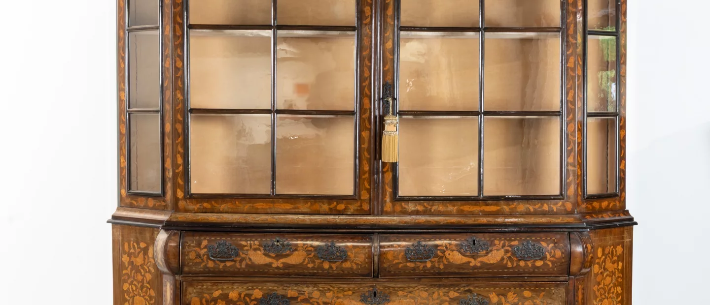Bombé-Vitrinenaufsatzsschrank: Niederlande, Mitte 18. Jh., Eiche, diverse intarsierte Hölzer, bombierter und eingezogener...