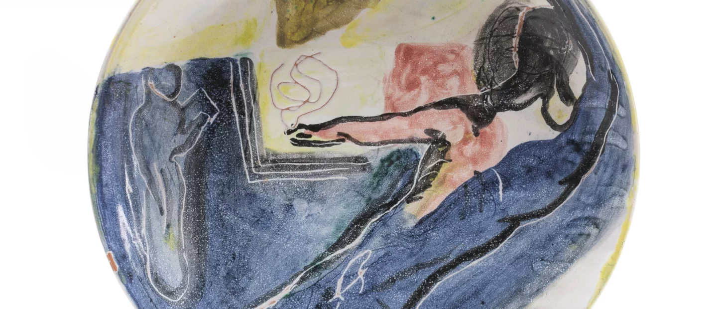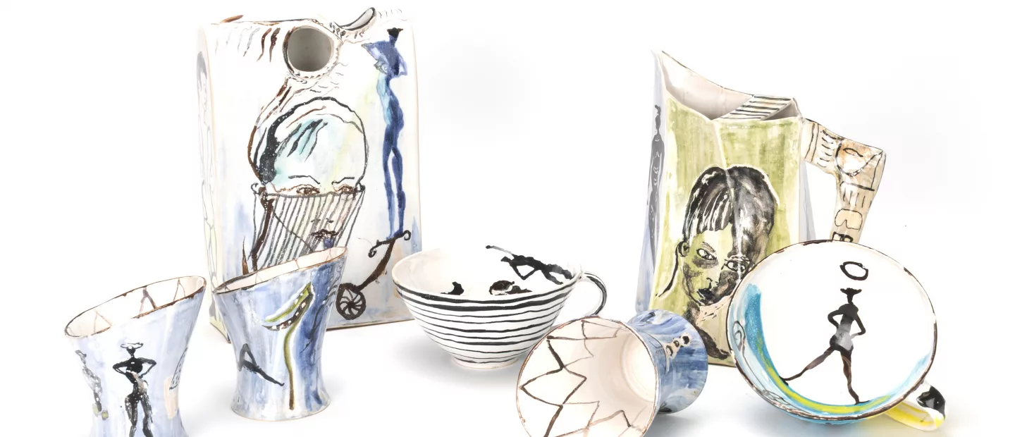 Künstlerservice von Cornelia Schleime: 7-tlg., Entwurf von Cornelia Schleime (1953 Berlin), Keramik polychrom bemalt, 1 Kanne H 19,5...