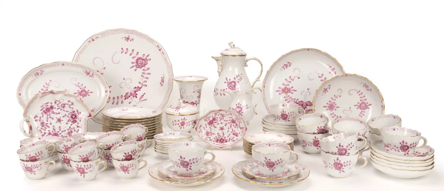 Meissen Kaffee- und Mokkaservice 'Indisch Purpur': 82-tlg., Meissen, 2. Hälfte 20. Jh., Porzellan, weiß, purpurfarben bemalt und...